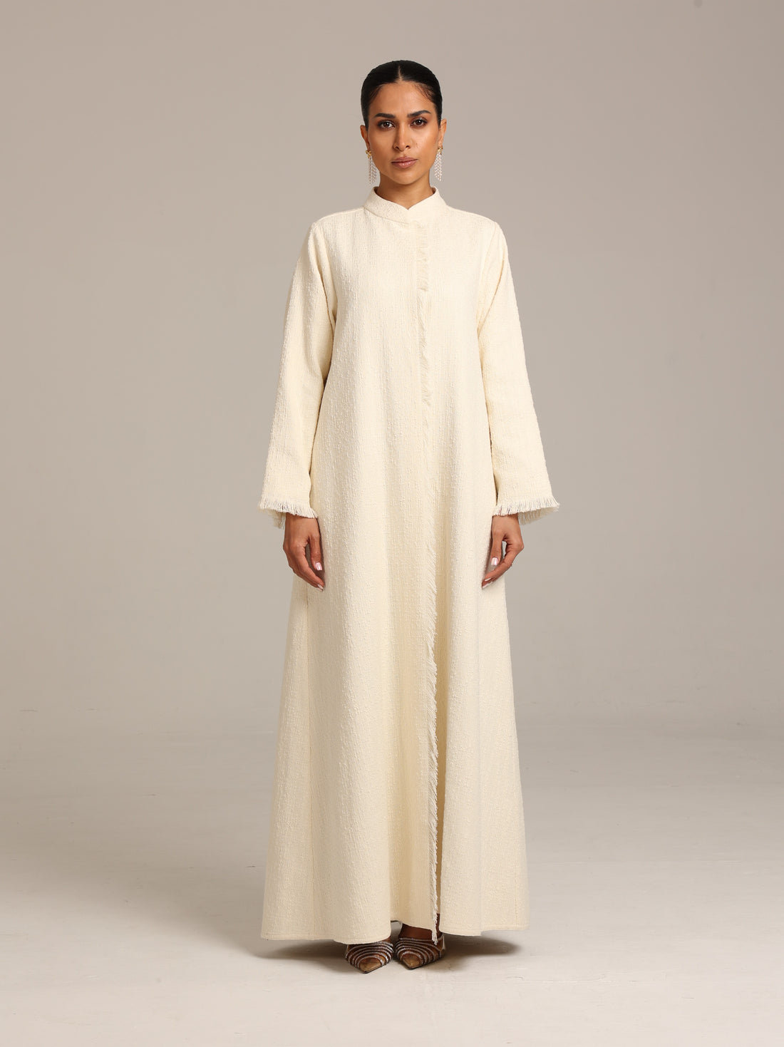 The luxurious European fabric abaya in an elegant summer beige color, adorned with specially designed...