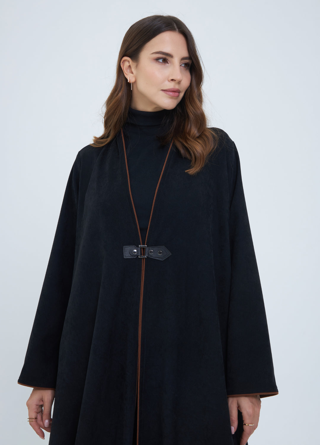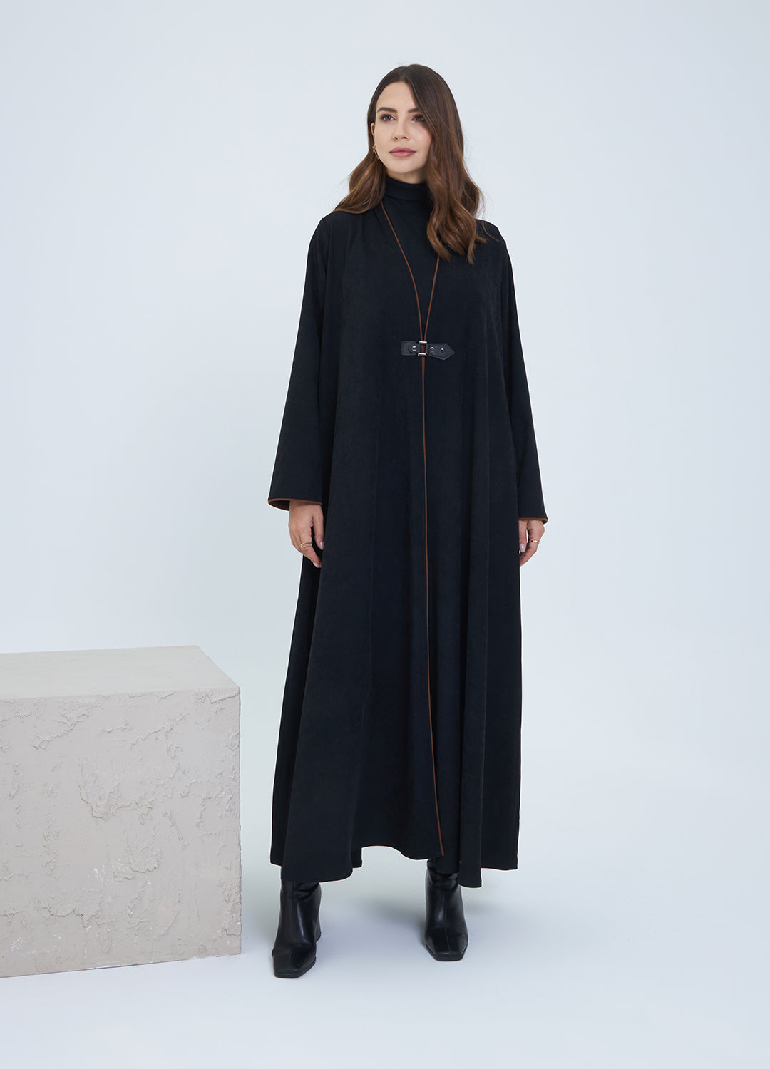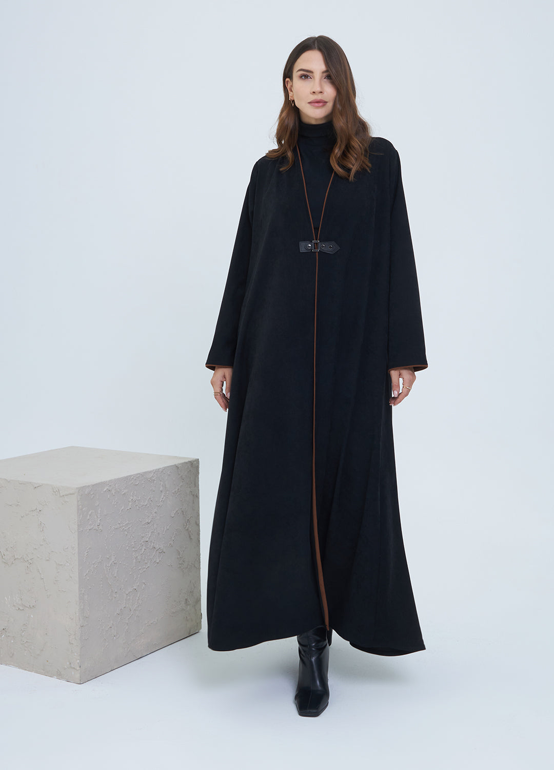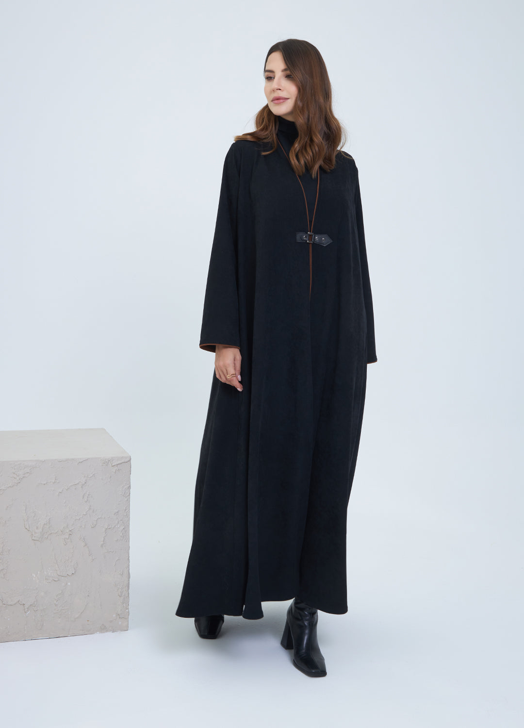 عباية من قماش الشامواه الفاخر , بقصة رائعة و مغلقة باكسسوار جلد أنيق من مجموعة خريف و شتاء هذا الموسم
