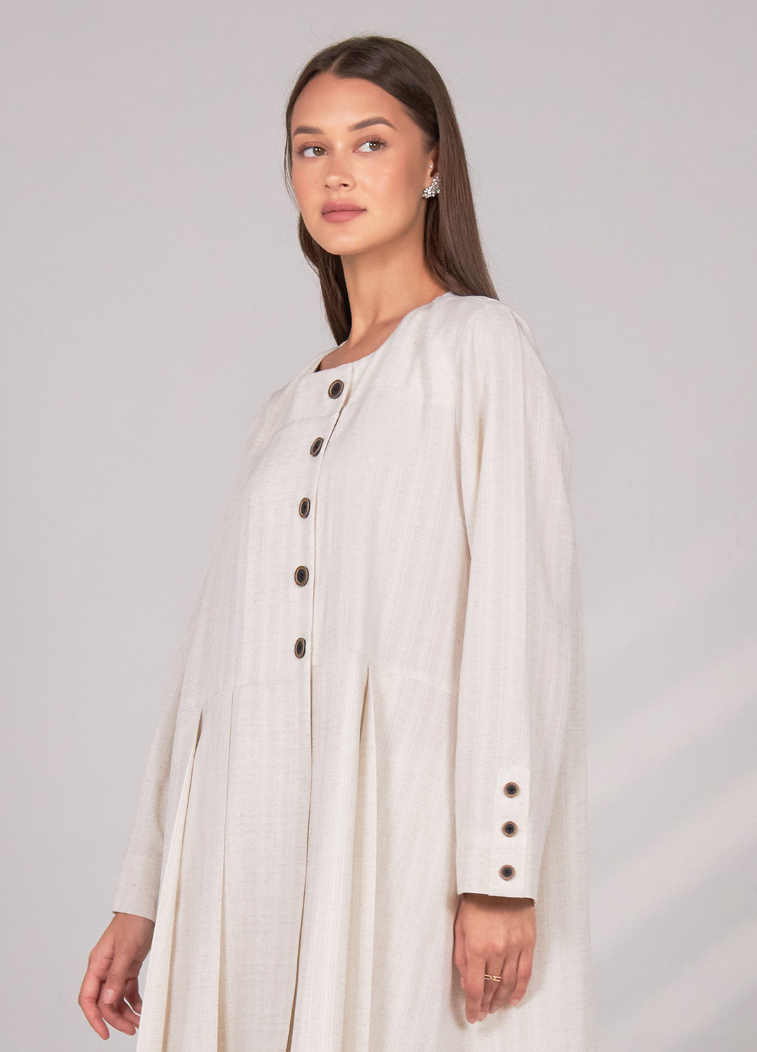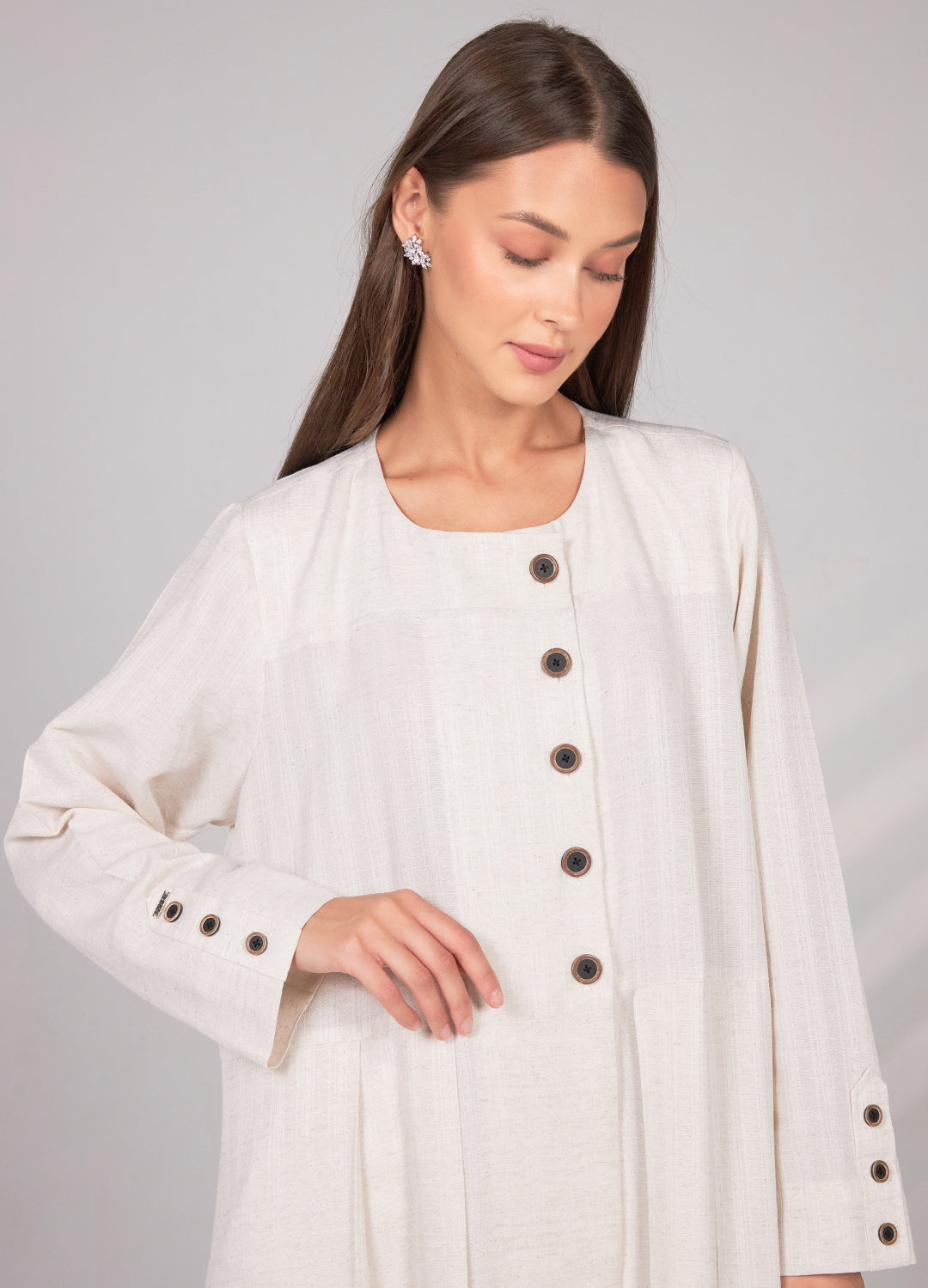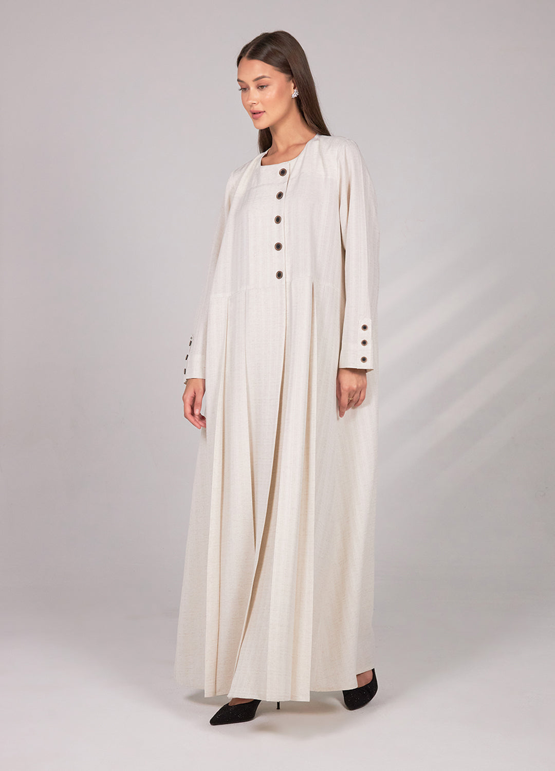 Beige soft linen abaya made of linen fabric mixed with viscose.