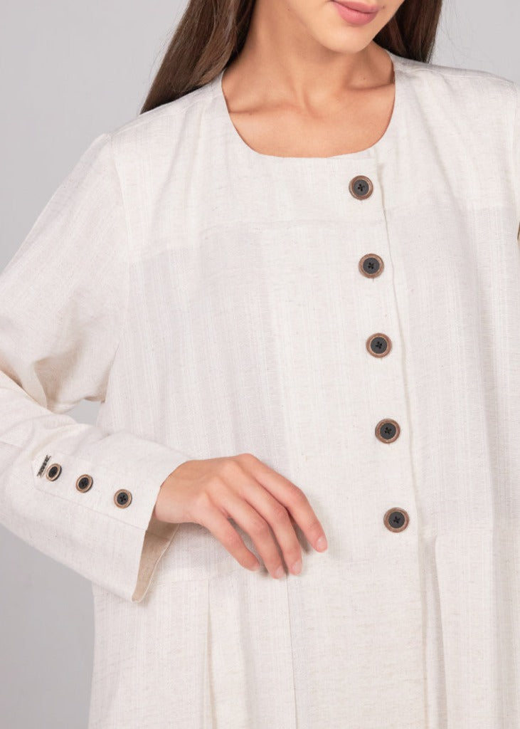 عباية من قماش اللينن المخلوط بالقطن الرائع ذو جودة عالية ، بقصة جانبية و أزرار خشبية و جيب جانبي لتكون عباية باردة و عملية مريحة ، تحمل روح اللينن الطبيعي لكنها لا تتكسر ، مثالية للسفر و العمل و الجامعة