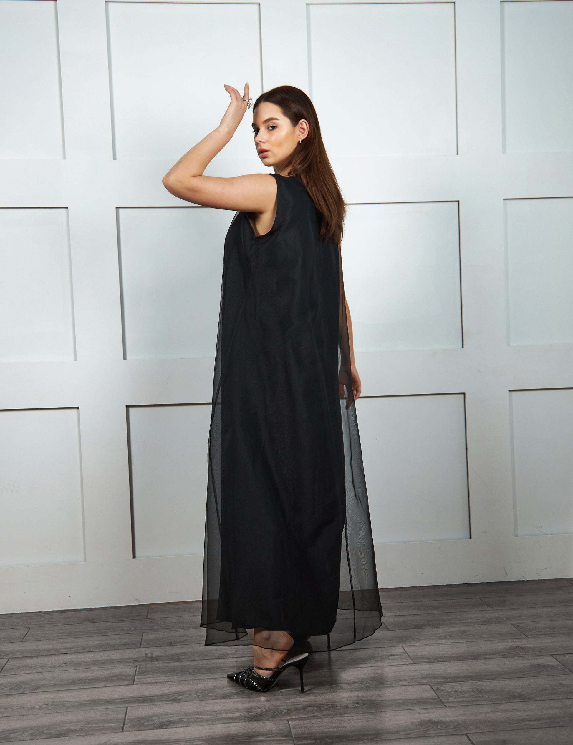 فستان طبقات من قماش الأورجانزا الفاخر , اللون اللأسود اختاريها بكم طويل أو كم قصيرأو بدون كم