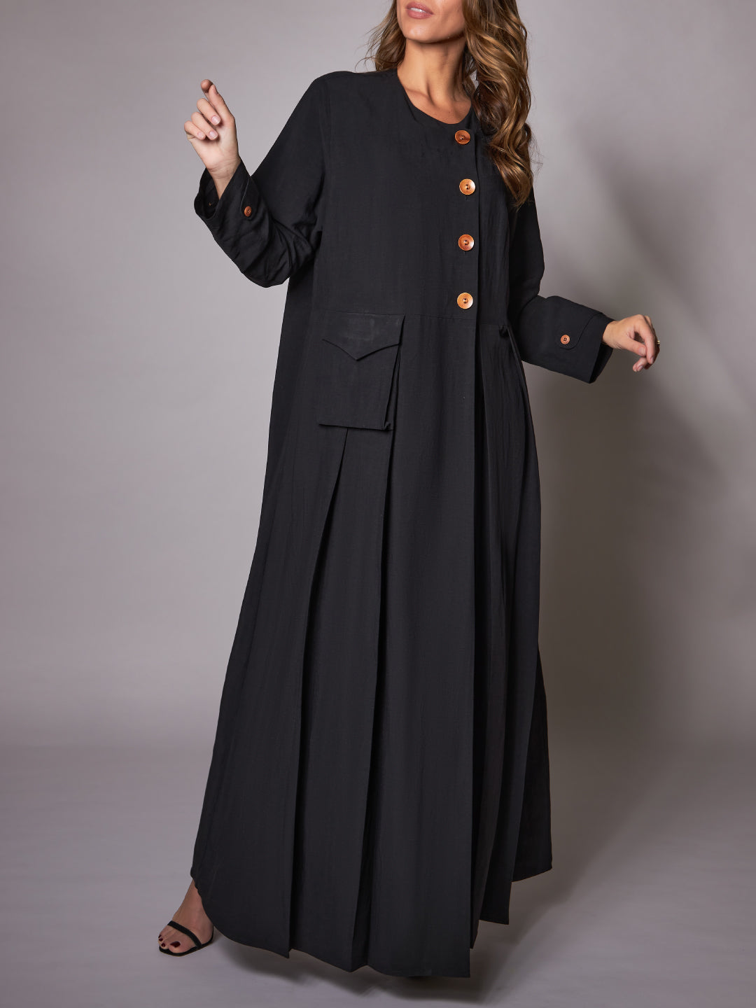 عباية من قماش اللينن المخلوط بالقطن الرائع بقصة جانبية و أزرار خشبية و جيب جانبي و اسوارة كم ضيقة لتكون عباية باردة و عملية مريحة مثالية للسفر و العمل و الجامعة ،