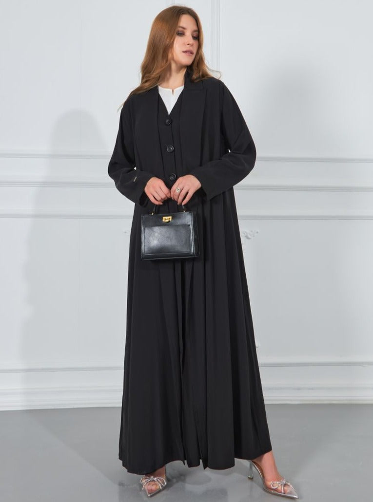 عباية من القماش الفاخرة, يضاف لها قطعة داخلية بأزرار أنيقة مختارة بعناية وياقة جاكيت خارجية.