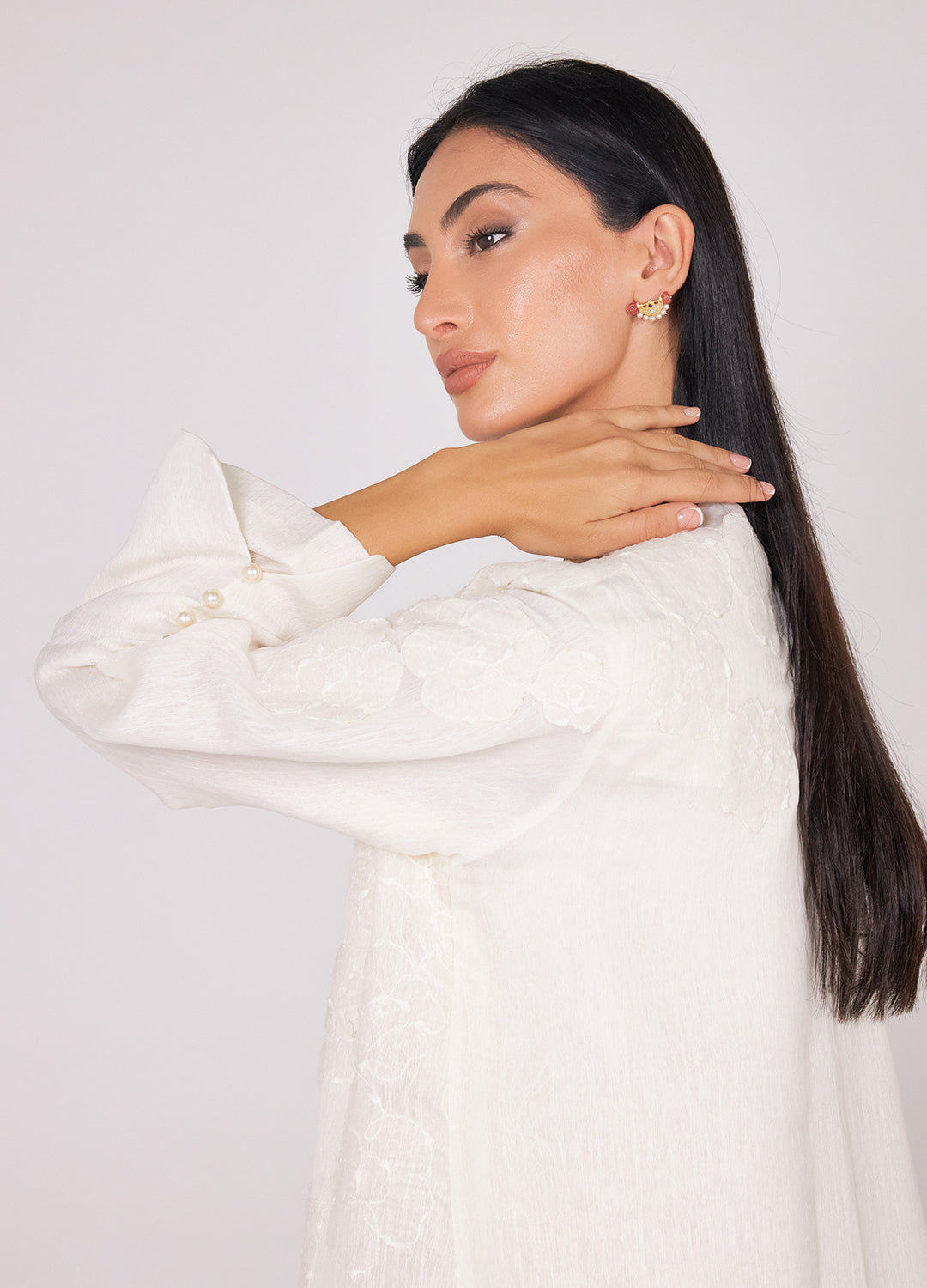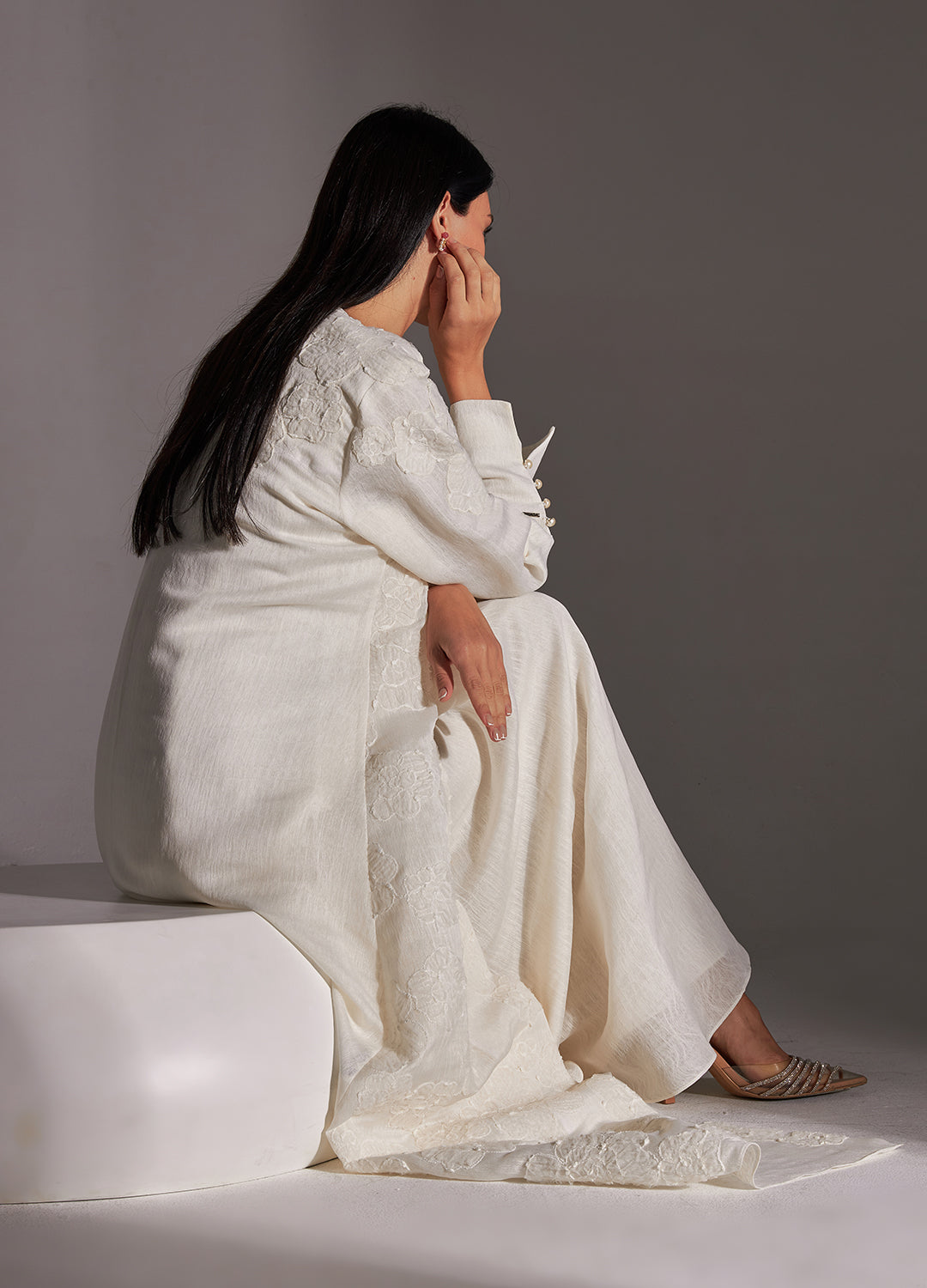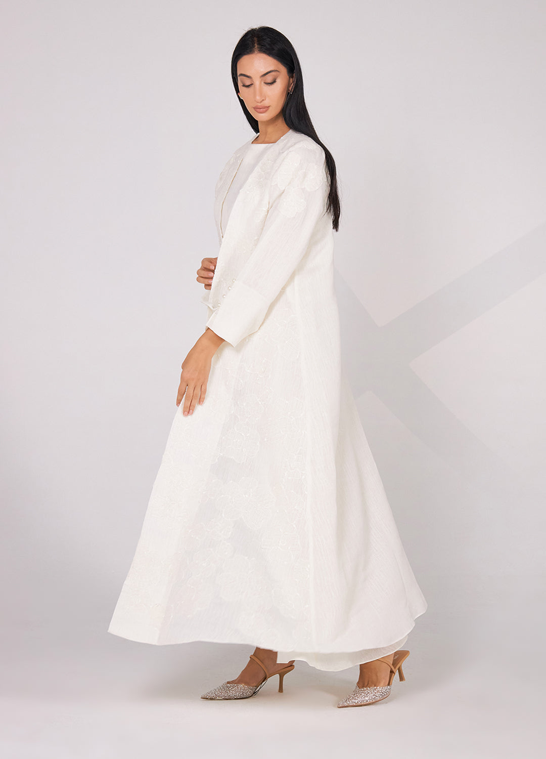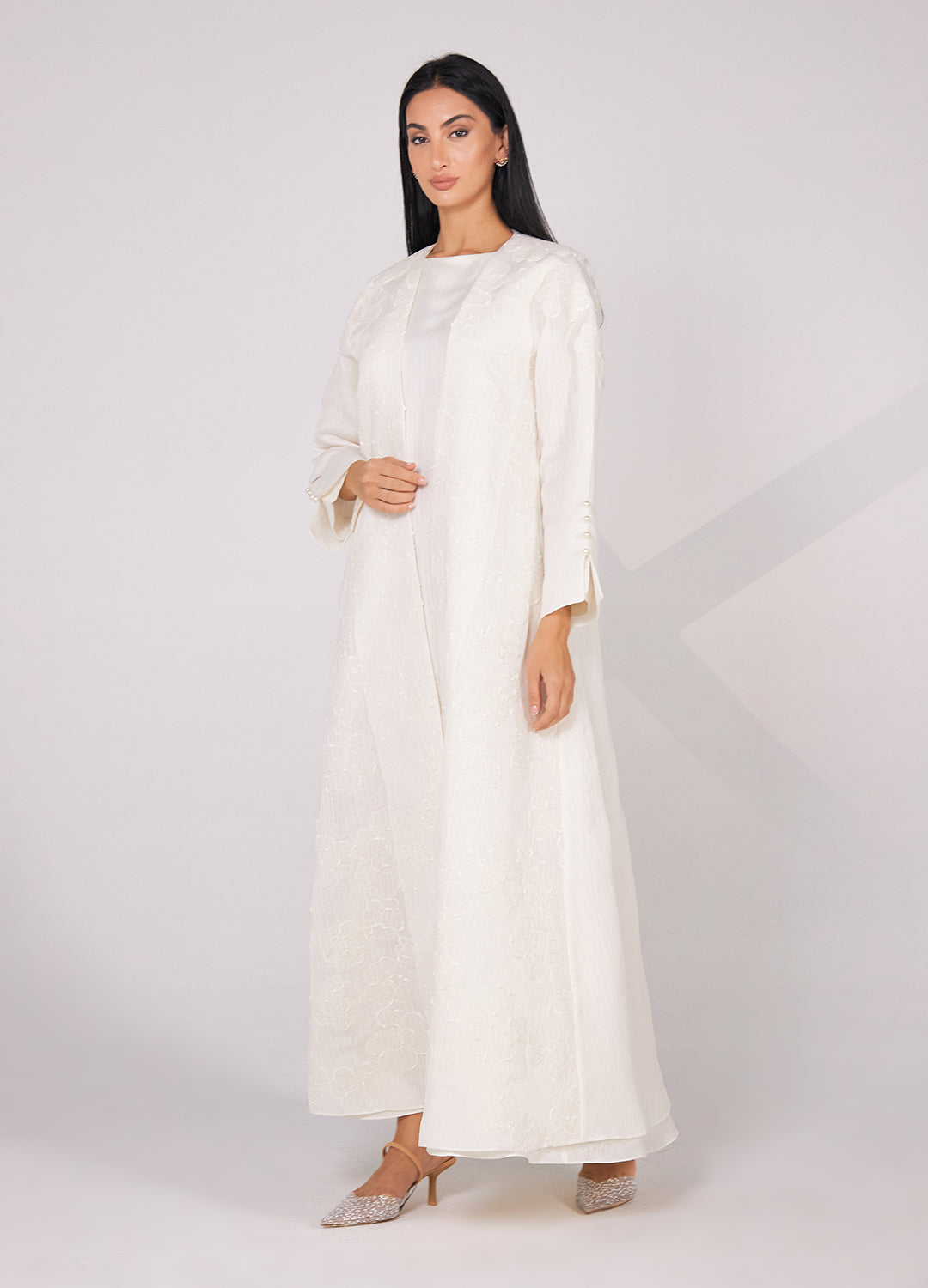 عباية من قماش الأورجانزا الفاخر المطرز بالورود , مع فستان داخلي بكم طويل أو بدون كم حسب اختيارك , و لأن الأورجانزا تشف قليلاً فضلنا أن تختاري القطعة الداخلية بكم طويل و يمكنك اختيارها بدون كم حسب الرغبة