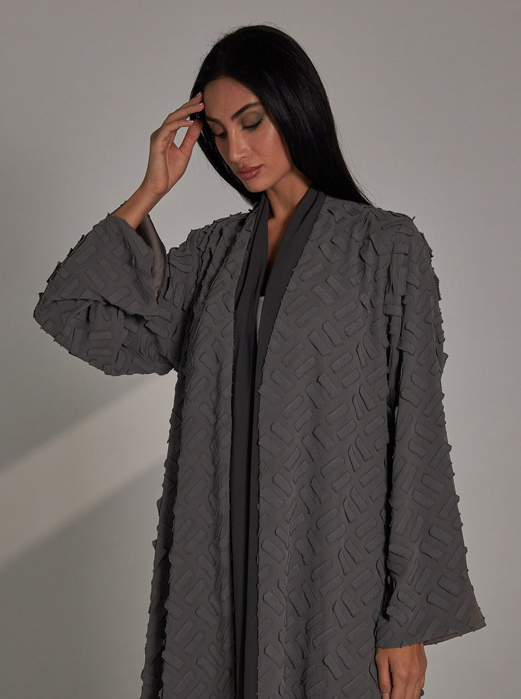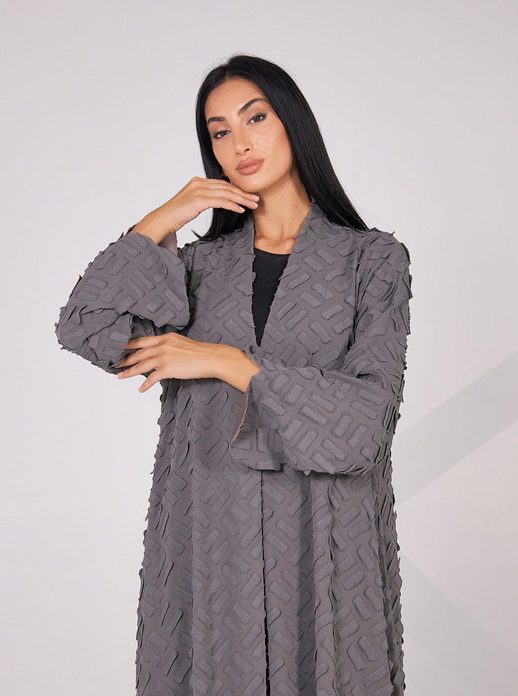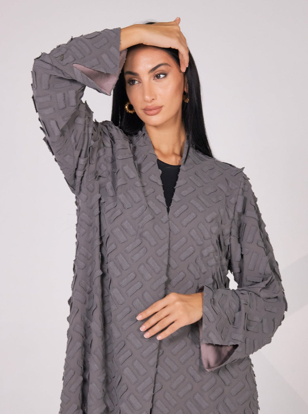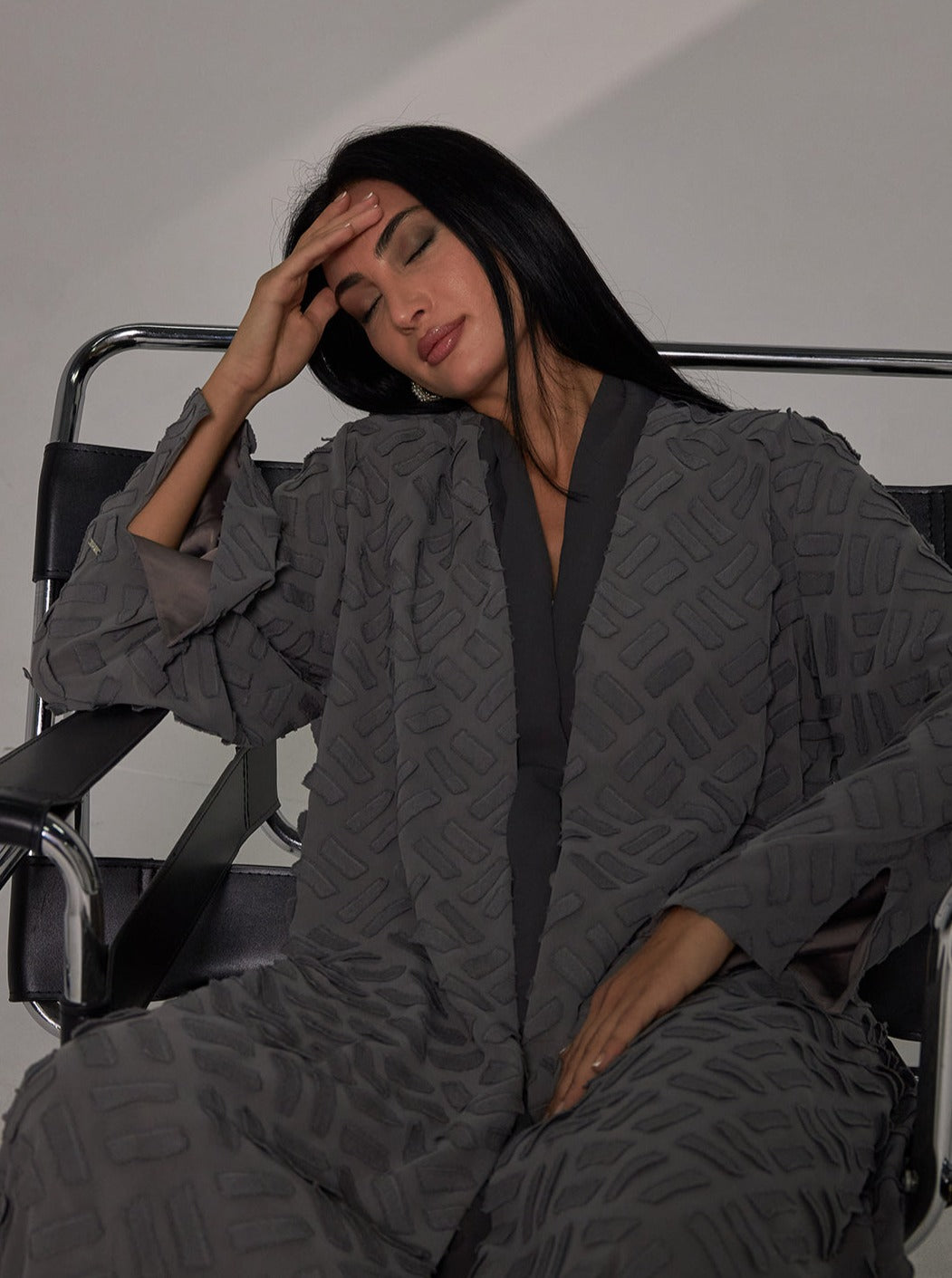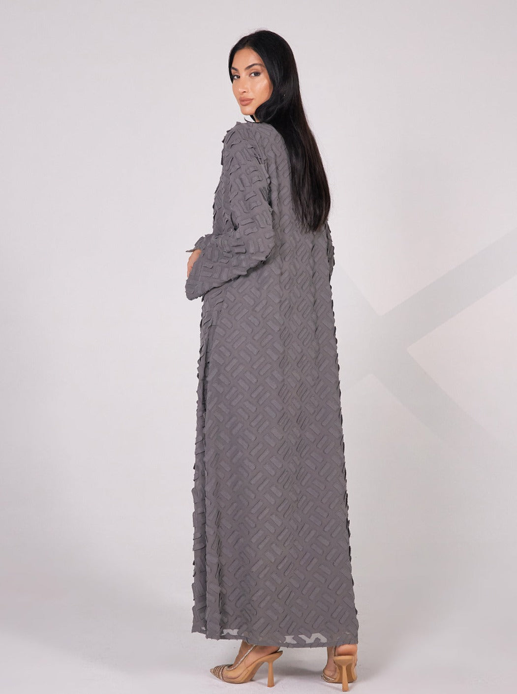 a luxurious chiffon abaya, adorned with rectangular patches and lined with satin silk, showcasing an elegant cut from the Ramadan and Eid 2024 collection.