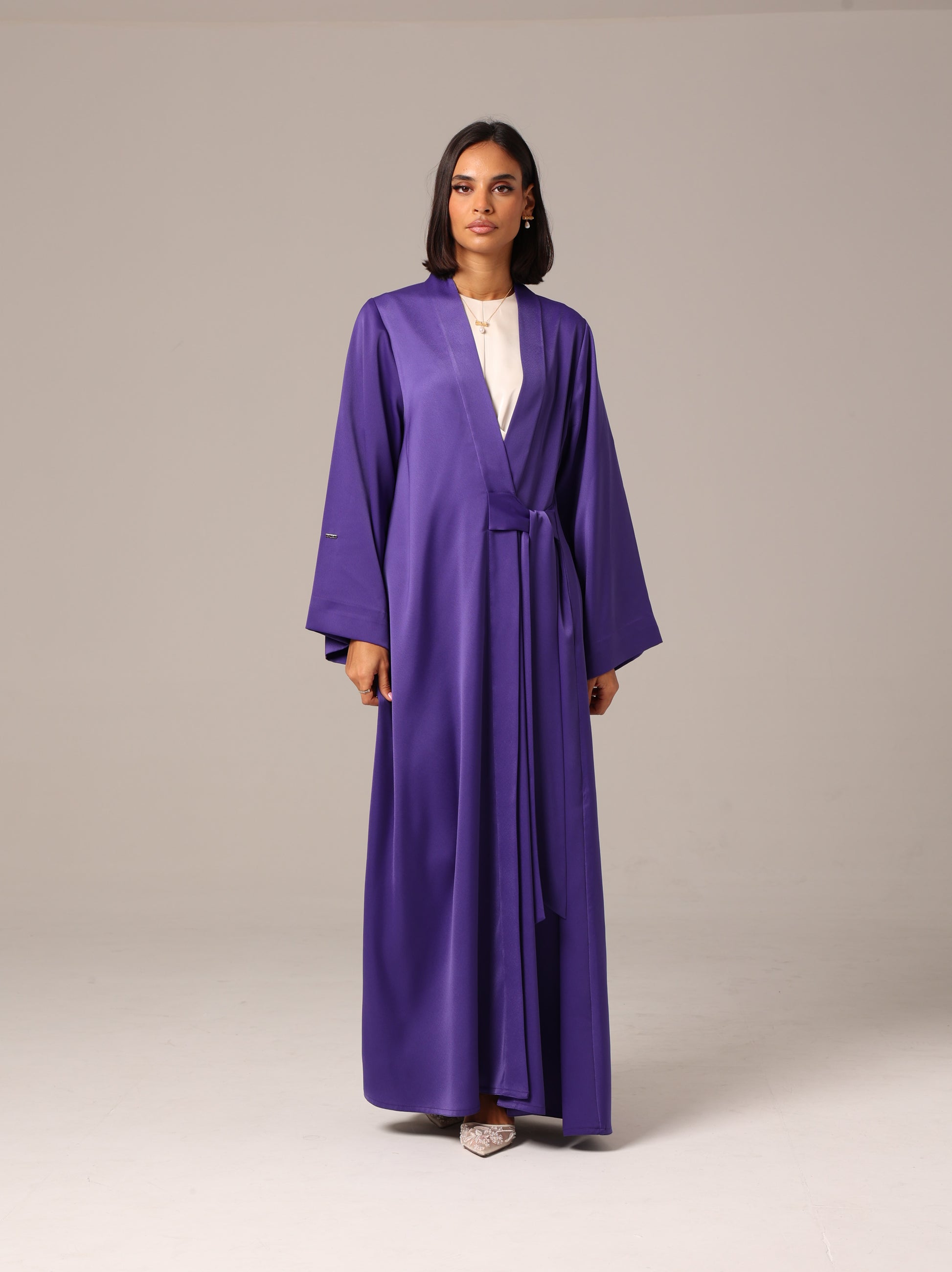 This abaya is crafted from the finest, Satin fabric, exuding a sense of opulence. It features an elegant Abaya with a kimono cut and a long side tie.