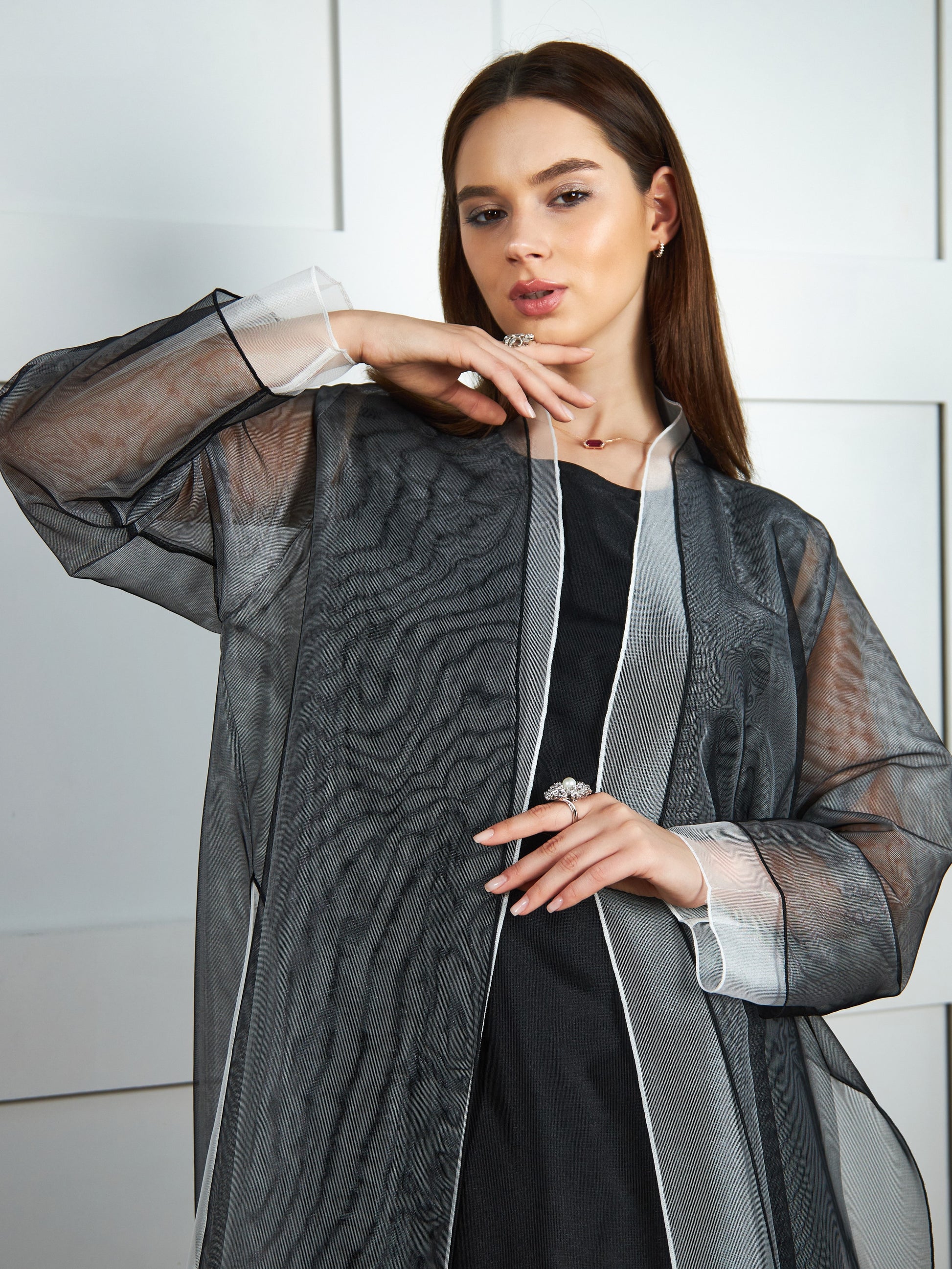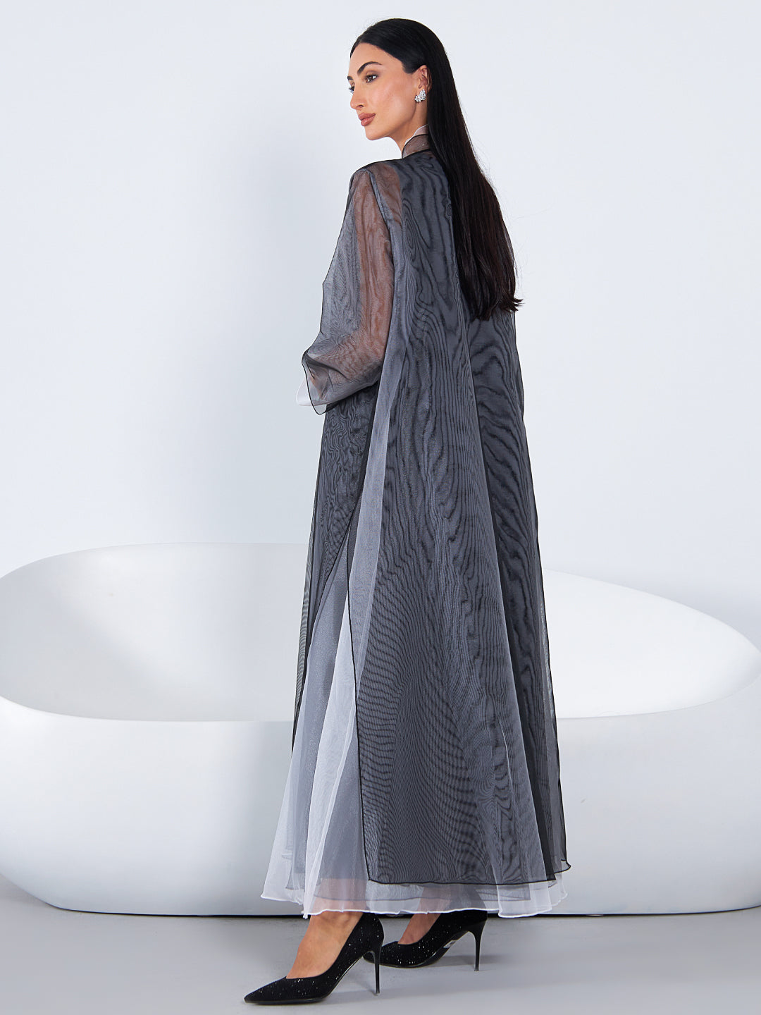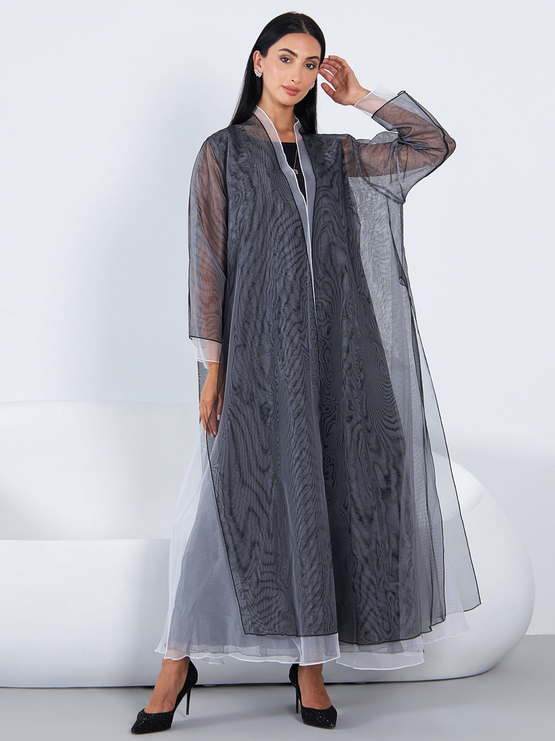 Naomi is a blend of ethereal femininity and sophistication. The A-line double-layered black and white luxury organza abaya, with inner dress motif, gives a dramatic appeal.