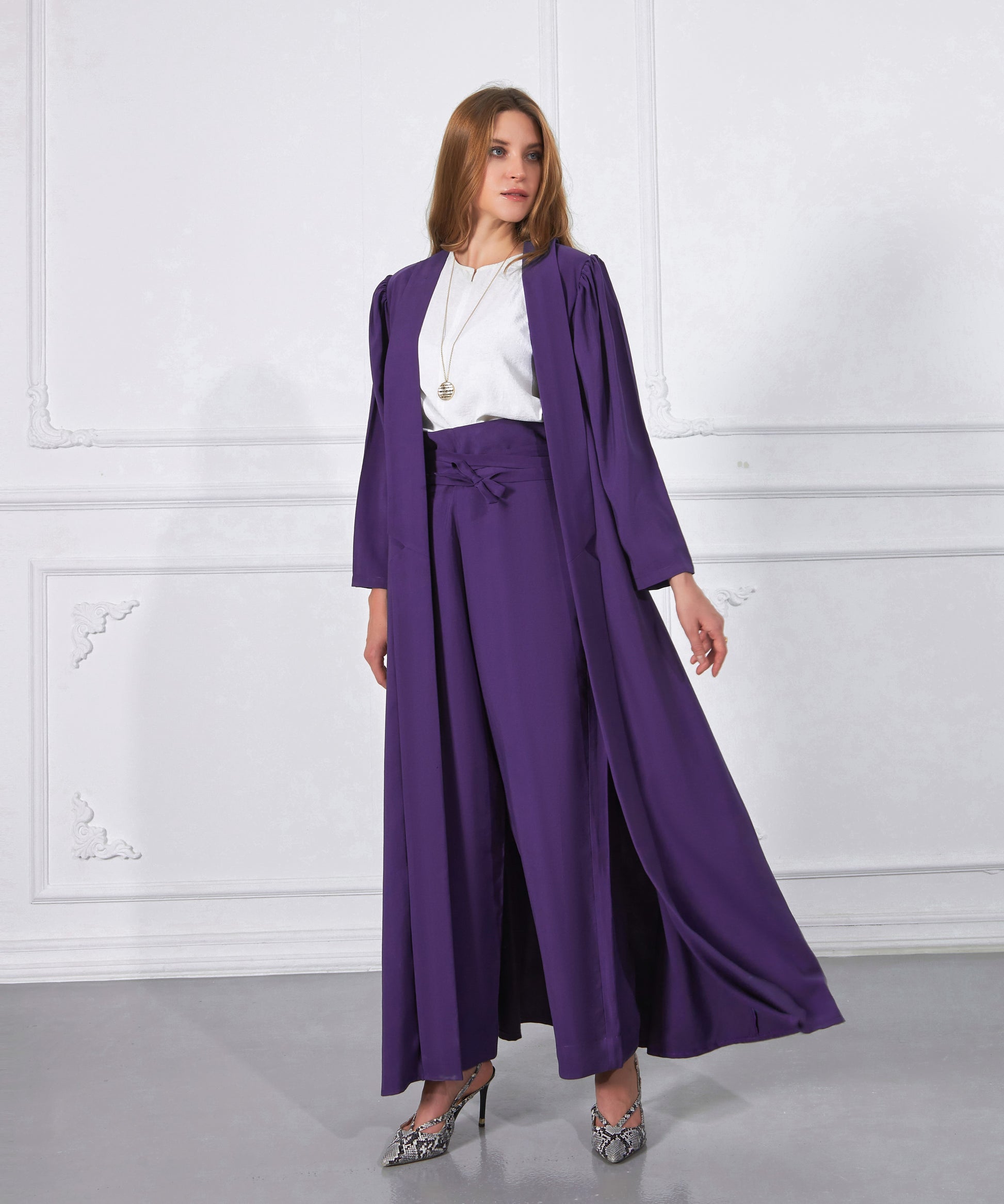 عباية عصرية رائعة من قماش التنسل الفاخر بلون بنفسجي خاطف للقلب من الجمال بقصة كتف مميزة مع بنطلون بقصة أنيقة و حزام مميز رفيع و ناعم من قماش التنسل,