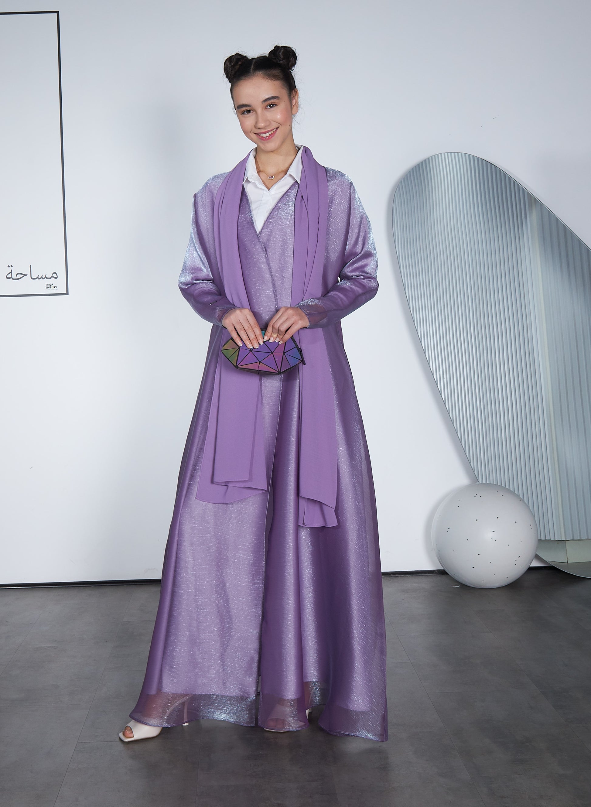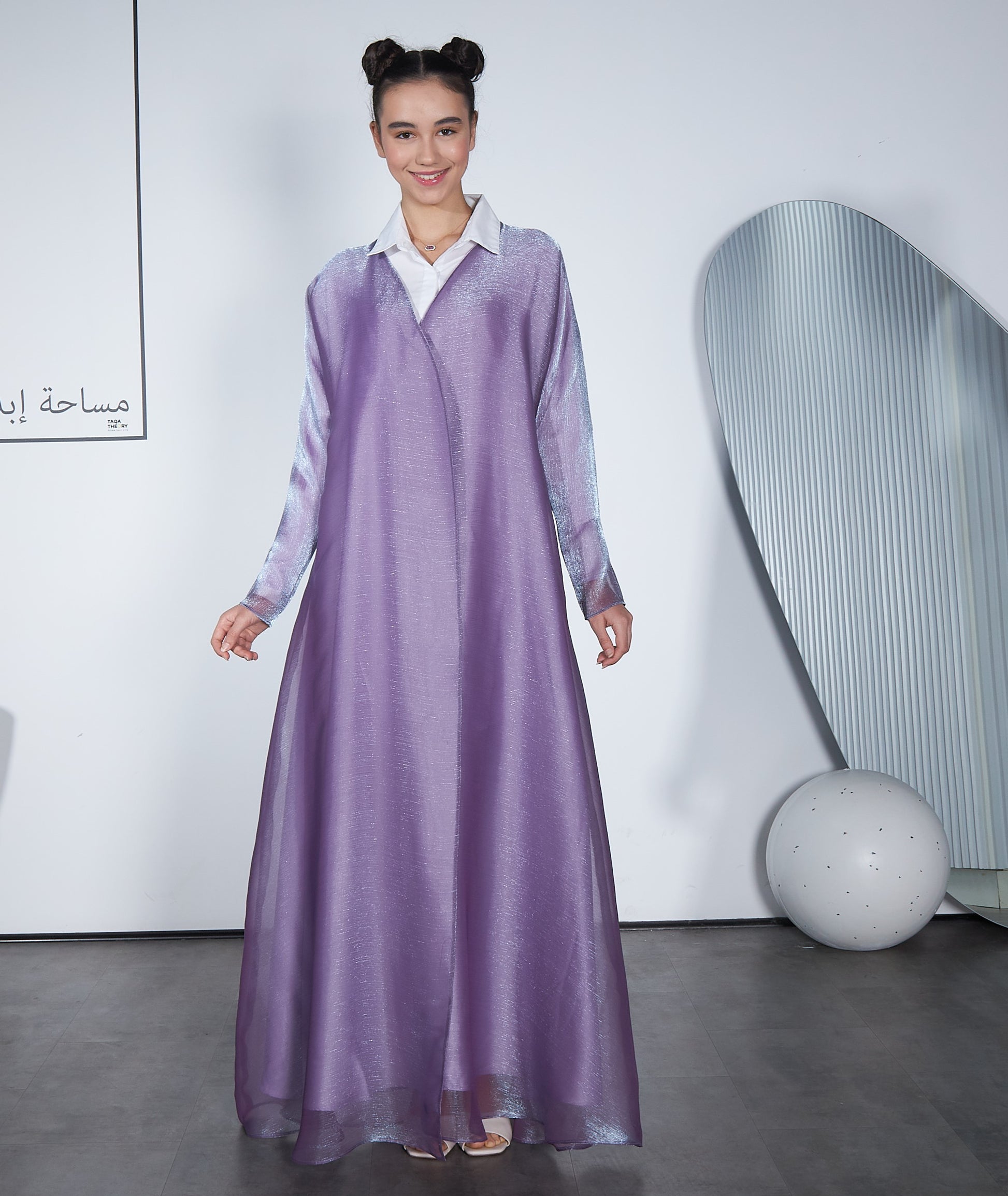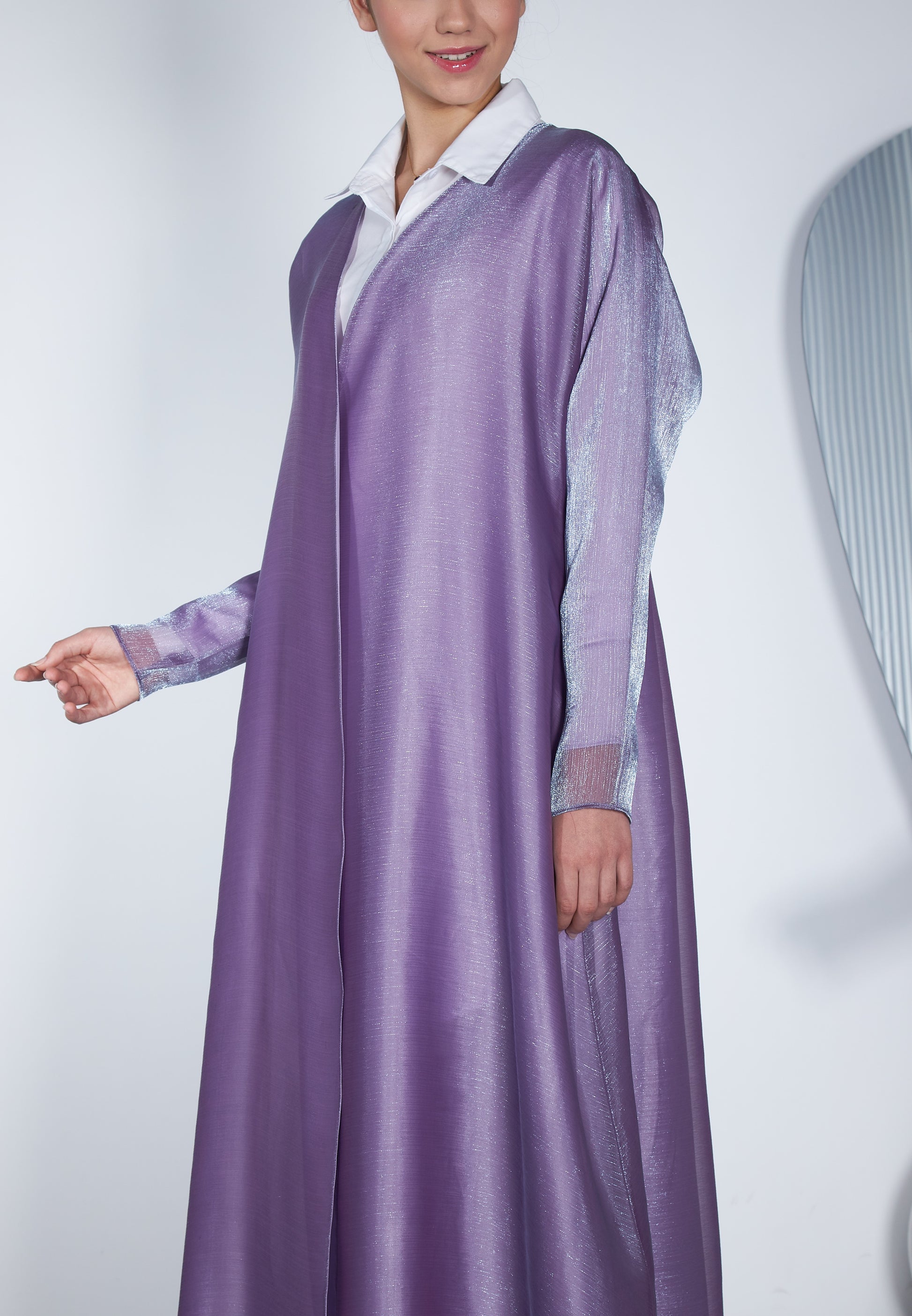 Abaya made of thin organza fabric lined with satin, with modern details and Violet color