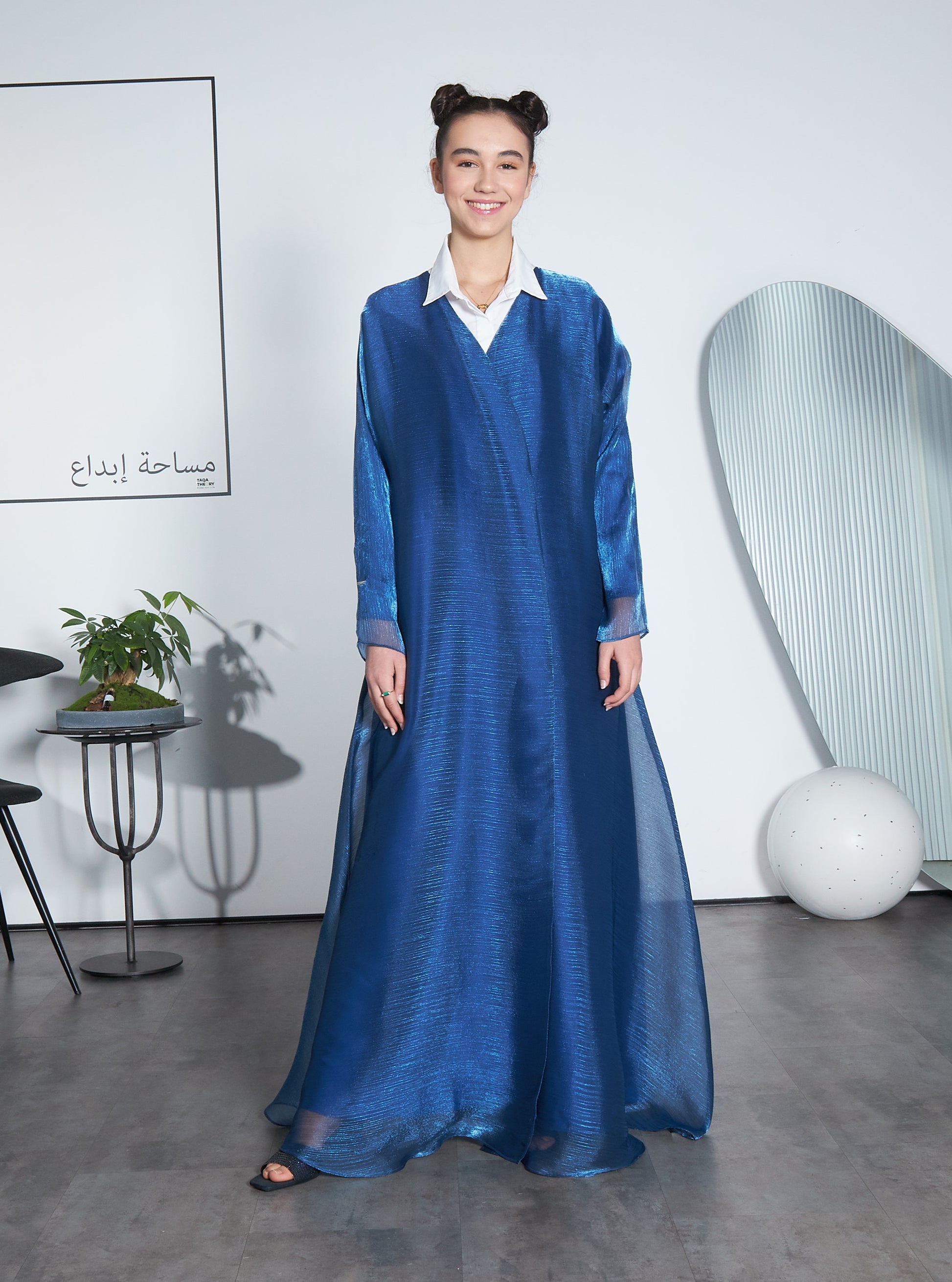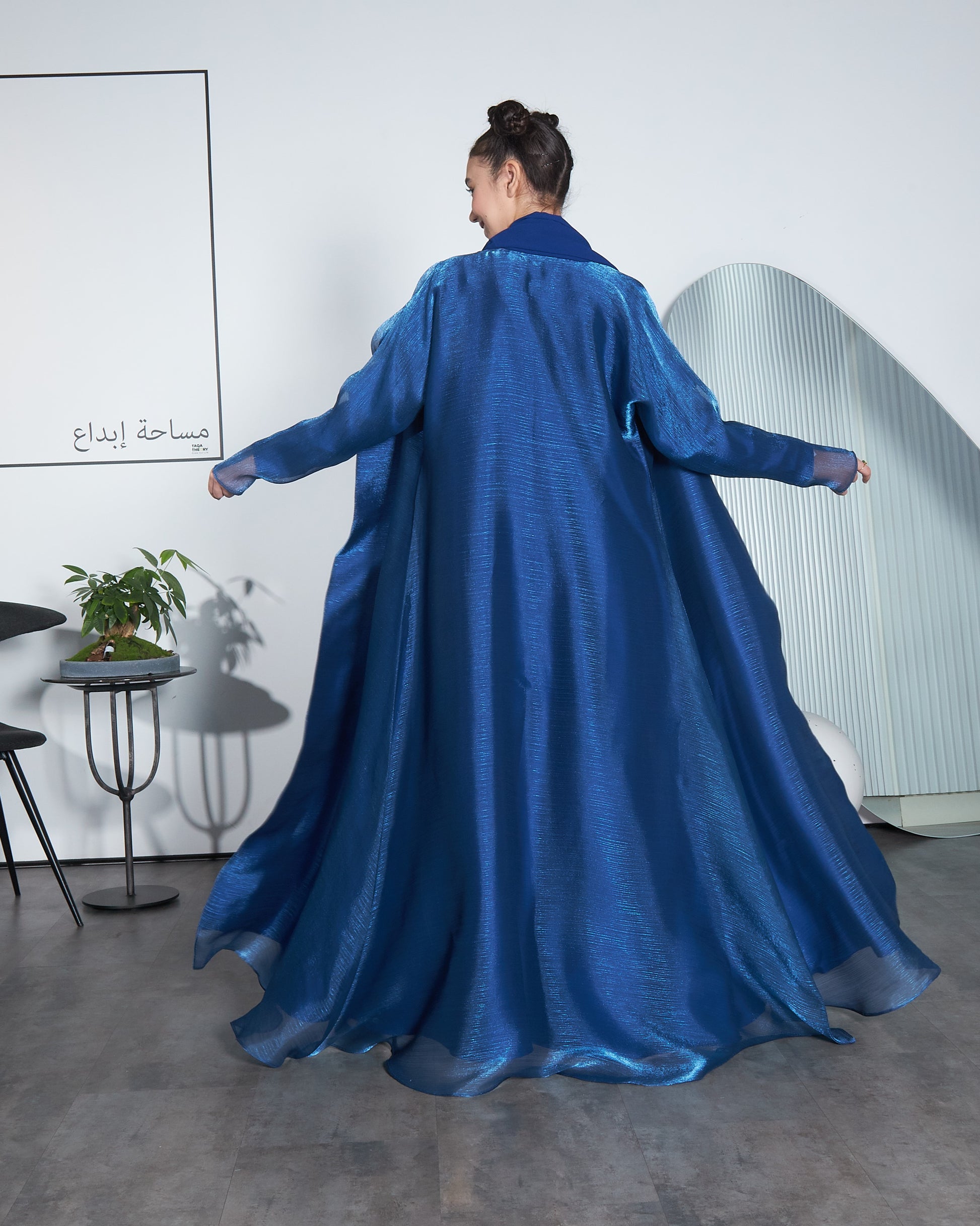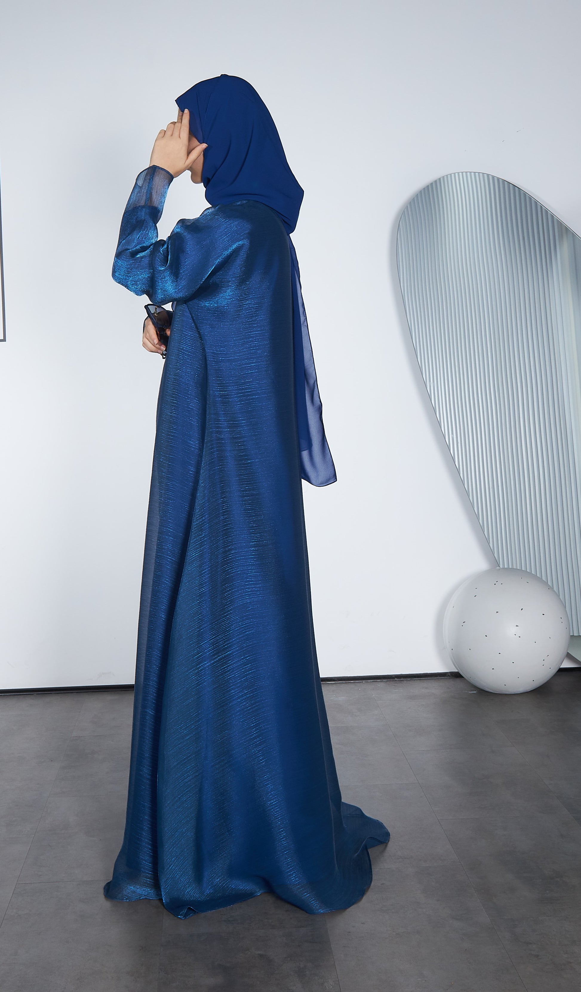 Abaya made of thin organza fabric lined with satin, with modern details and Dark Blue color