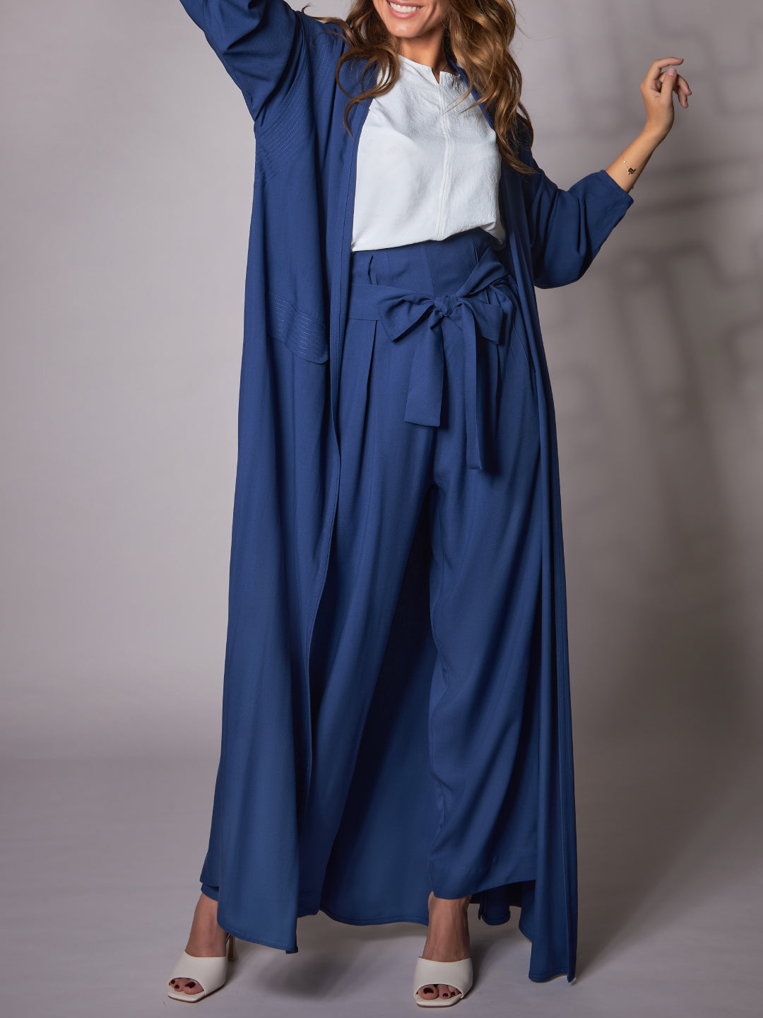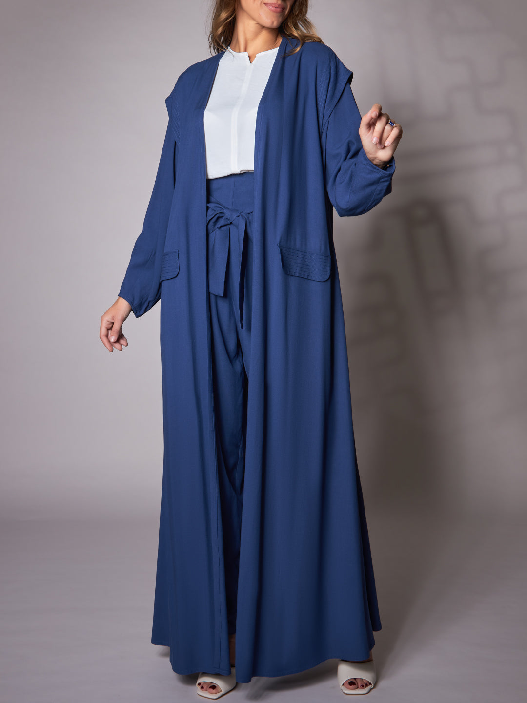 Open abaya designed for maximum comfort and breathability. Made of natural fabric, this A-line cut features unique details on the shoulder with big stitches. The stitched stripes on the side slit and sleeve give it a stylish finish.