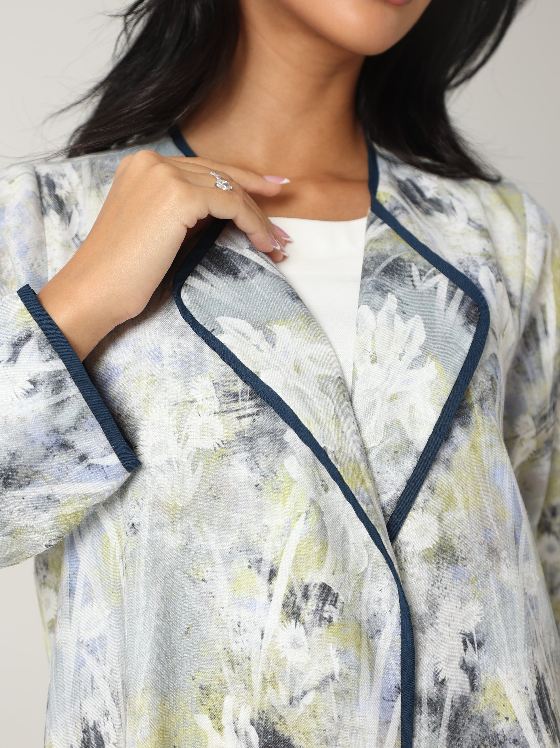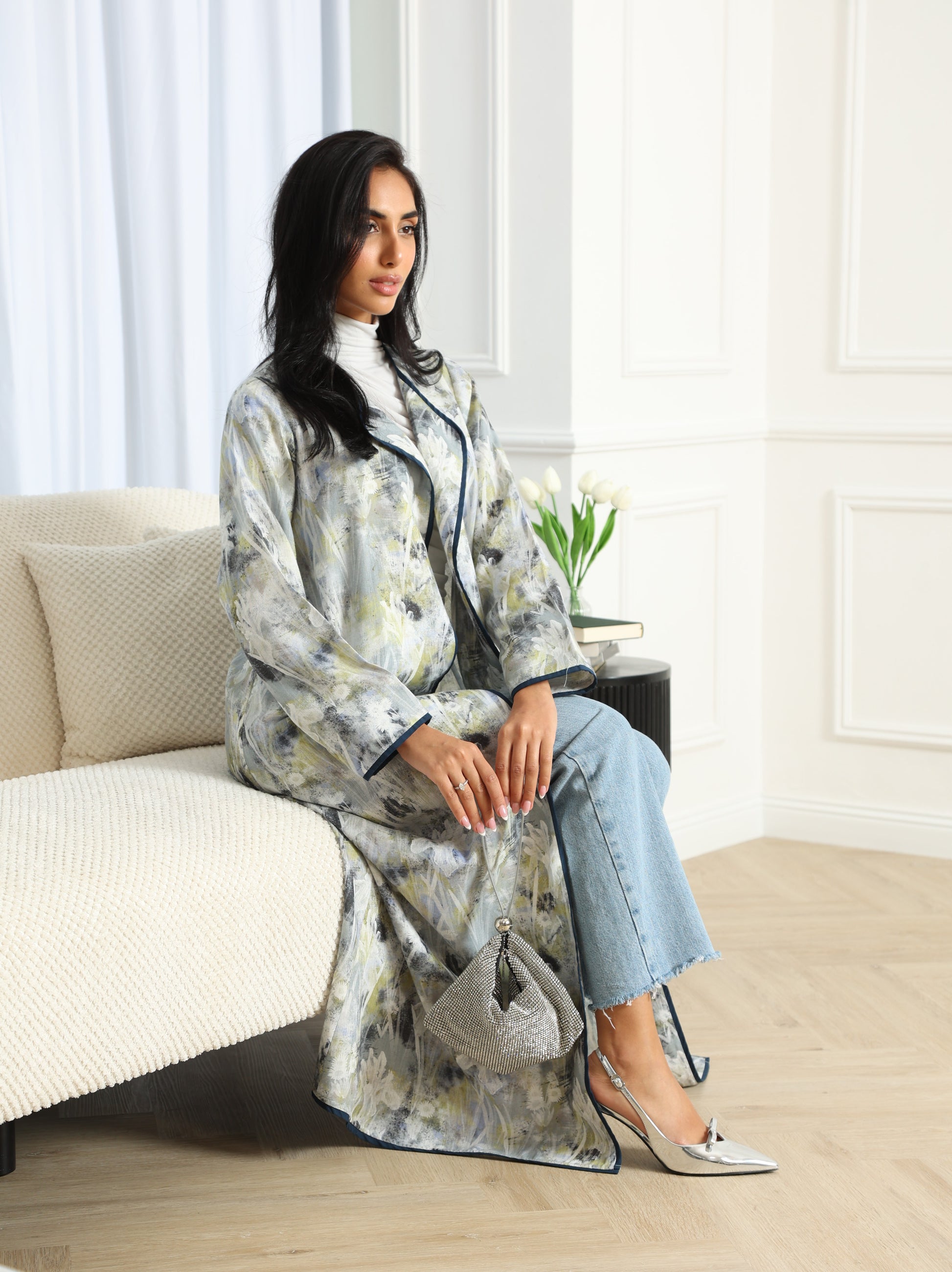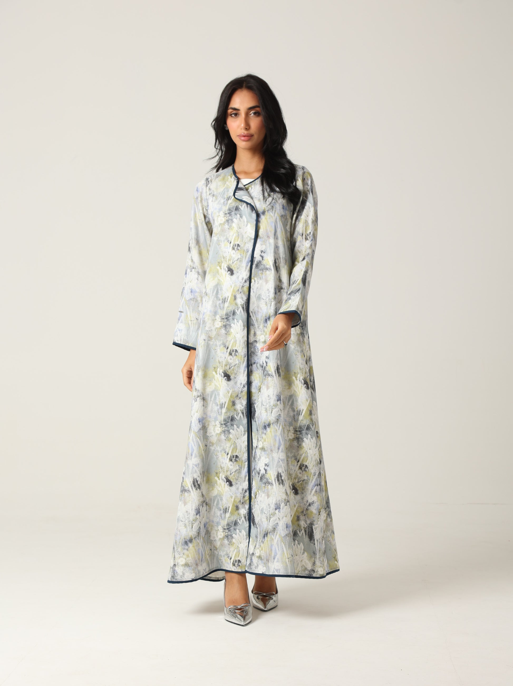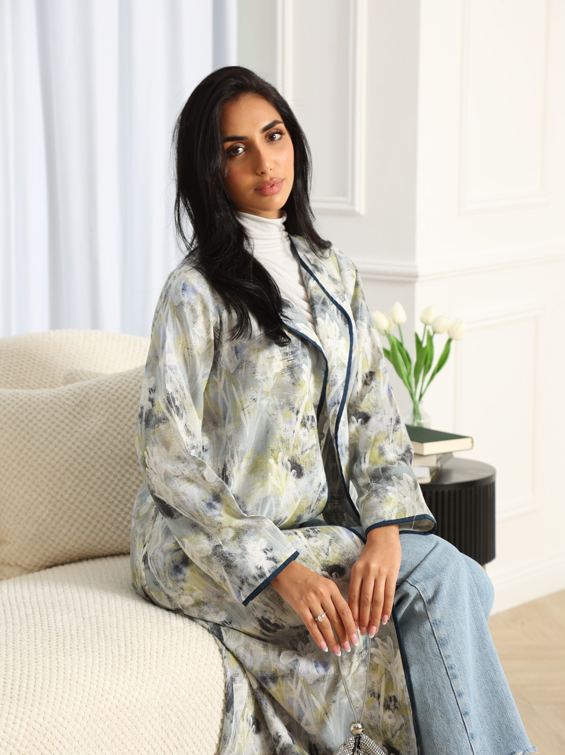 A luxurious linen mix abaya in a stunning color, beautifully embellished with intricate patterns, perfectly combined with navy blue.
