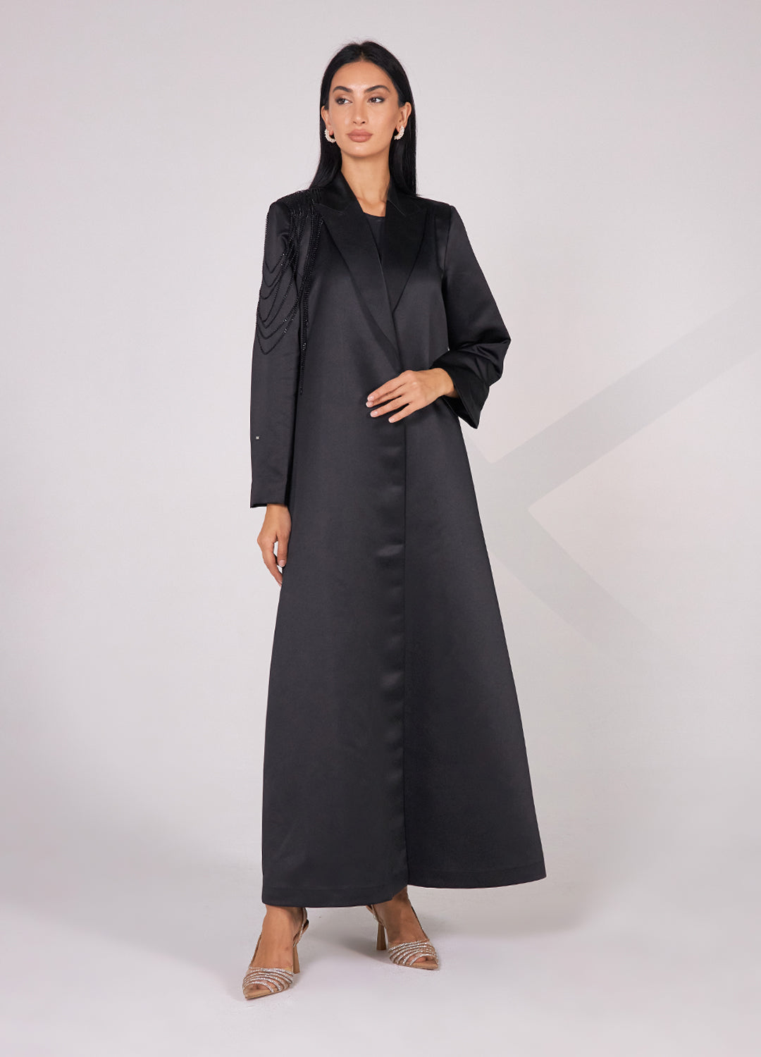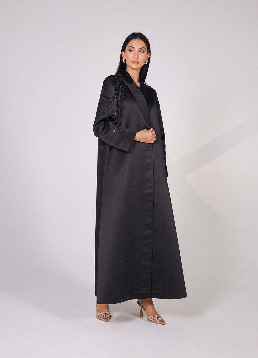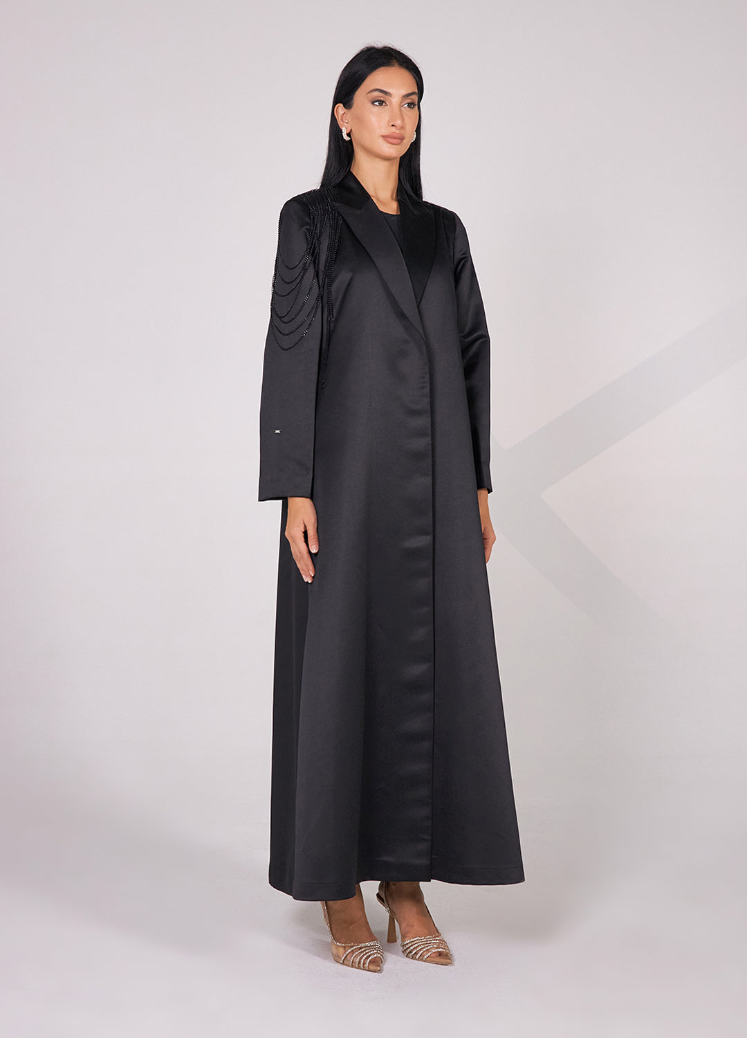 Diescover elegance in our latest black taffeta abaya ,adorned with black chains elegantly draped over the shoulder and sleeve .Atrue embodiment of sophistication and style