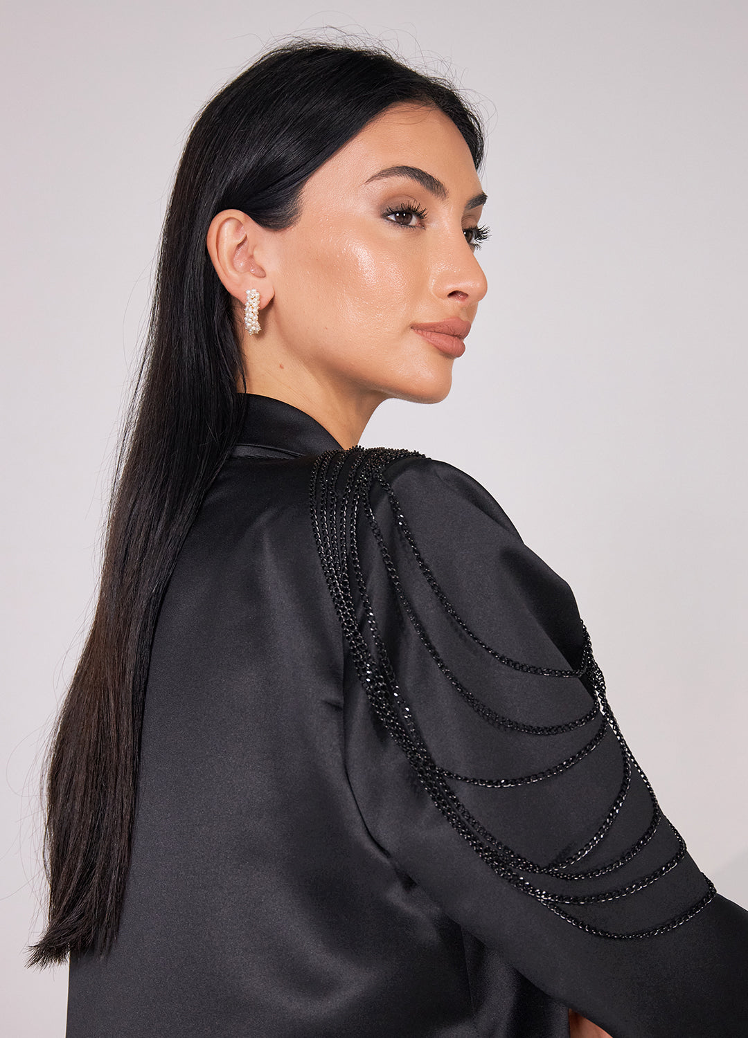 عباية سوداء أنيقة فيها سلاسل على الكتف ,مصنوعه من قماش التفتا الساتان تعطي لمسه راقية وأنيقة