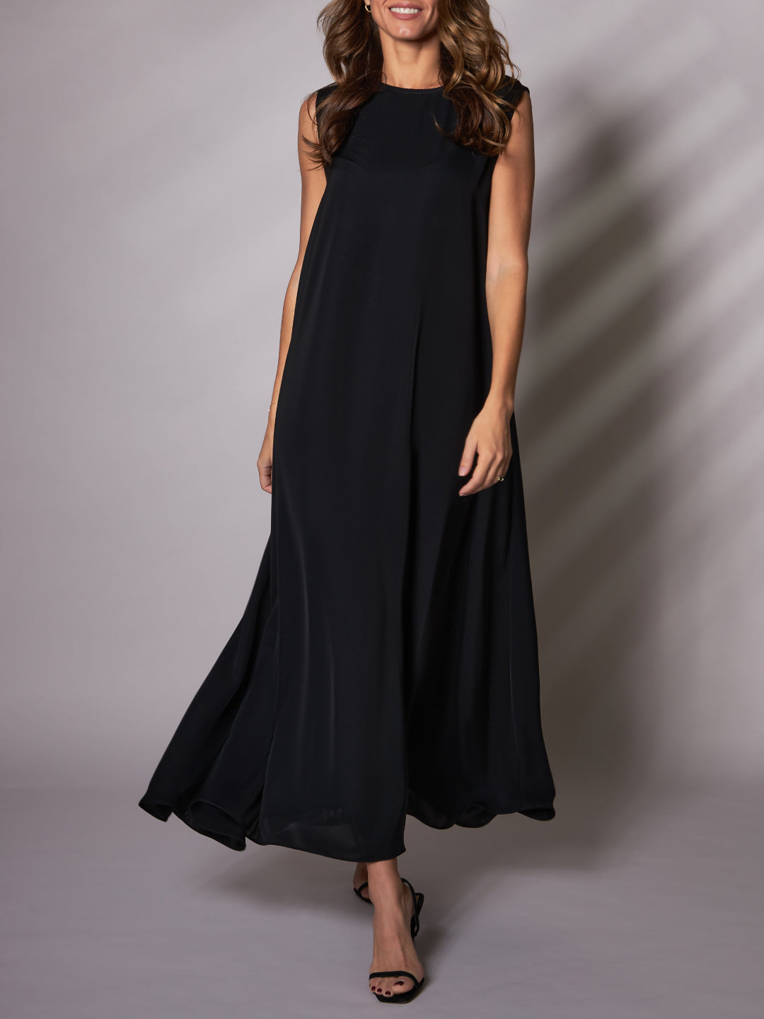 فستان من قماش الساتان الأسود الفاخر الأنيق بقصة اكس مناسب للبس تحت العباية أو مناسبة أنيقة بكم طويل