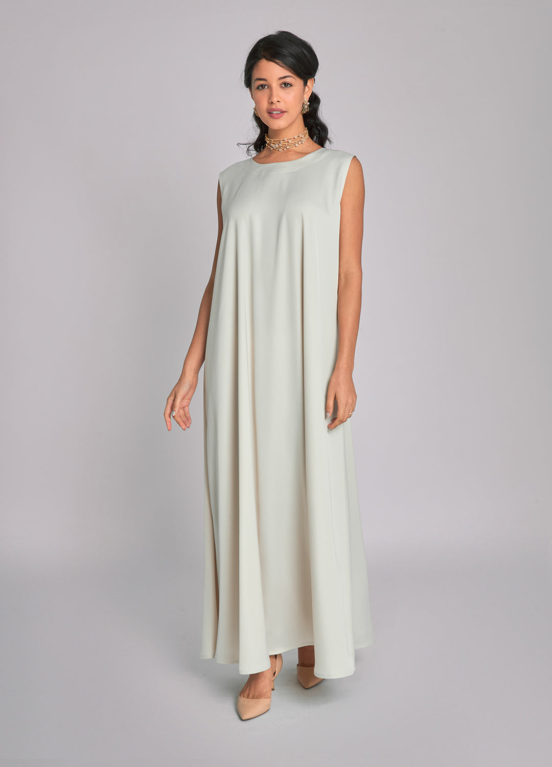 This sleeveless dress in delicate black satin is a great addition to your summer wardrobe. Made from comfortable and lightweight fabric, this dress is perfect for wearing under the abaya or on its own.
