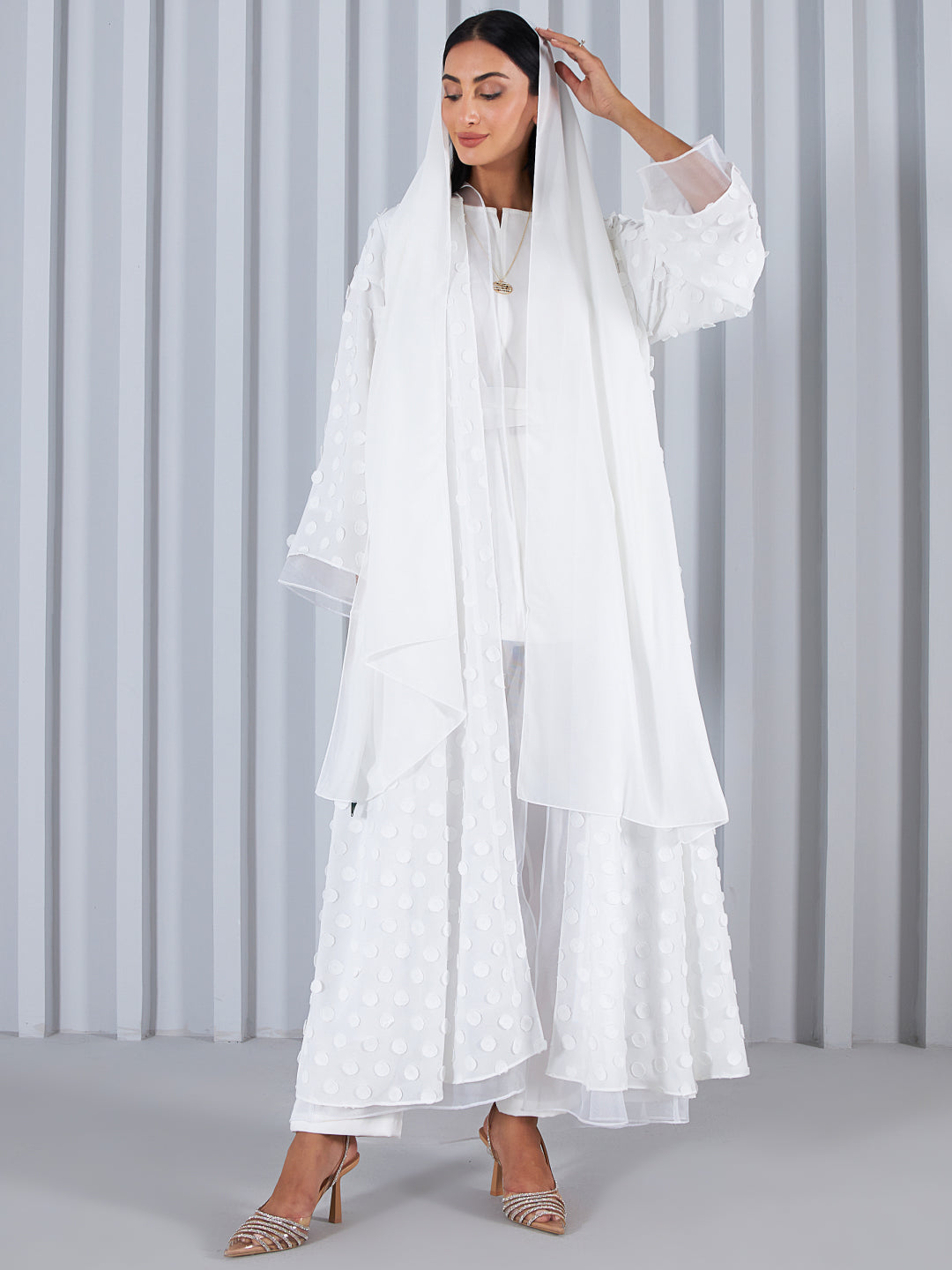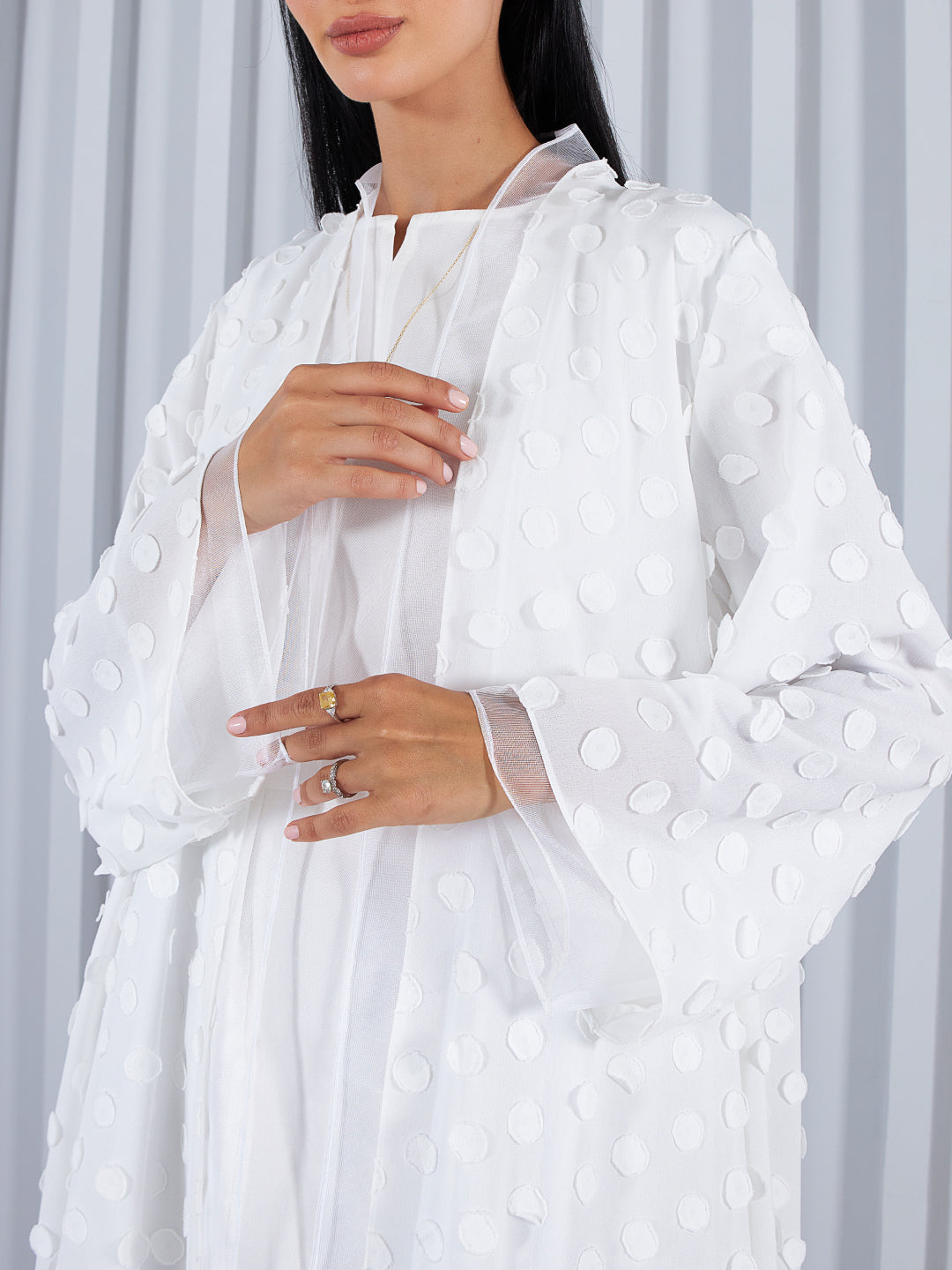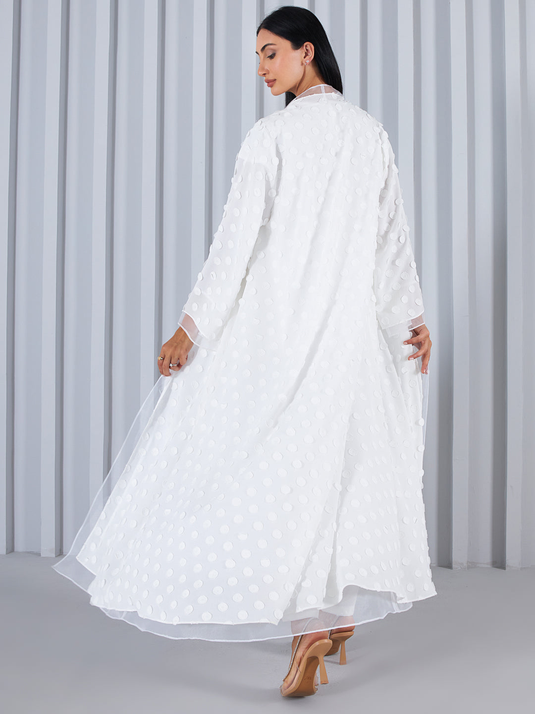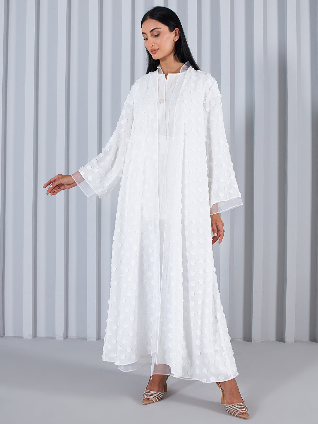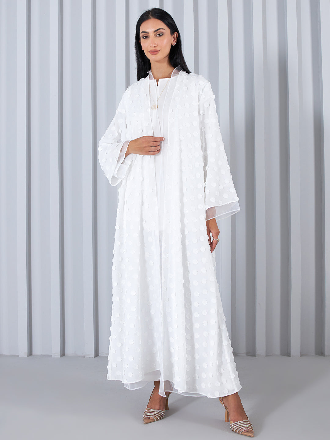 عباية من قماش الجرجيت الرائع مع زخرفة من الدوائر مركبة عليها ، يأطراف من قماش أورجانزا أنيق