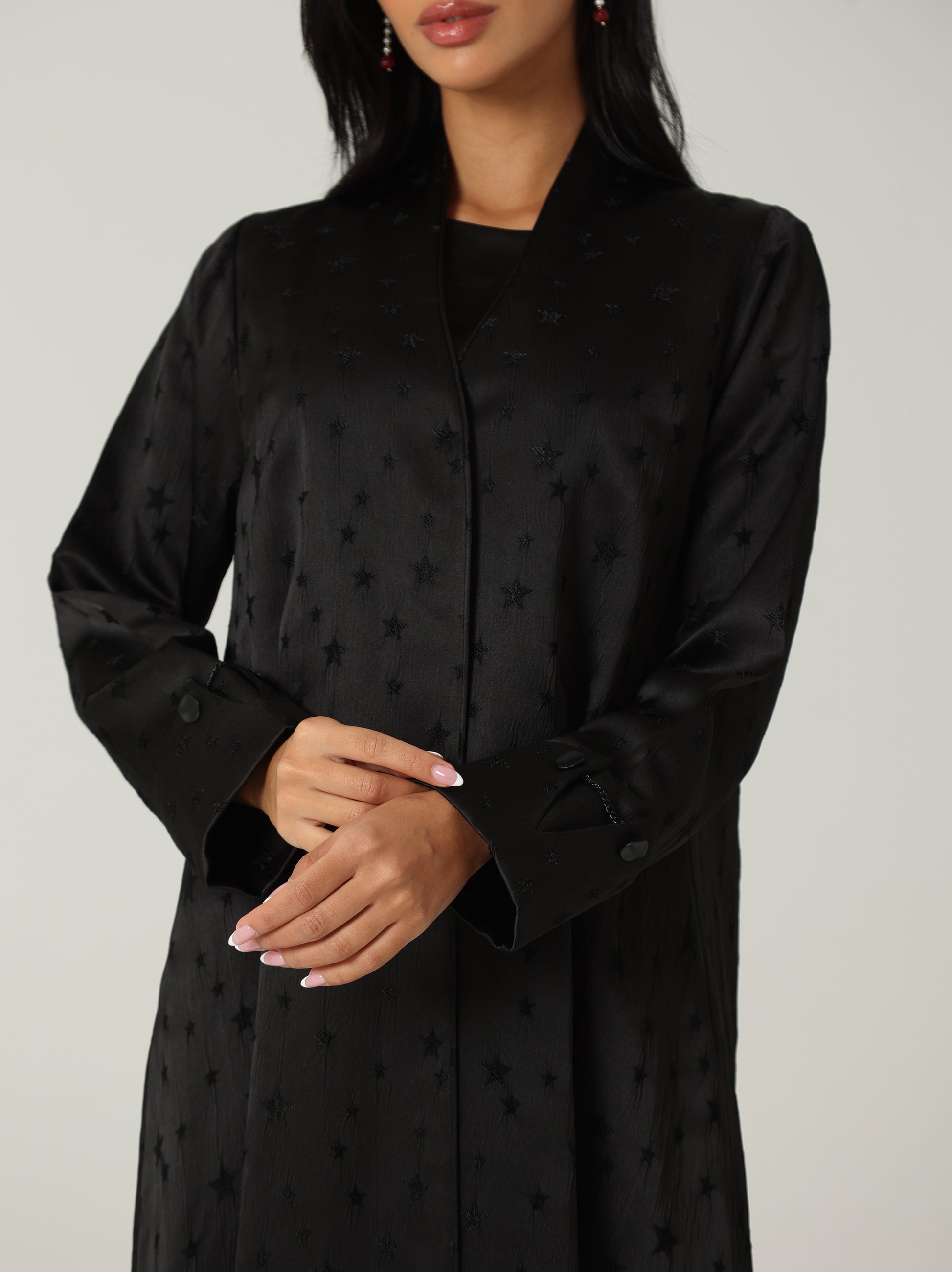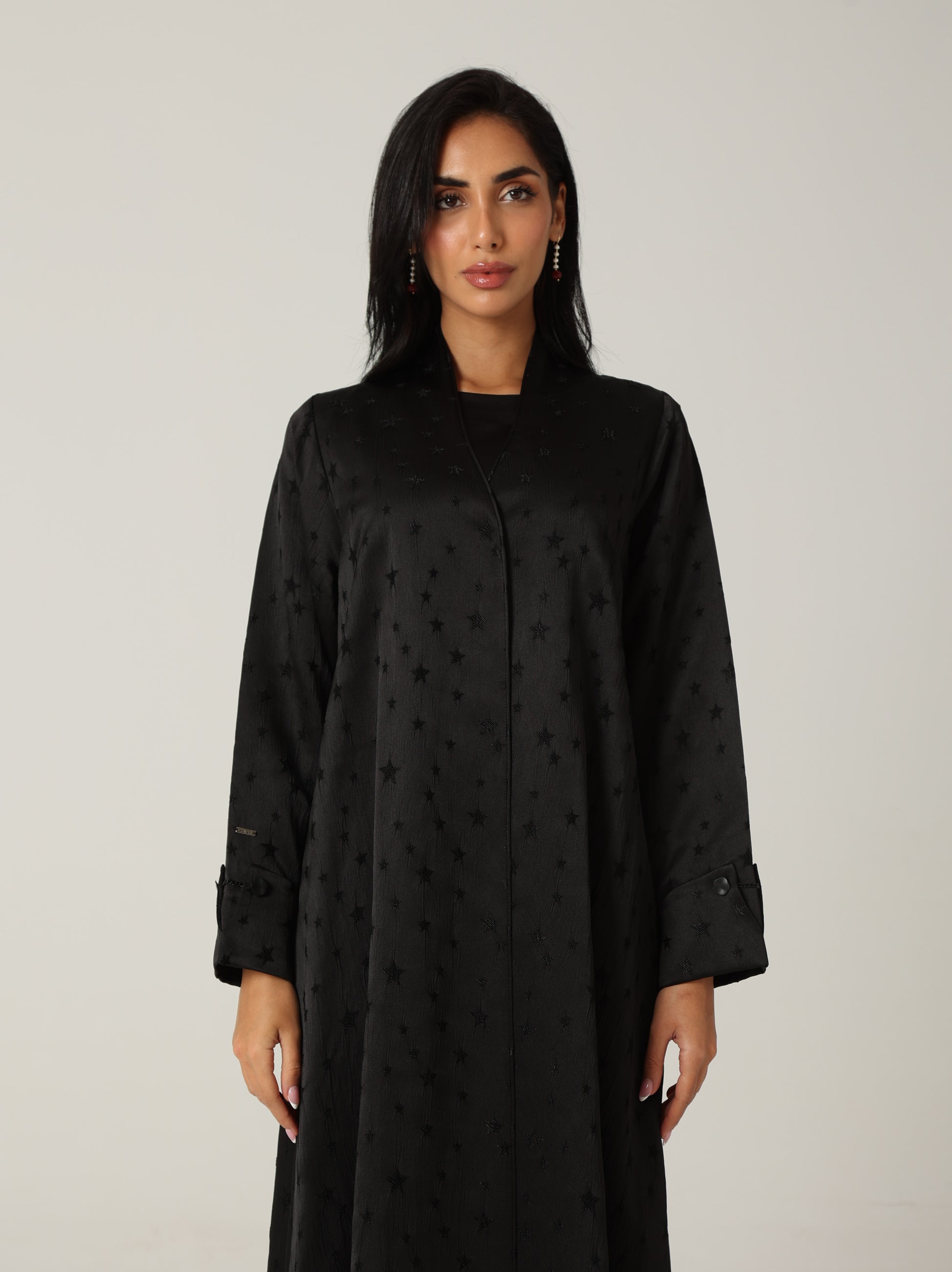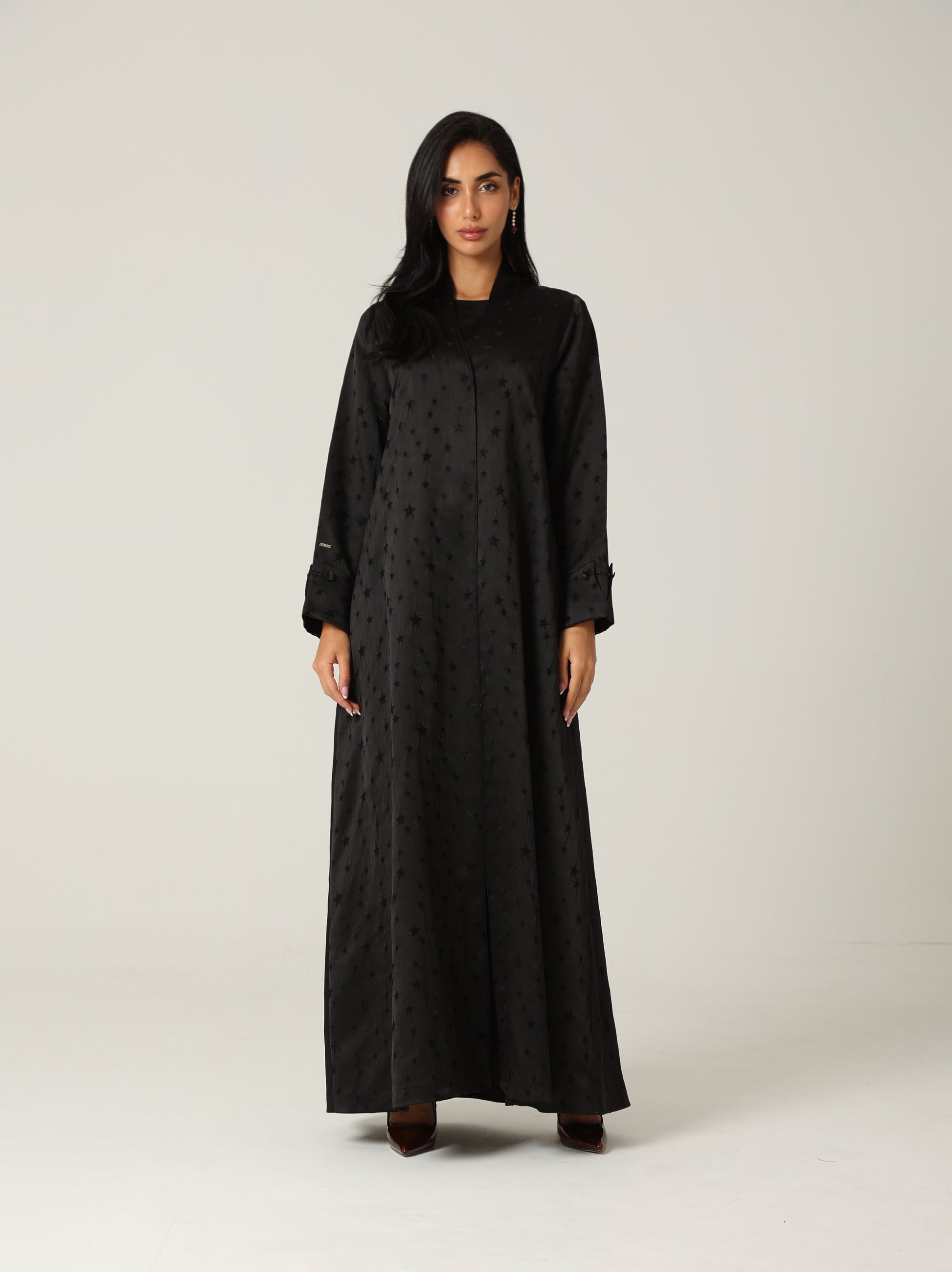 A luxurious and elegant abaya made from satin crepe fabric adorned with stars, featuring a simple cut. This abaya is the perfect choice for all occasions, combining both luxury and comfort in one design.