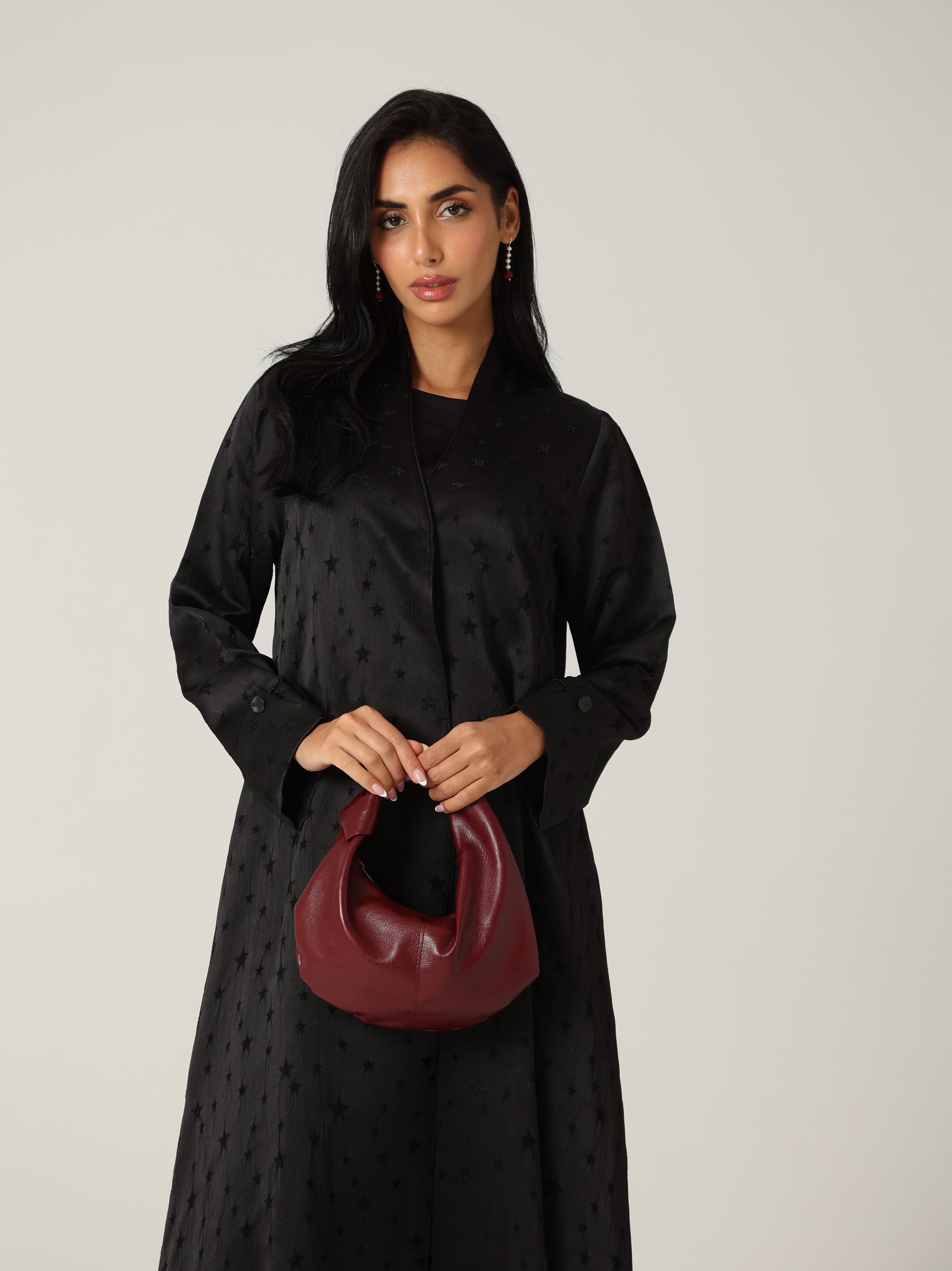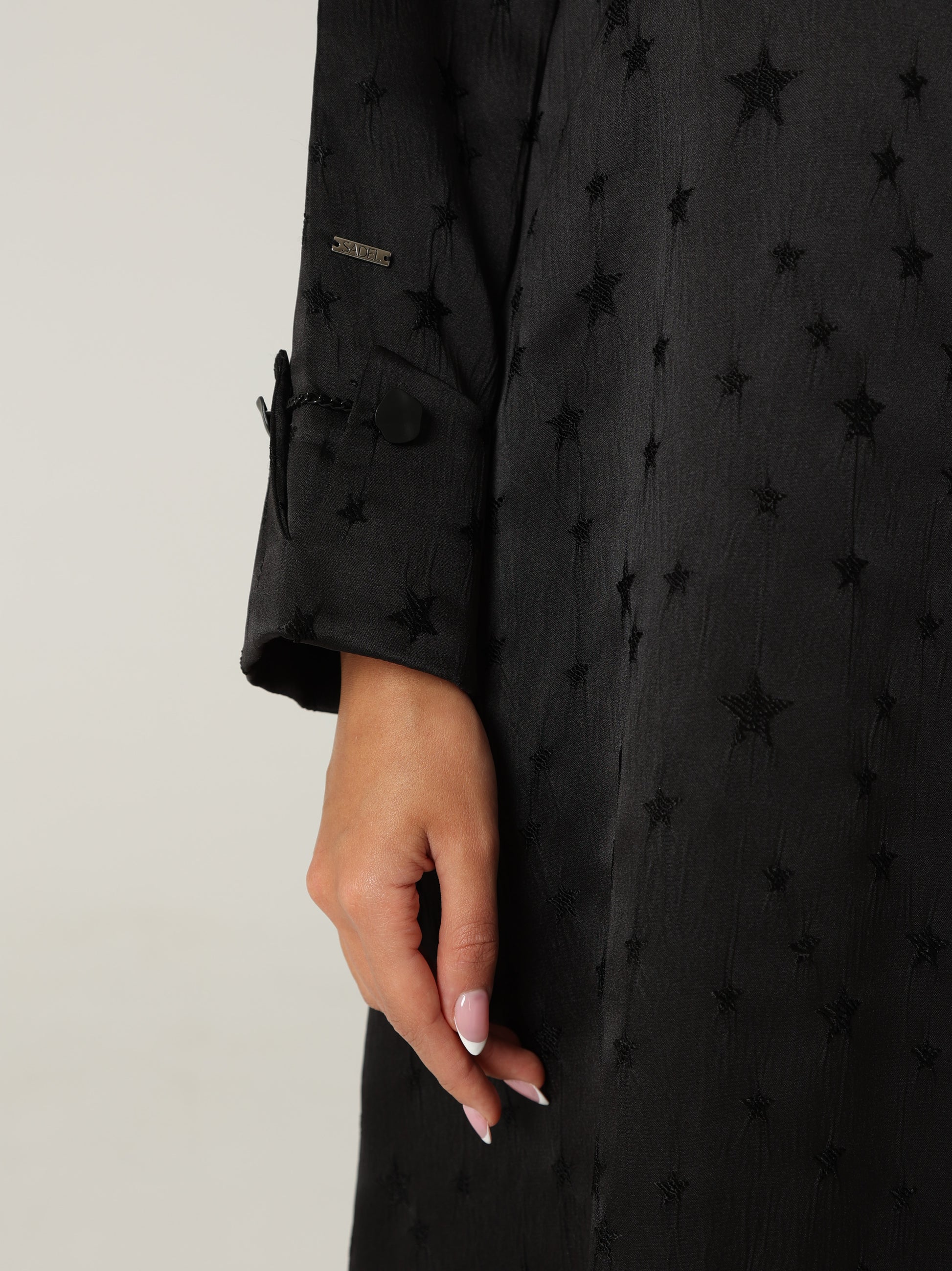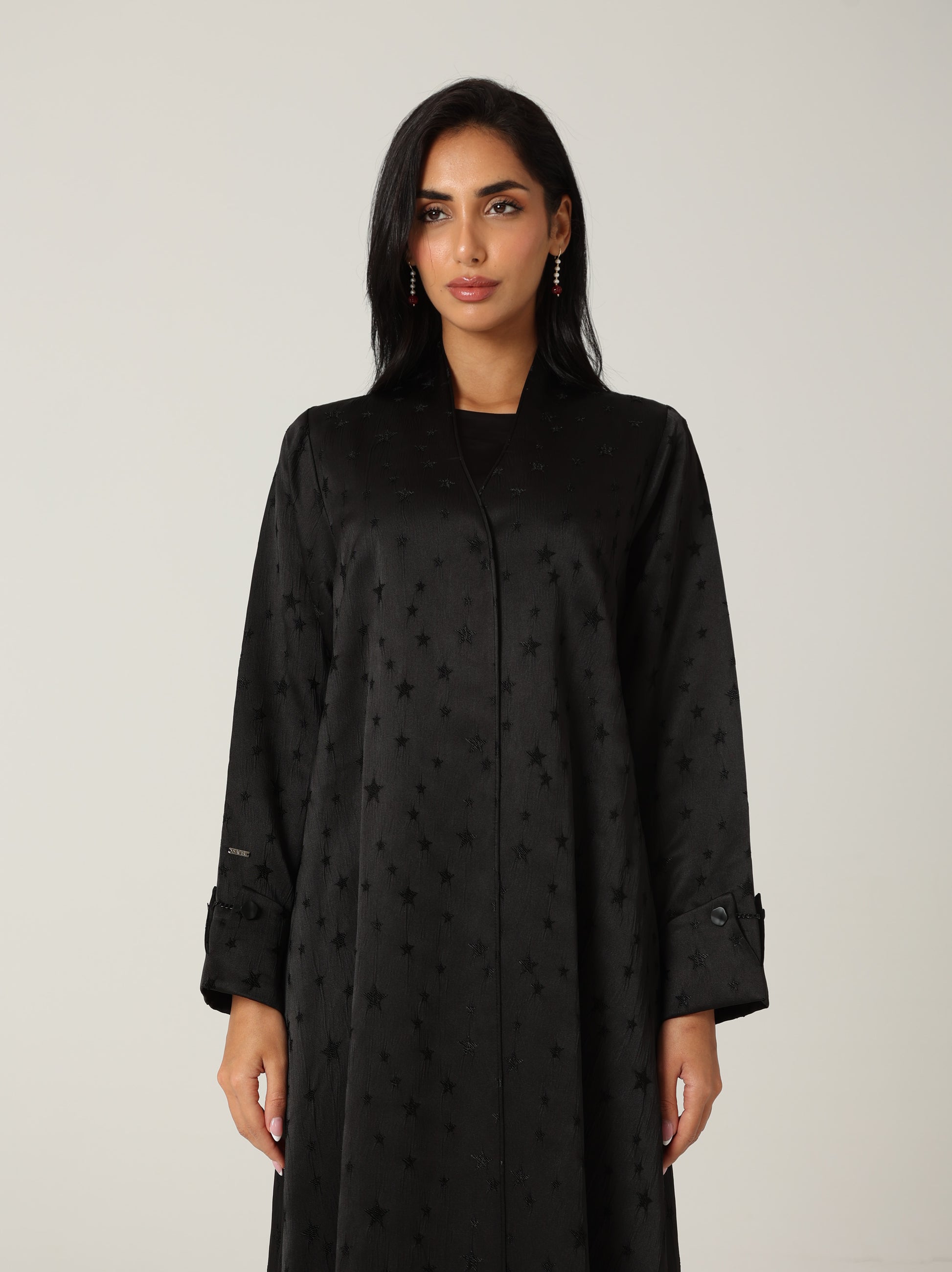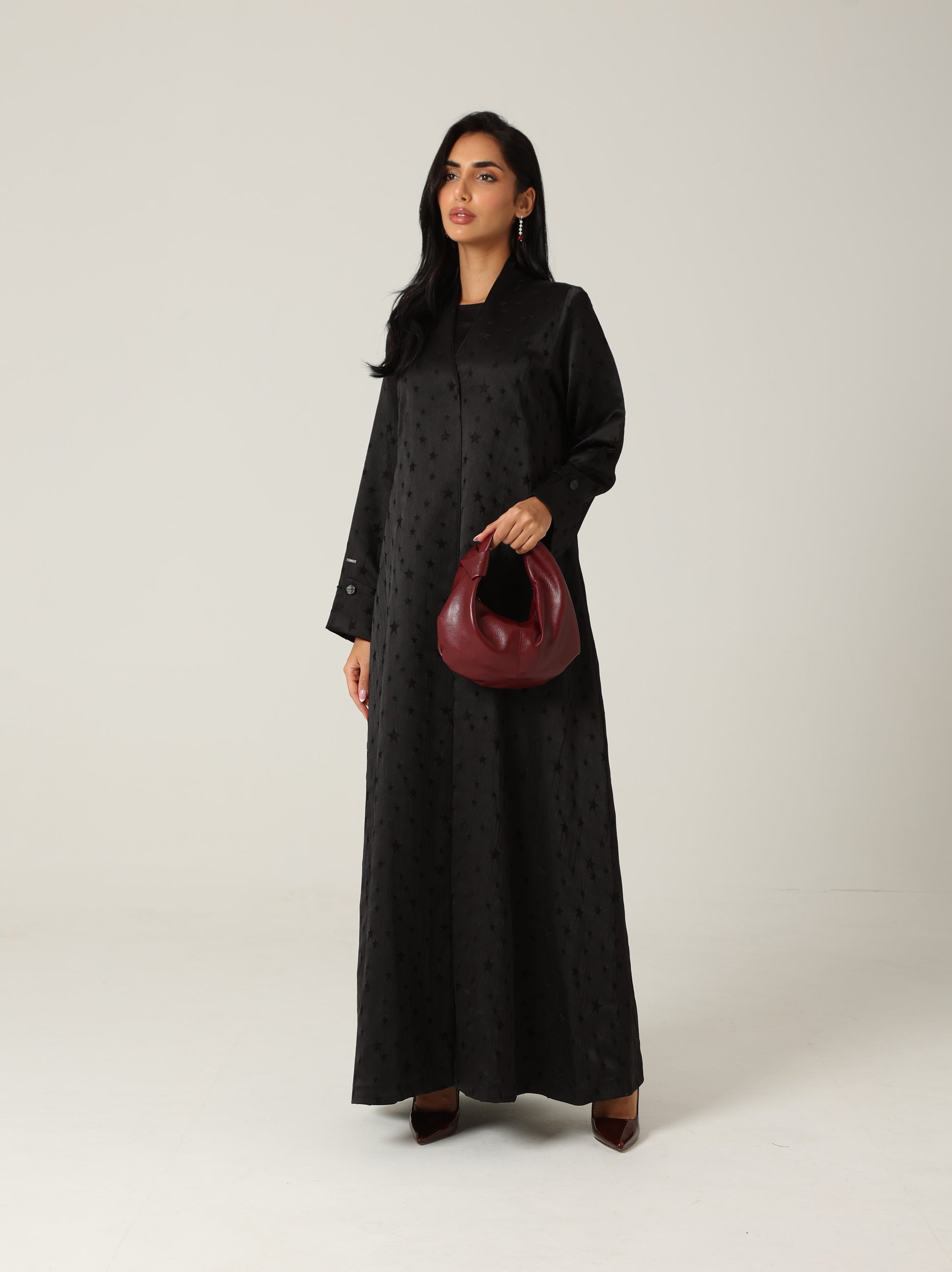 A luxurious and elegant abaya made from satin crepe fabric adorned with stars, featuring a simple cut. This abaya is the perfect choice for all occasions, combining both luxury and comfort in one design.