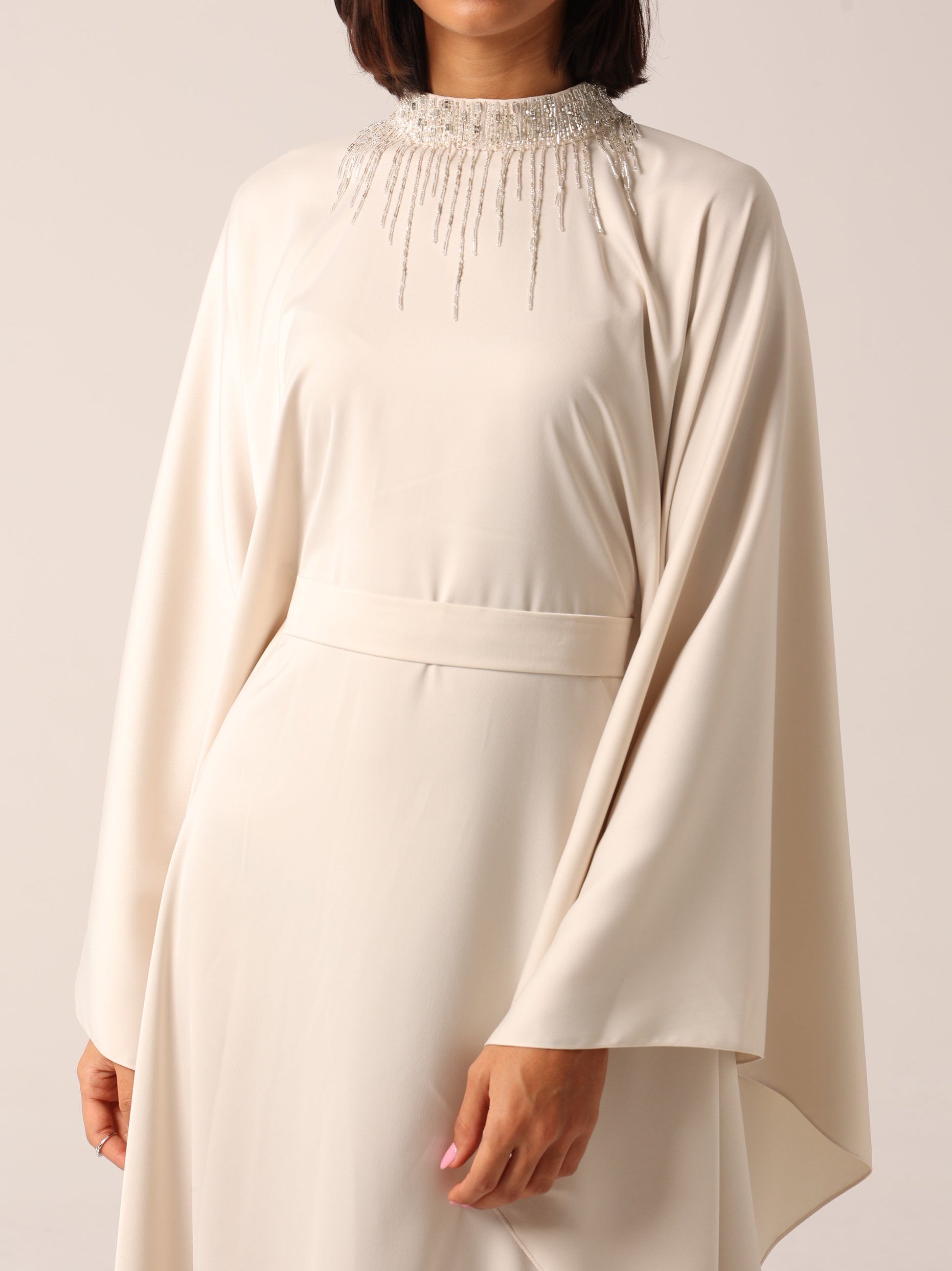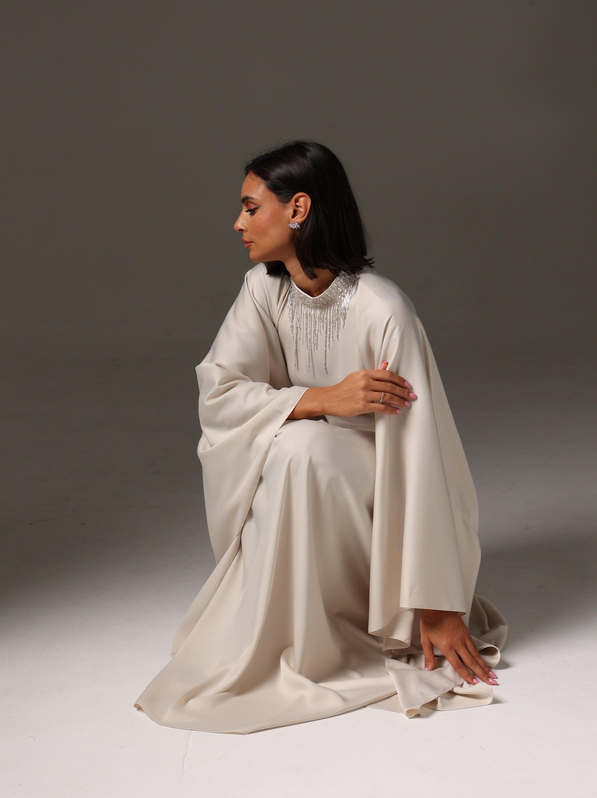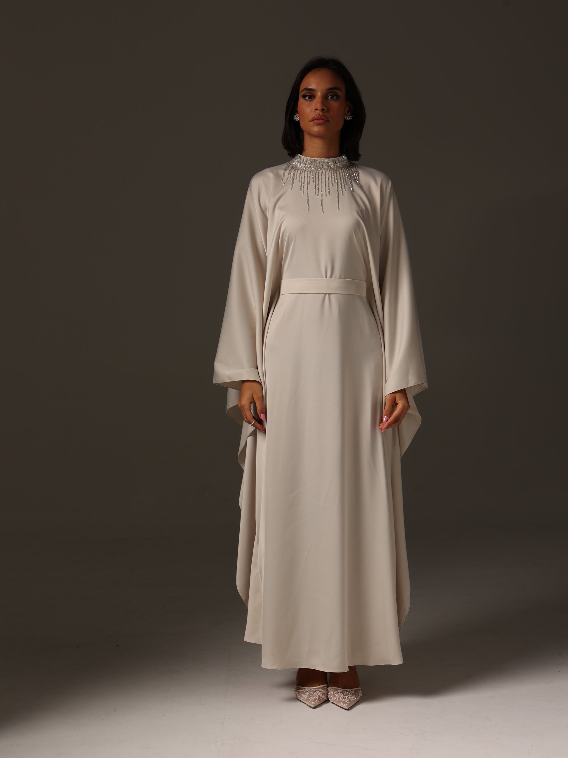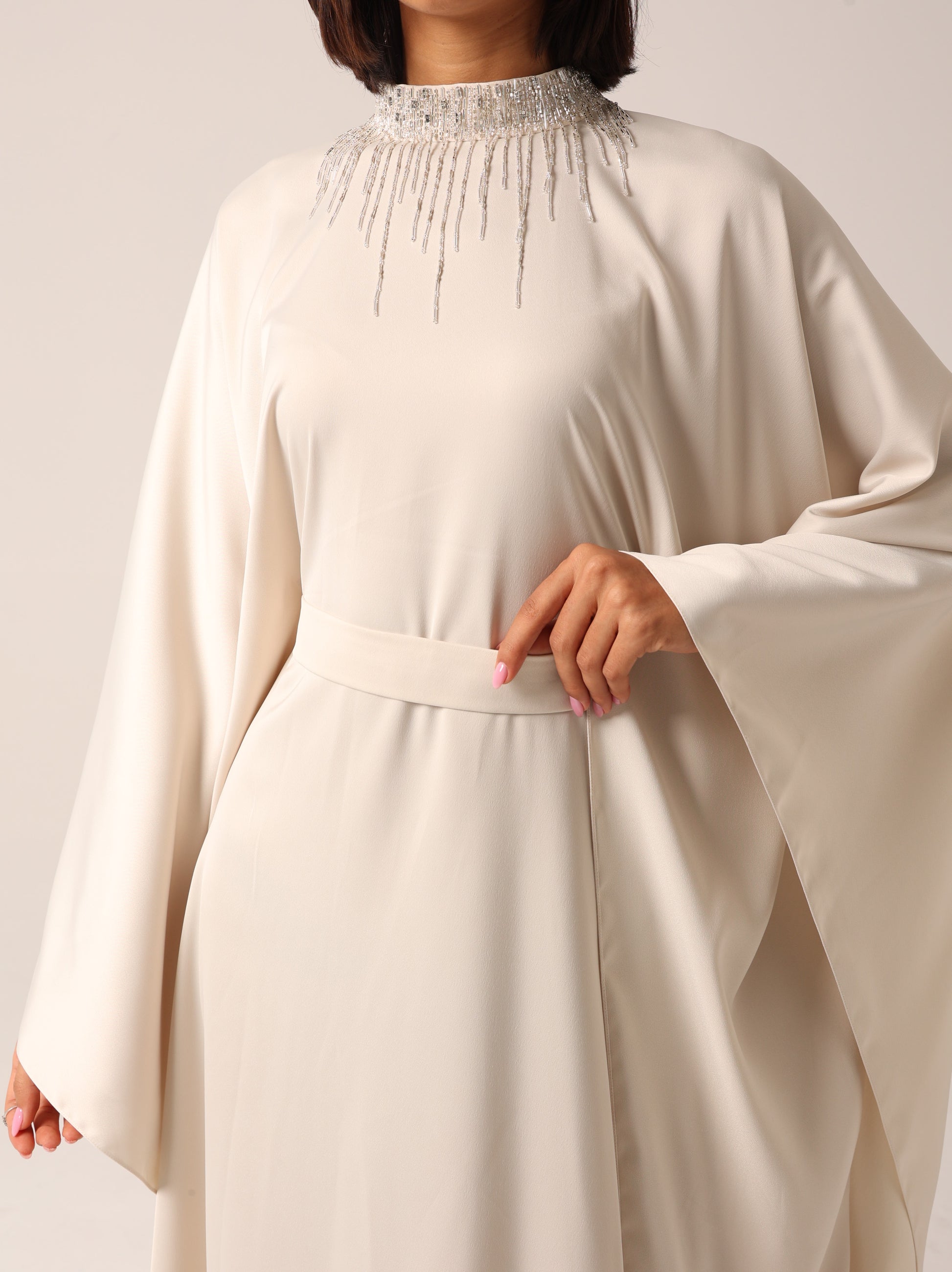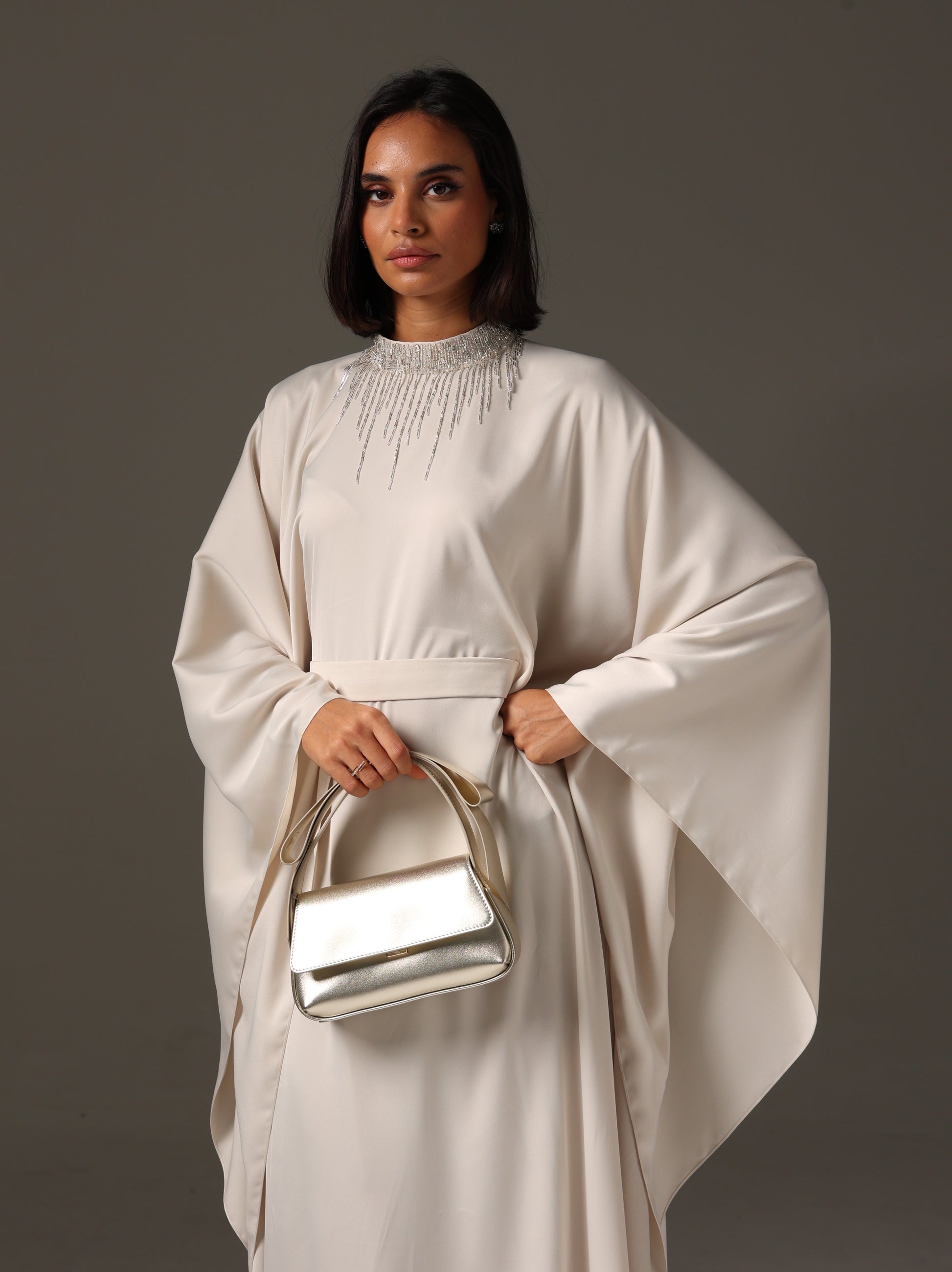 فستان من قماش الساتان الأسود الفاخر الأنيق بقصة اكس مناسب للبس تحت العباية أو مناسبة أنيقة بكم طويل