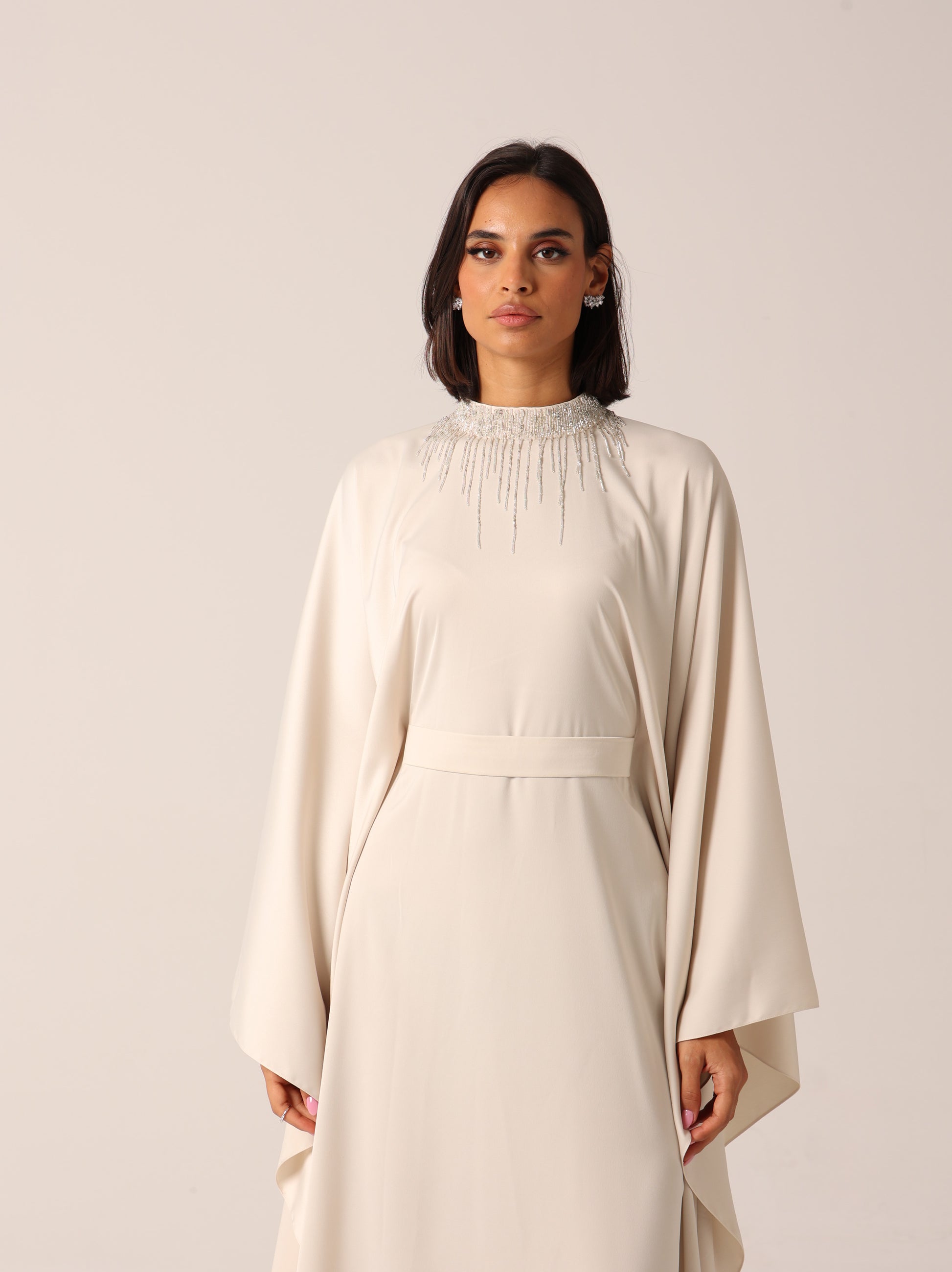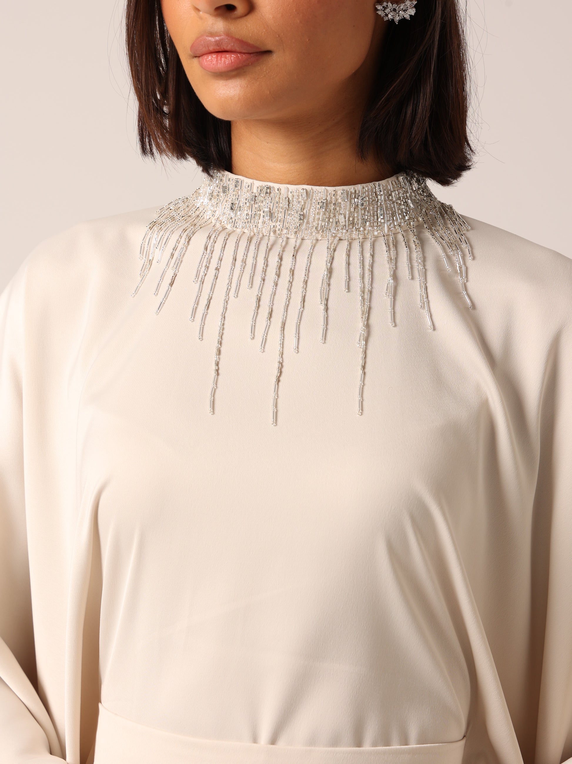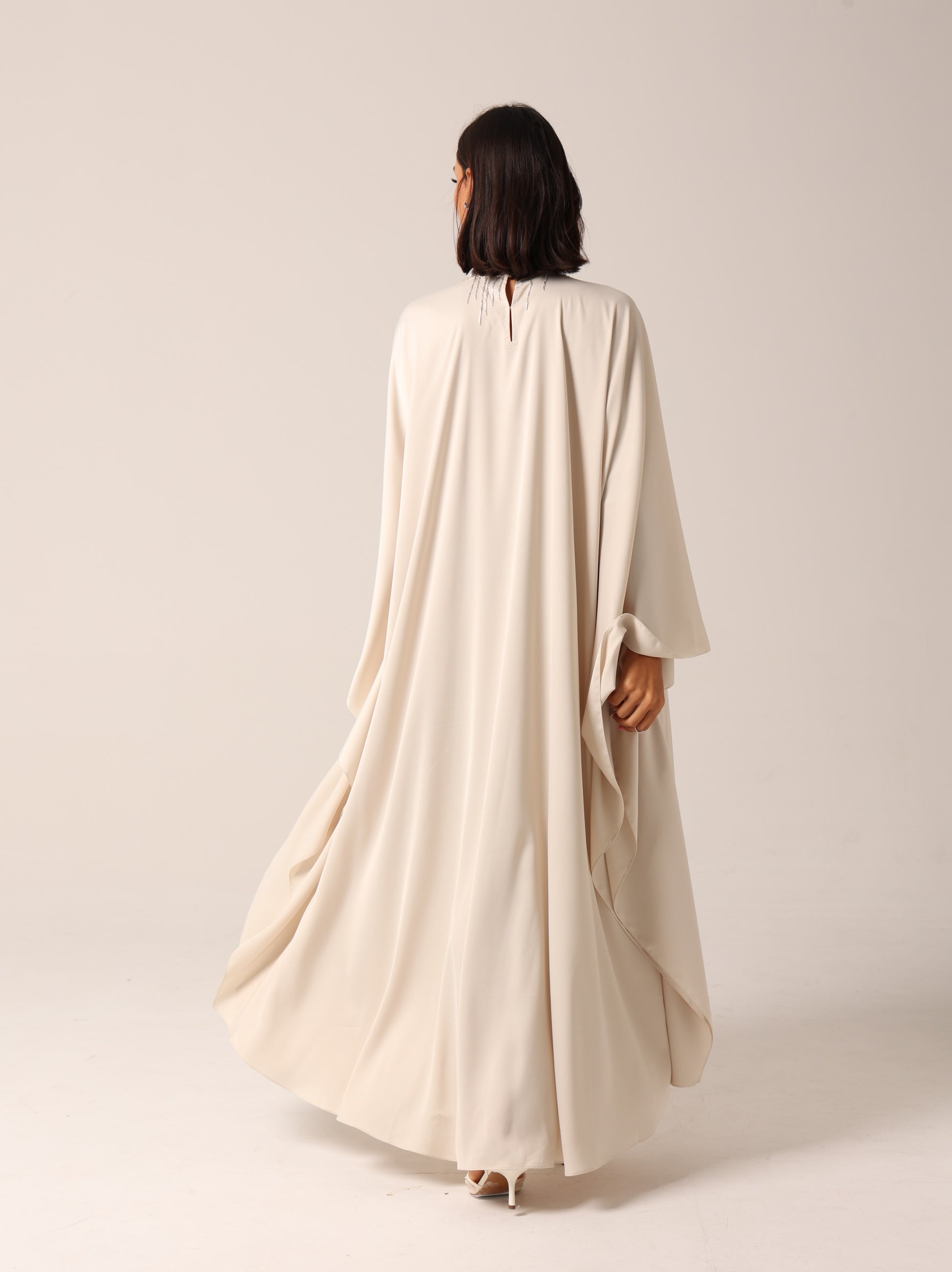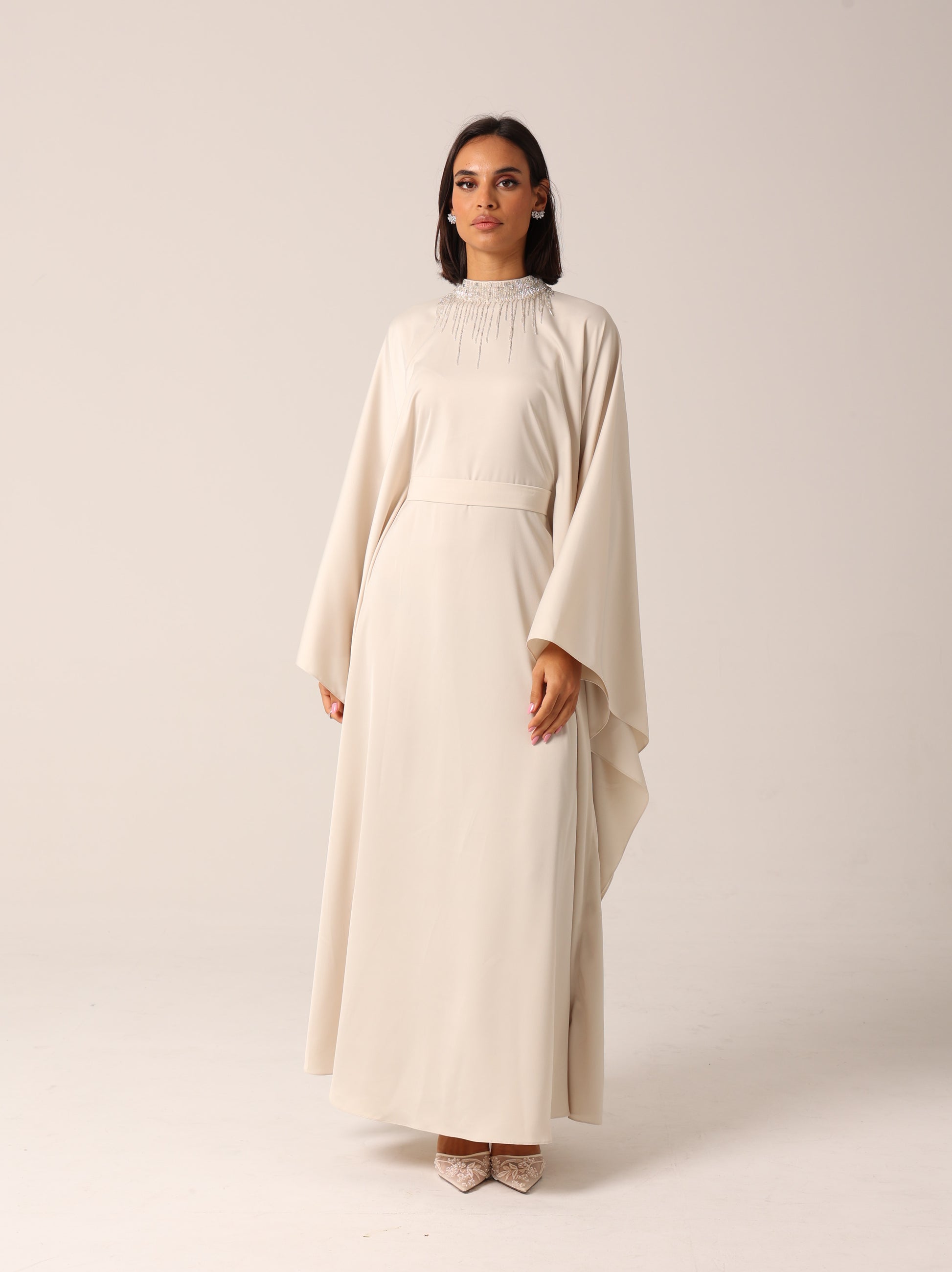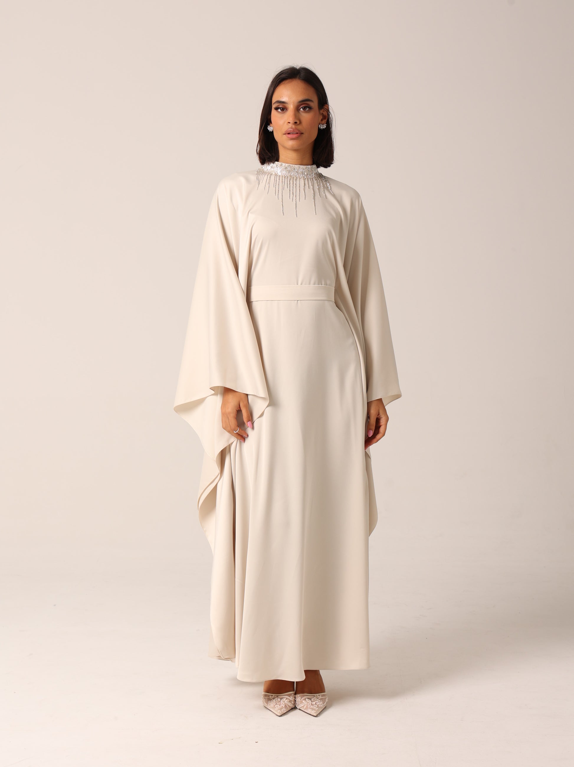 فستان من قماش الساتان الأسود الفاخر الأنيق بقصة اكس مناسب للبس تحت العباية أو مناسبة أنيقة بكم طويل