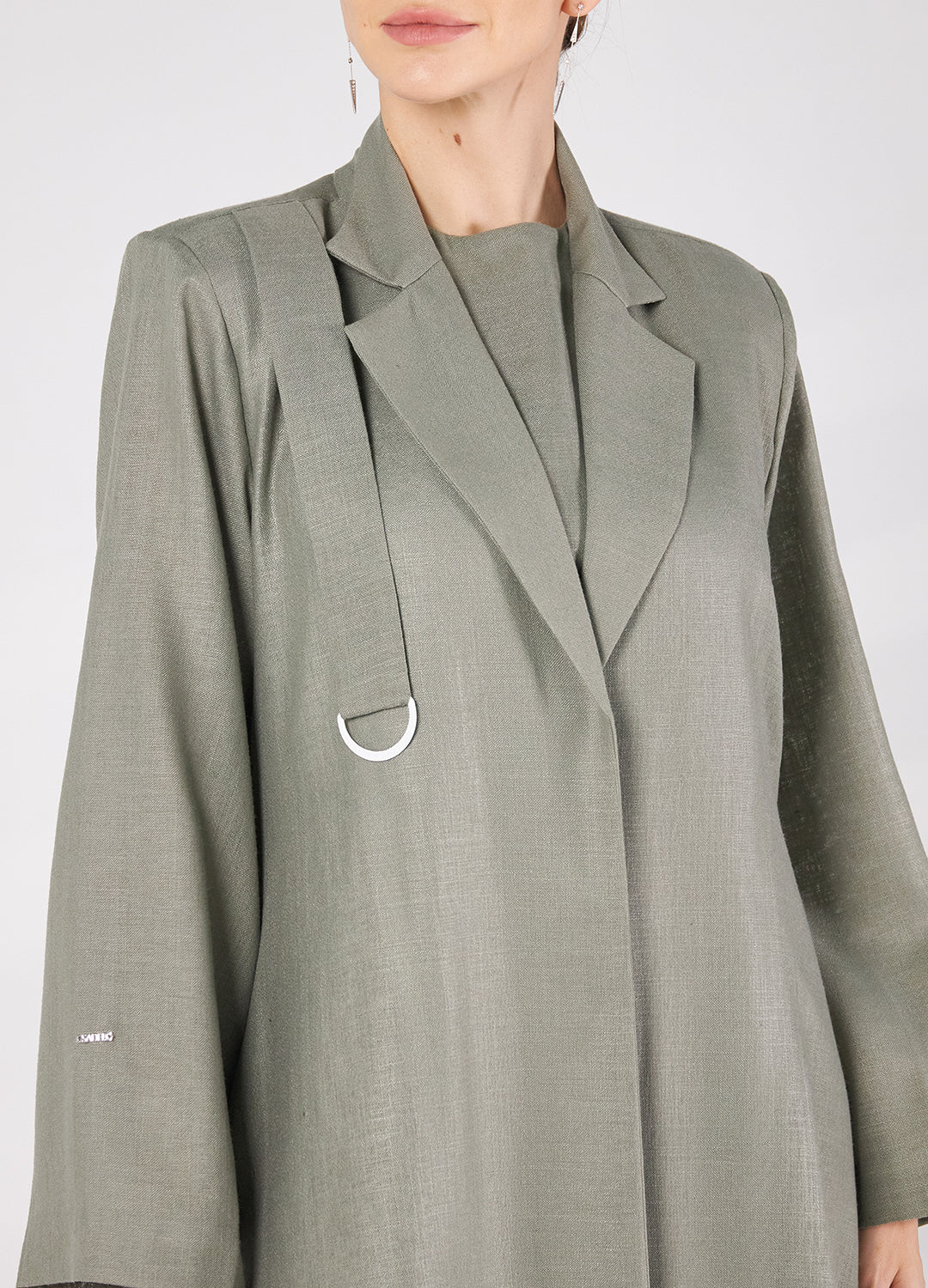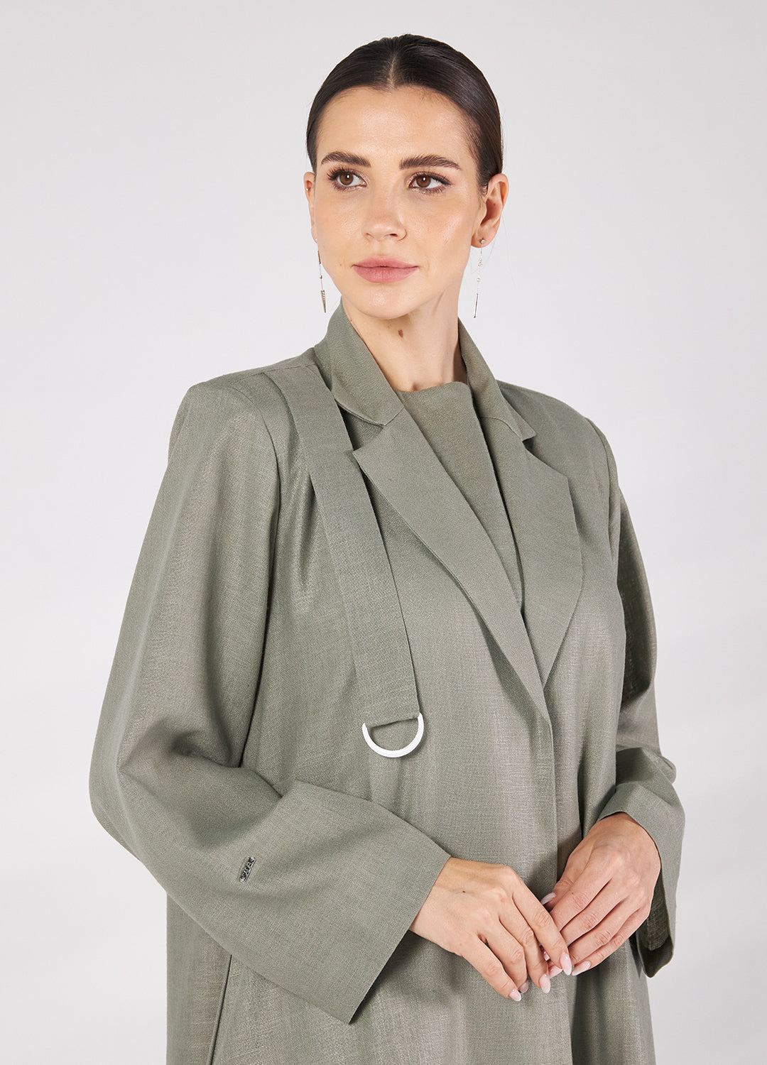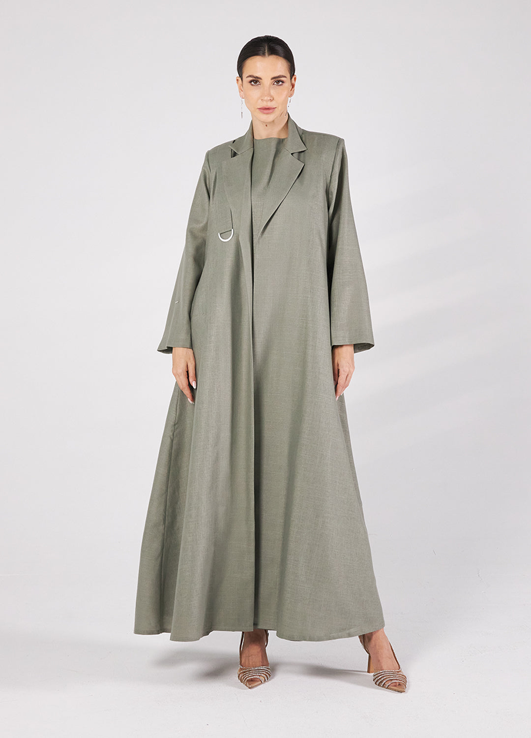 3 Pieces Abaya full set delivers a soft and dreamy aesthetic ,Cut from Linen fabric, featuring open-front coat style Abaya, Inner dress and headscarf (sheila).