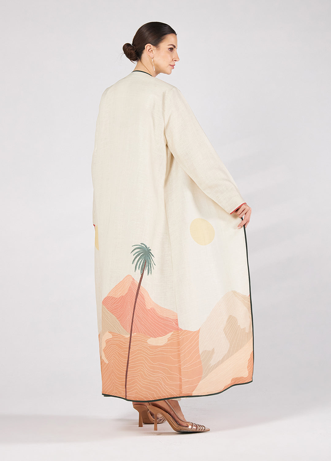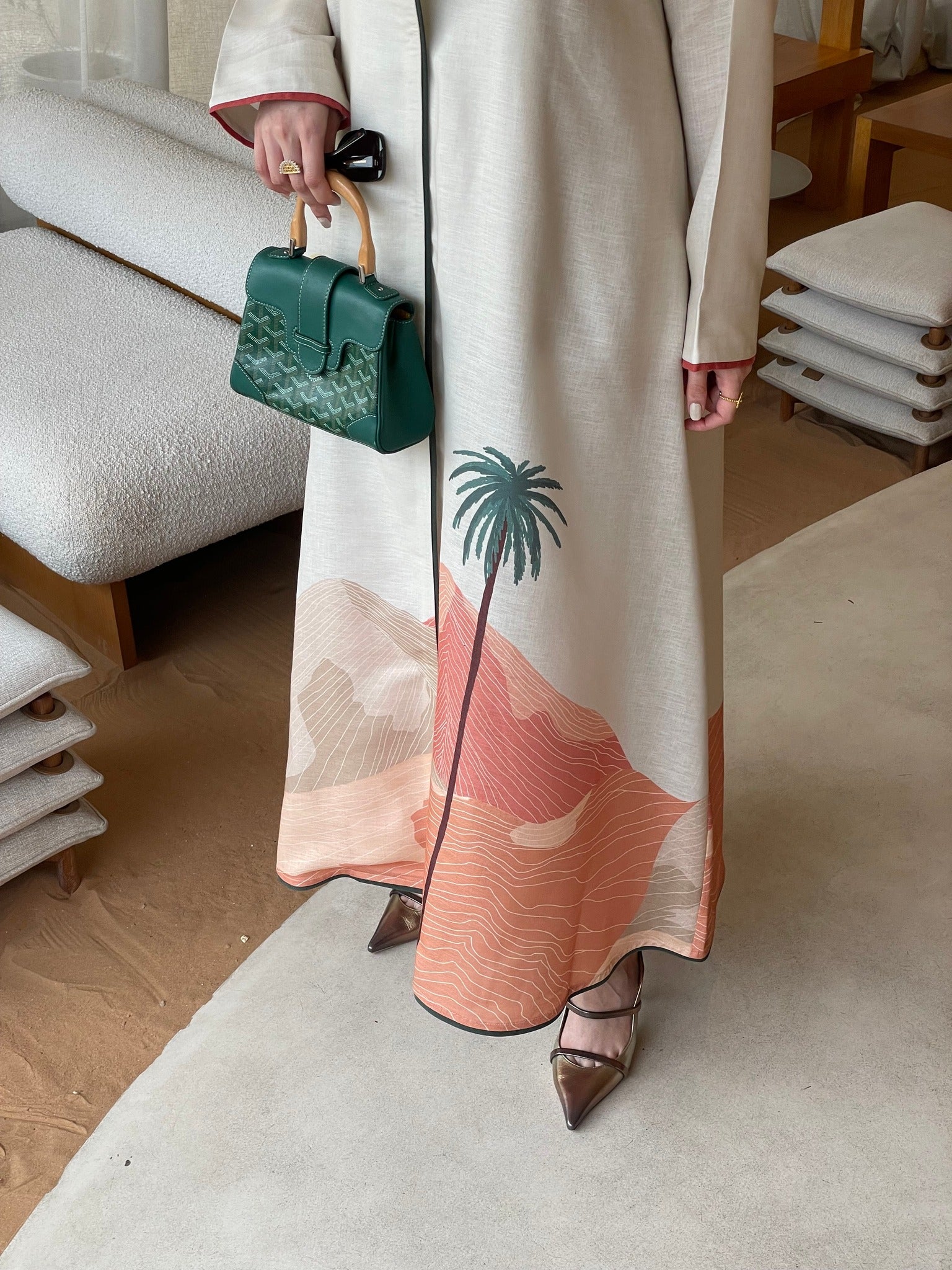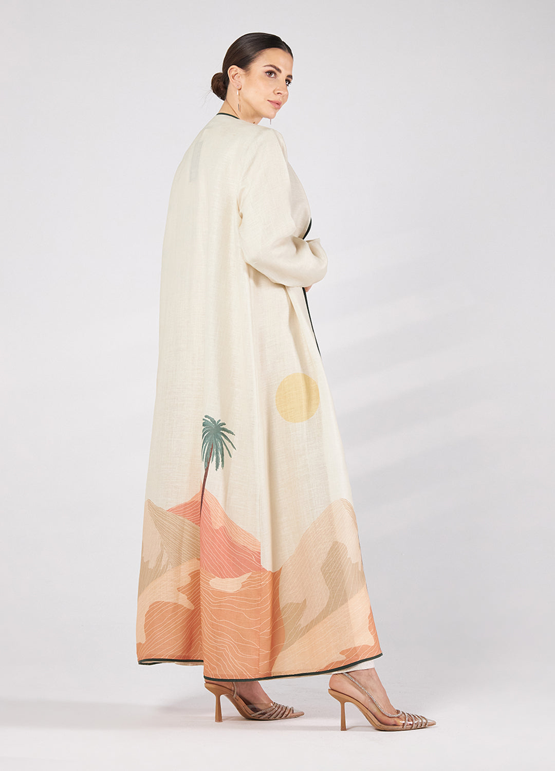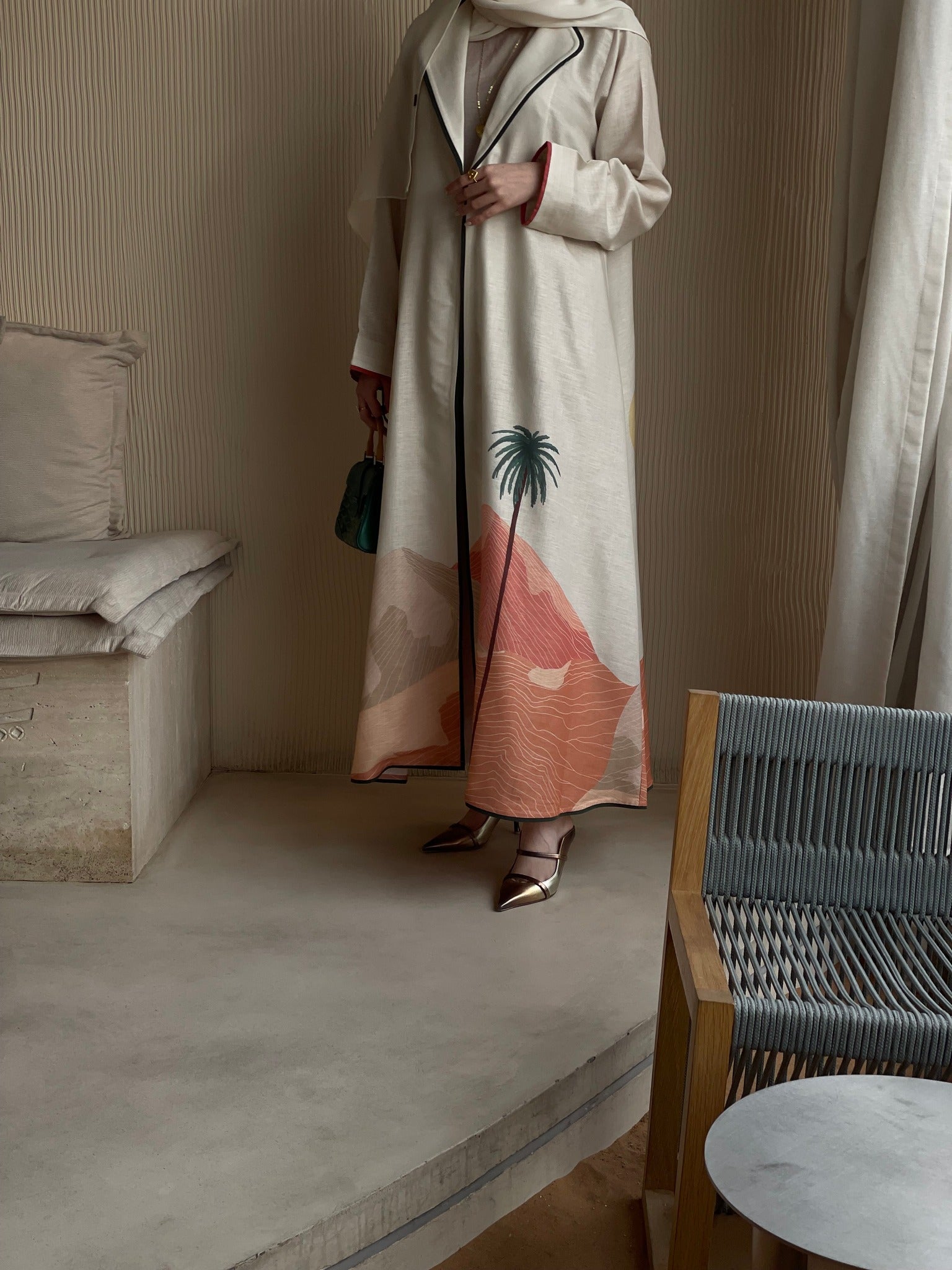 عباية من قماش اللينن الشفاف قليلا مرسومة بطباعة يدوية عليها