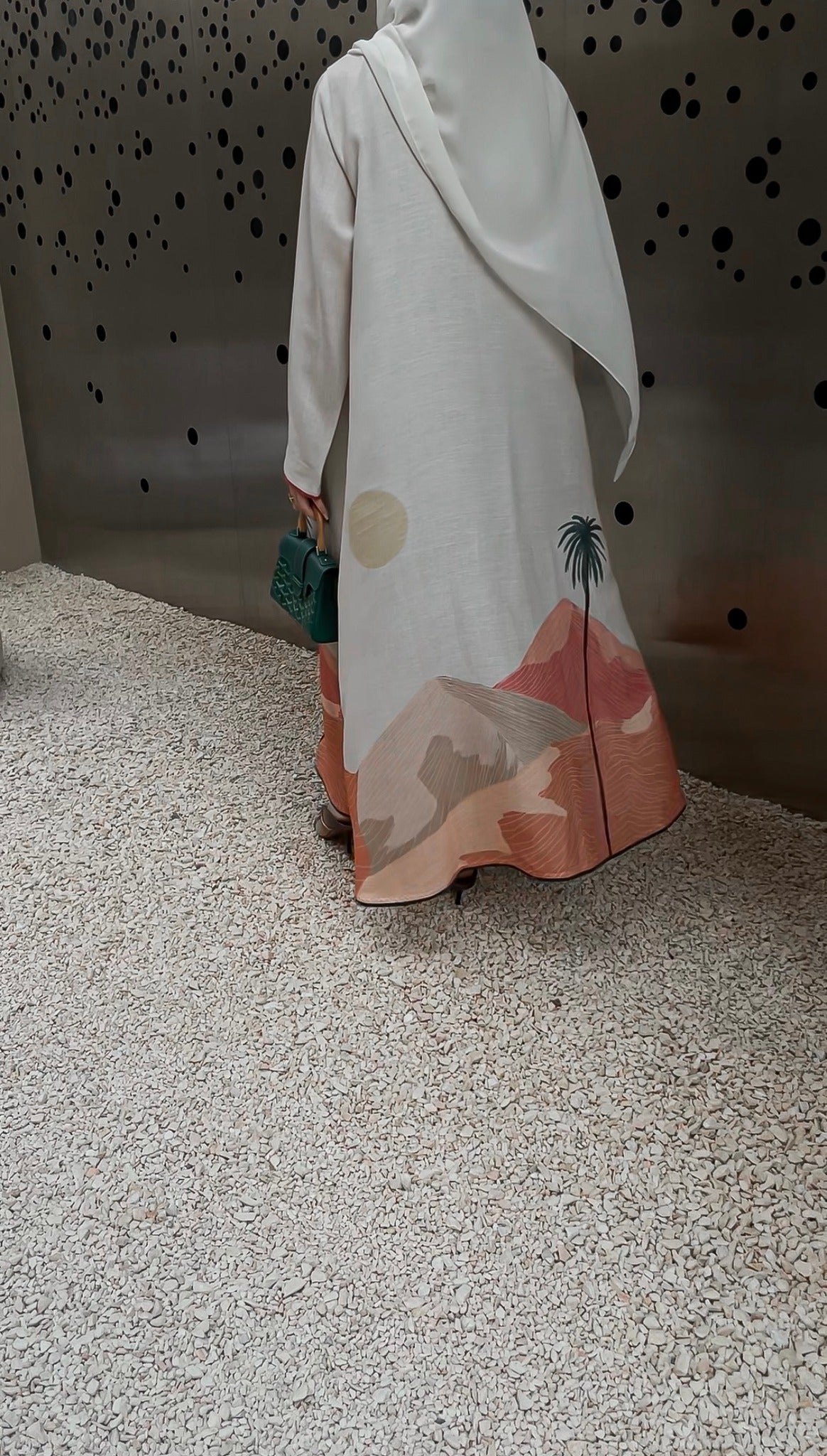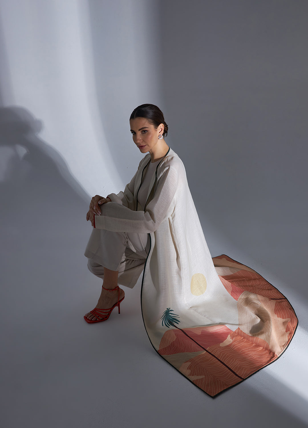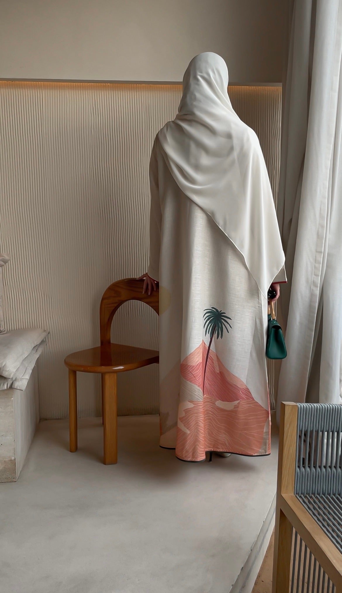 عباية من قماش اللينن الشفاف قليلا مرسومة بطباعة يدوية عليها