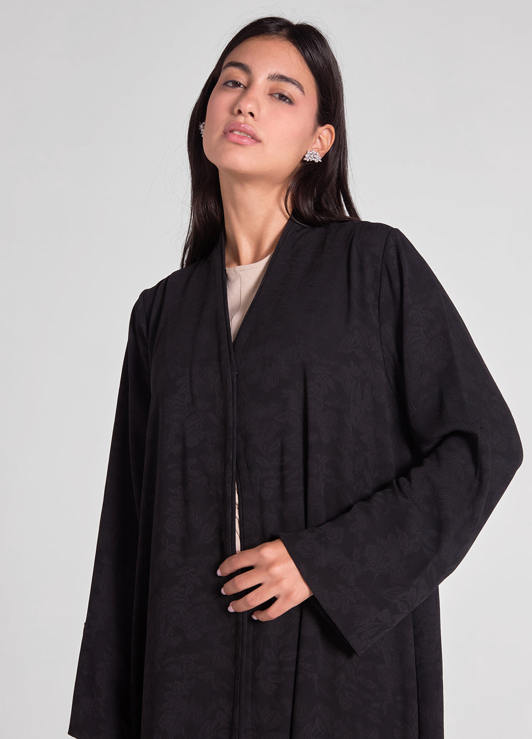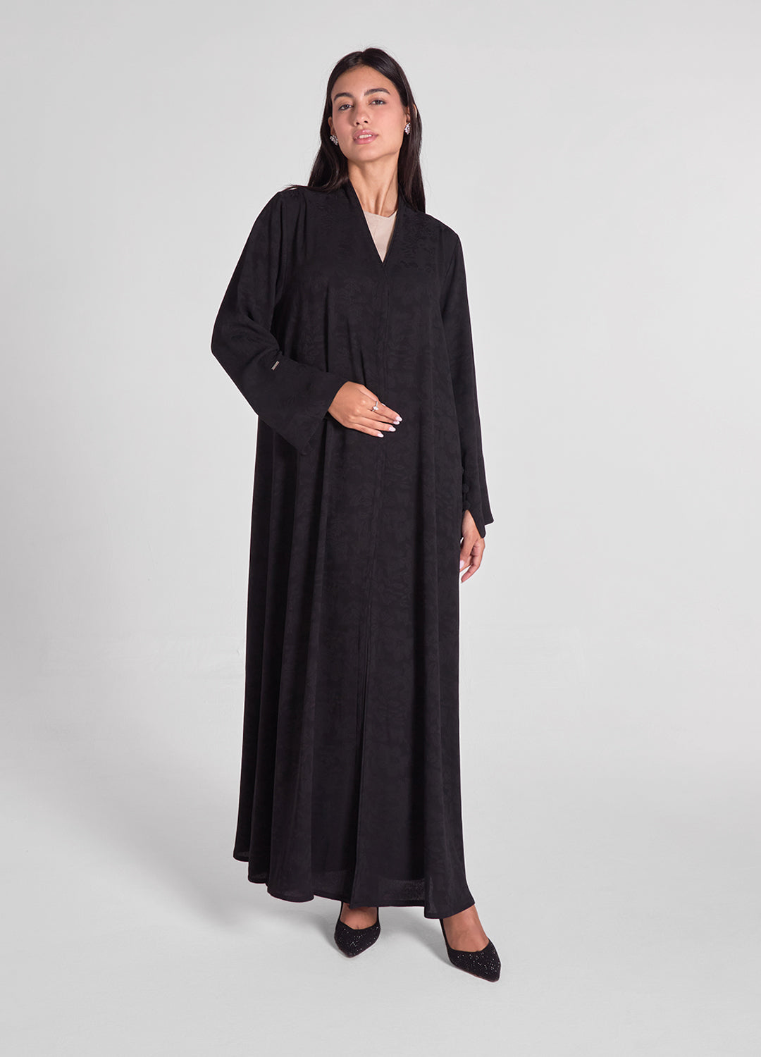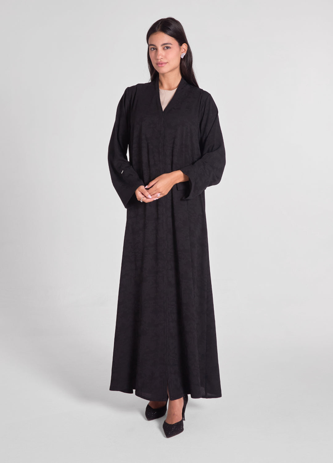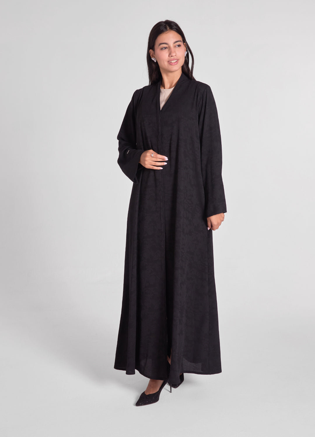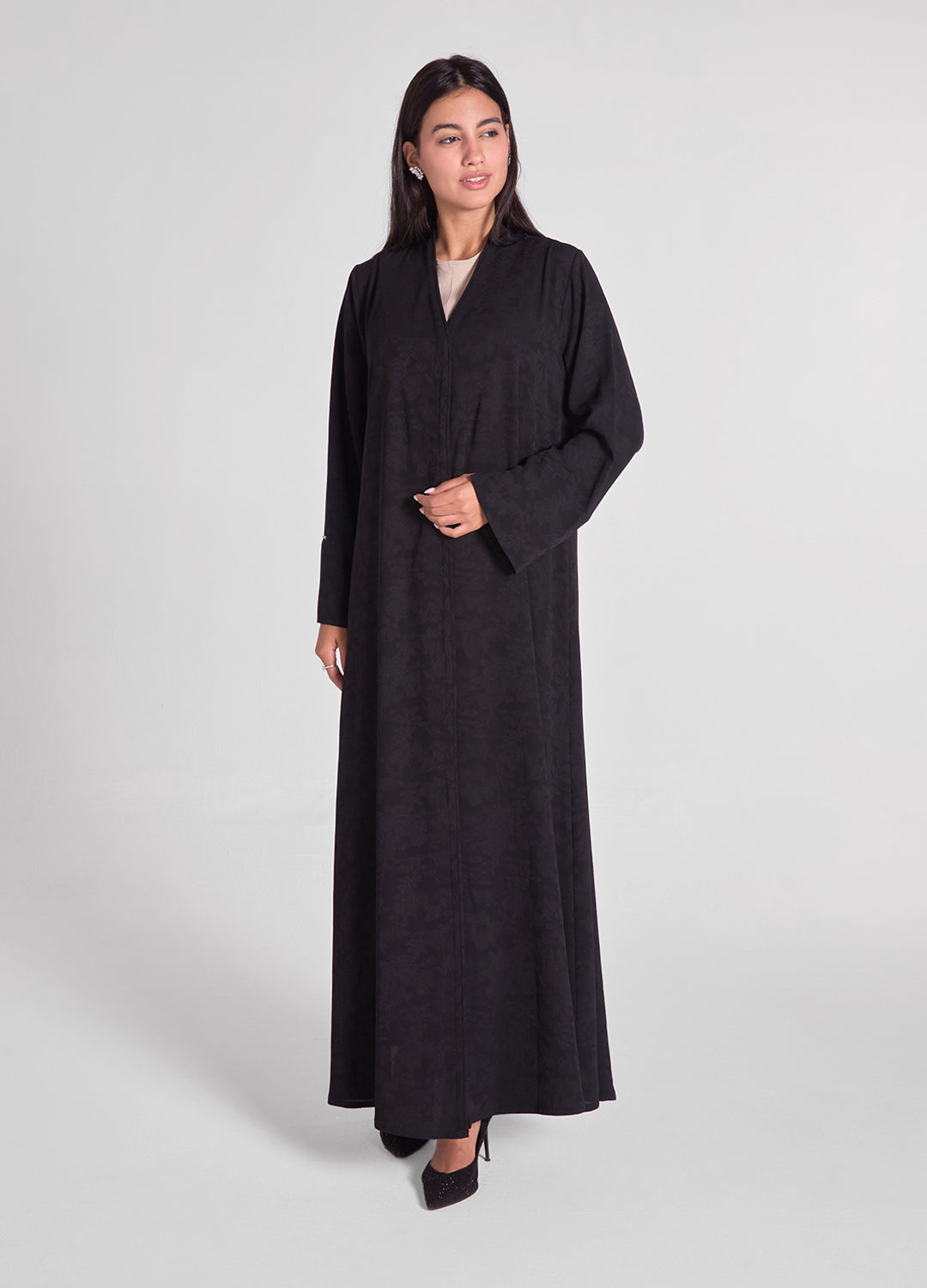 عباية من قماش الجرجيت المورد بطريقة هندسية و قصة أنيقة باللون الأسود