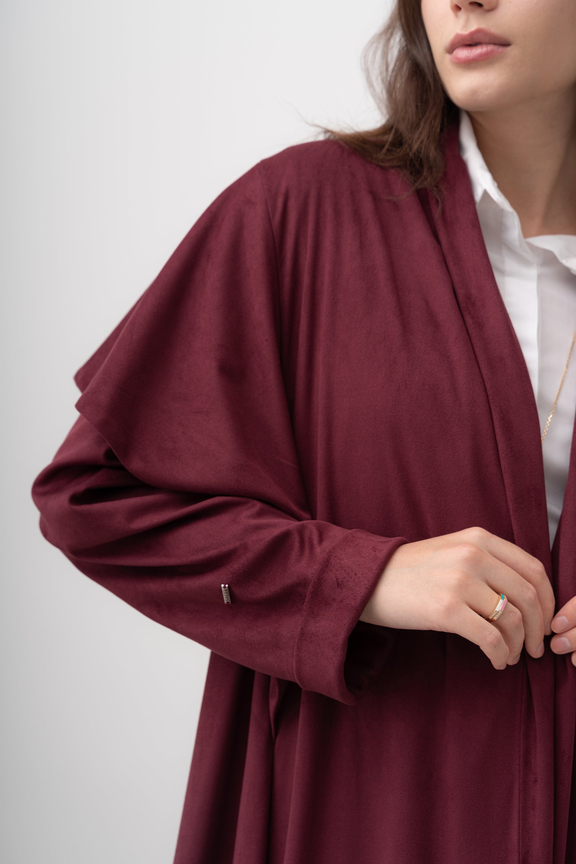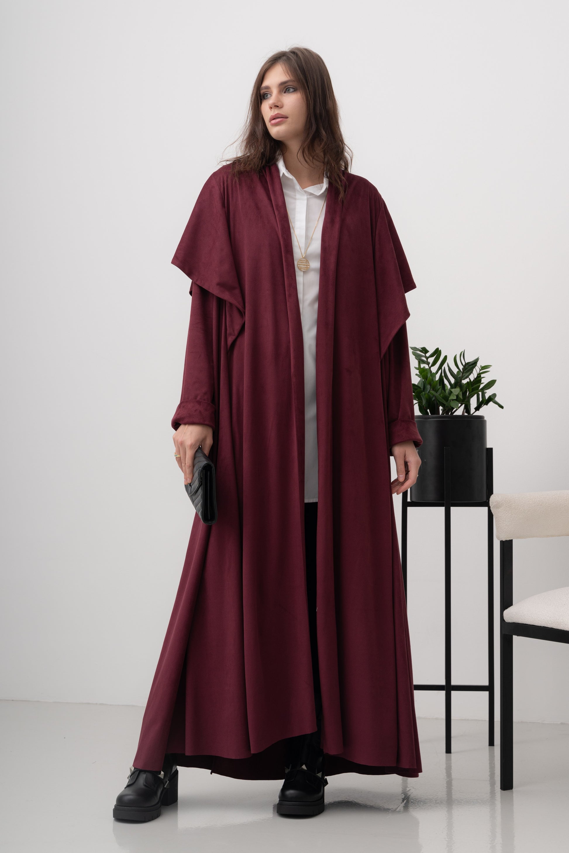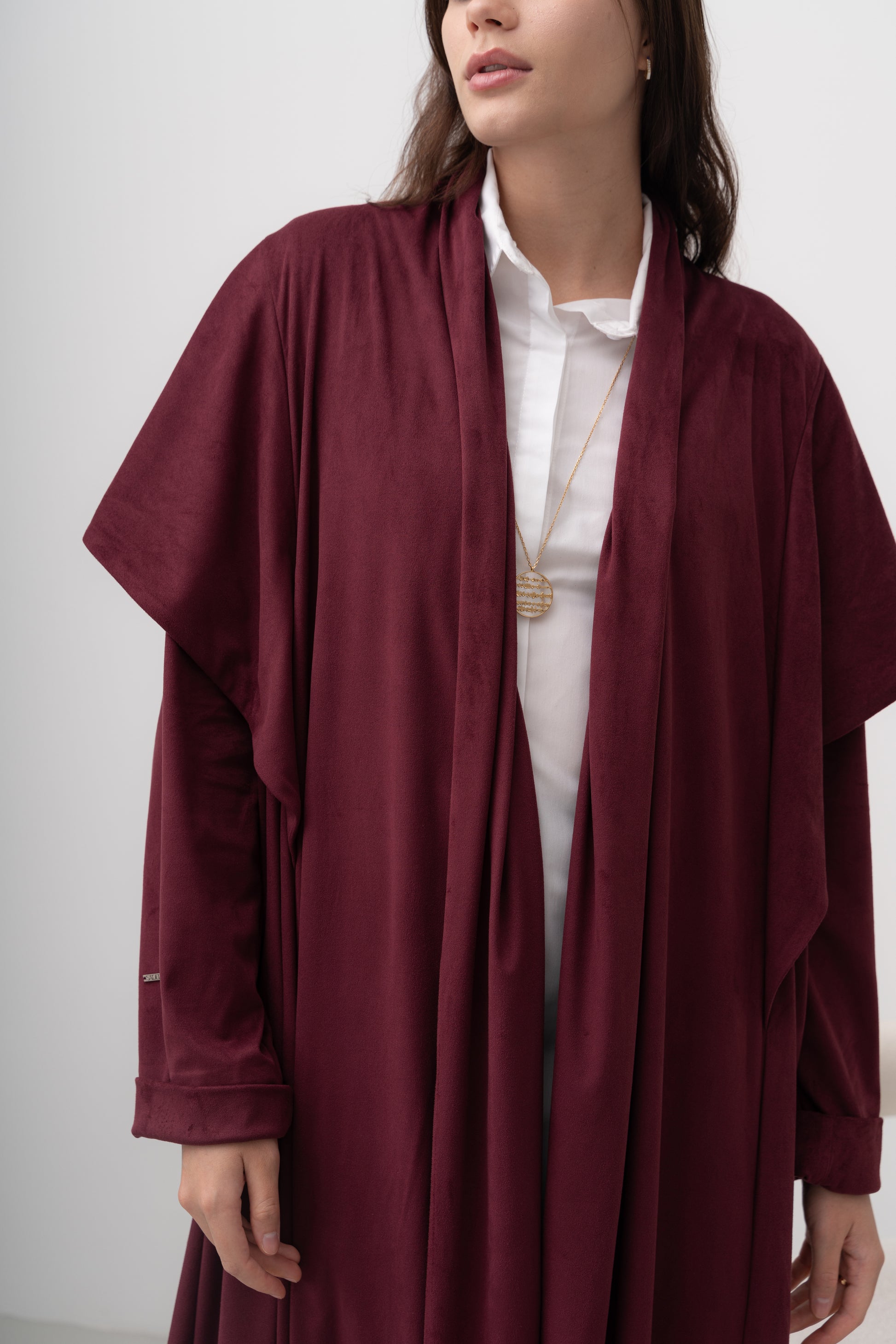 كوني كالشمس مضيئه ومليئه بالدفء بعباية سادل الفاخرة وكأنها معطف مصنوعه من قماش الفلفت الشامواه ممزوجه بقصه ولون لاطلالة جذابة وشرقية اخترناها باللون الخمري