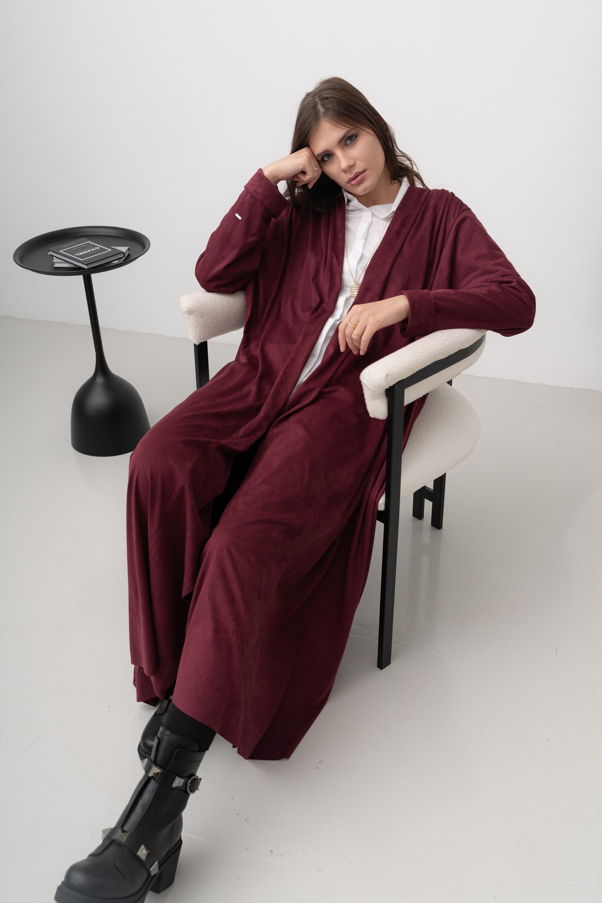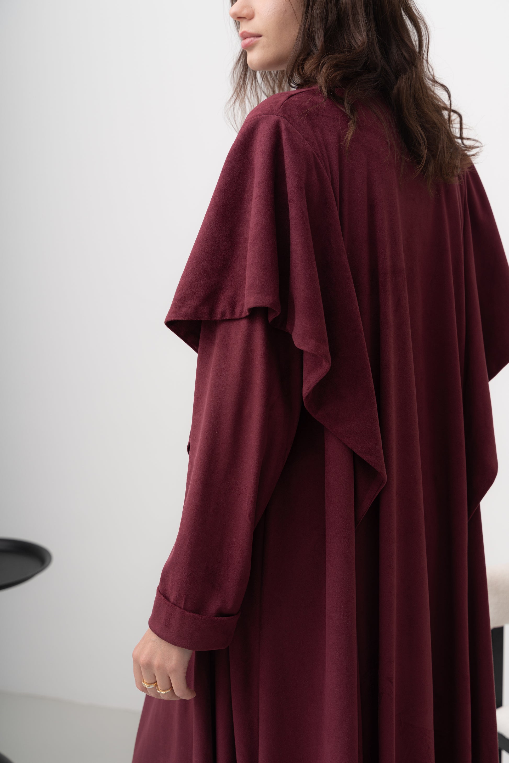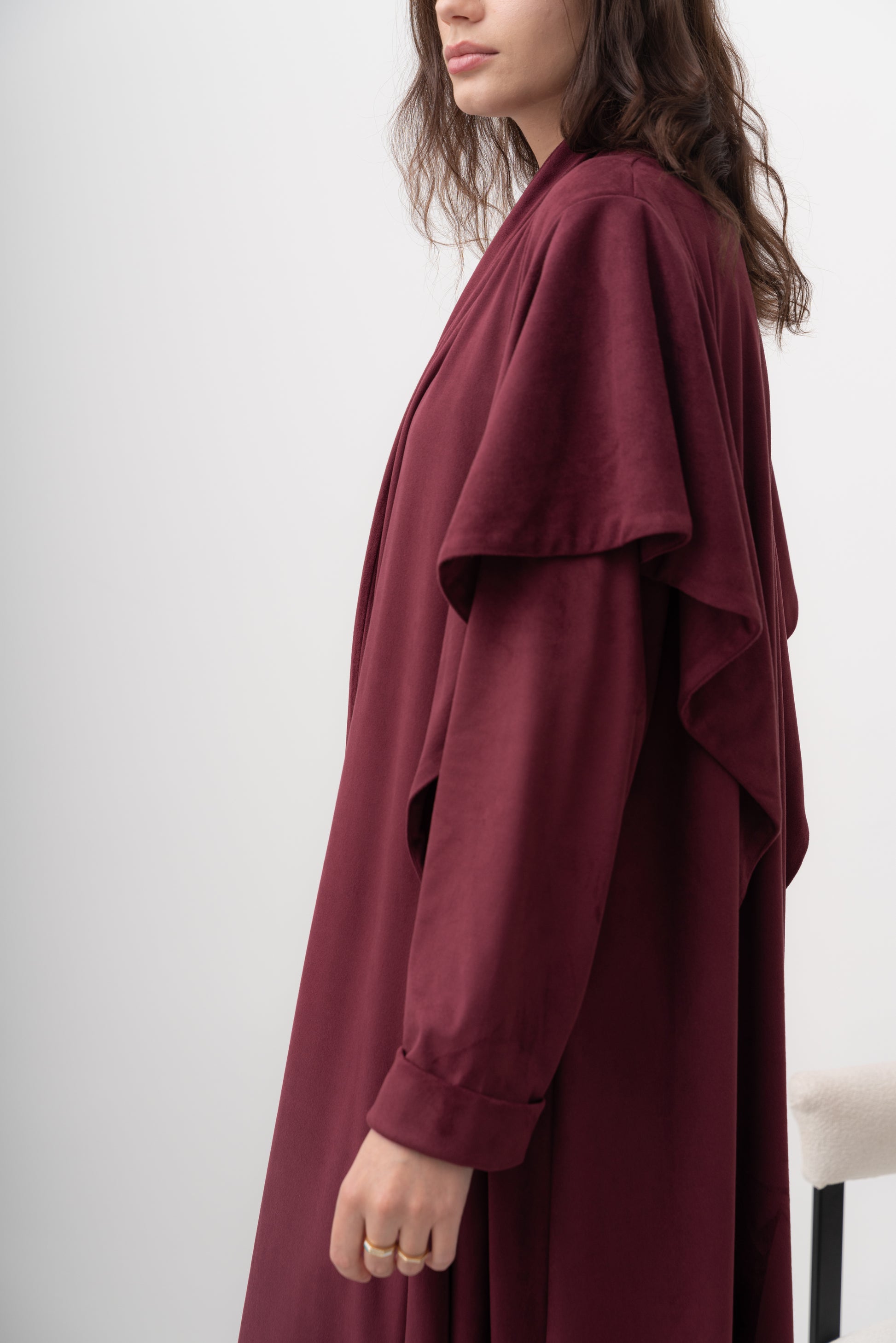 كوني كالشمس مضيئه ومليئه بالدفء بعباية سادل الفاخرة وكأنها معطف مصنوعه من قماش الفلفت الشامواه ممزوجه بقصه ولون لاطلالة جذابة وشرقية اخترناها باللون الخمري