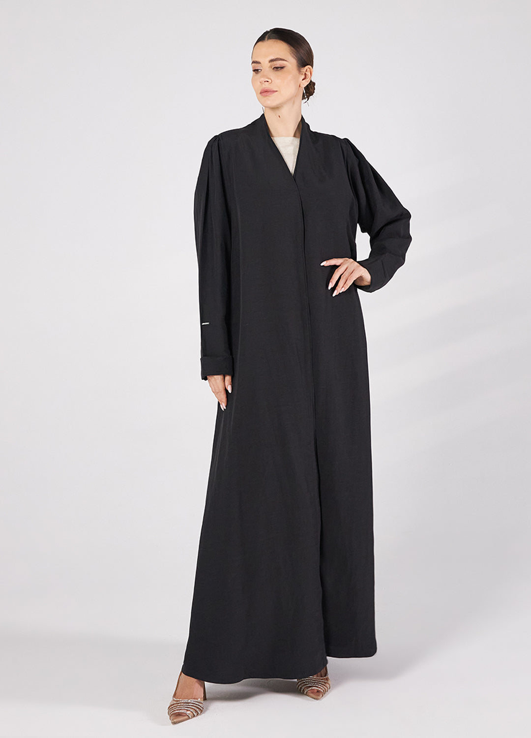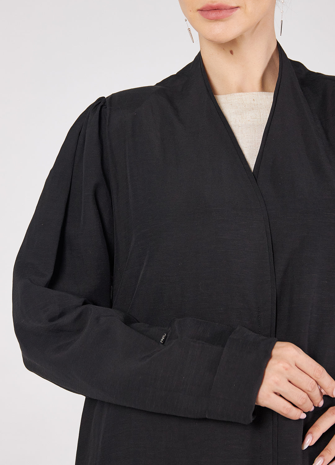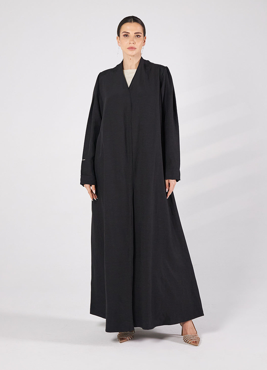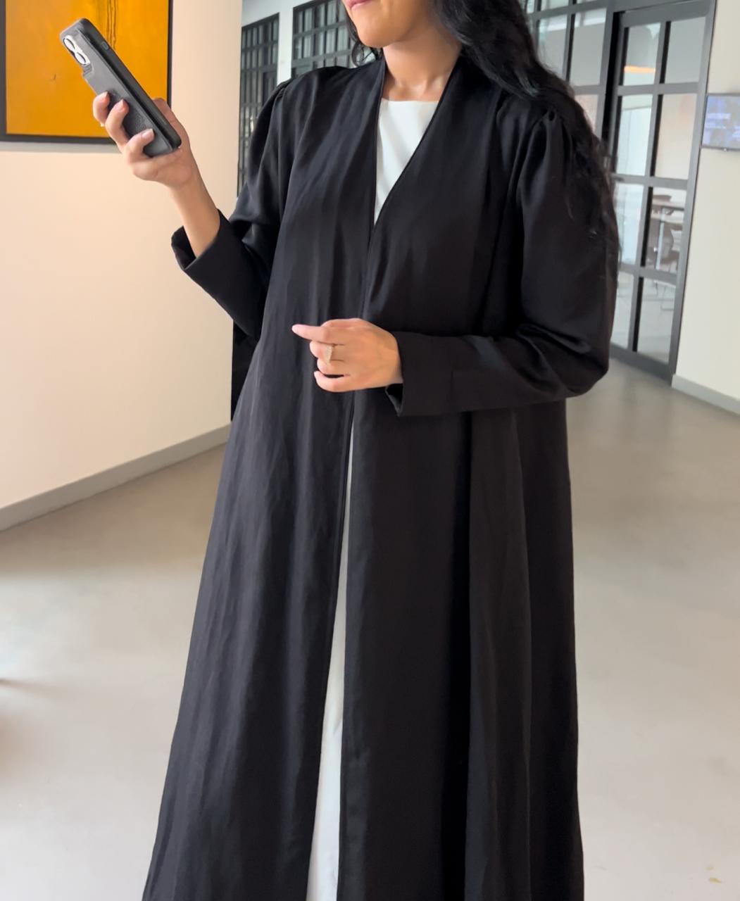 عباية فاخرة من قماش ممزوج من اللينن و الفيسكوس باحساس رائع من الأسود مع ياقة مرتفعة و قصة كم أنيقة .