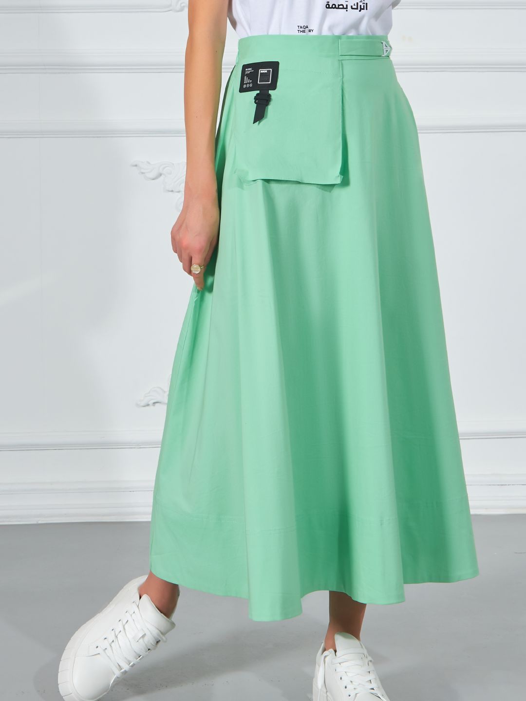 تنورة طويلة من قماش قطن مخلوط ليعطي احساس كاجول بارد و منعش , مزين باكسسوار جانبي أنيق