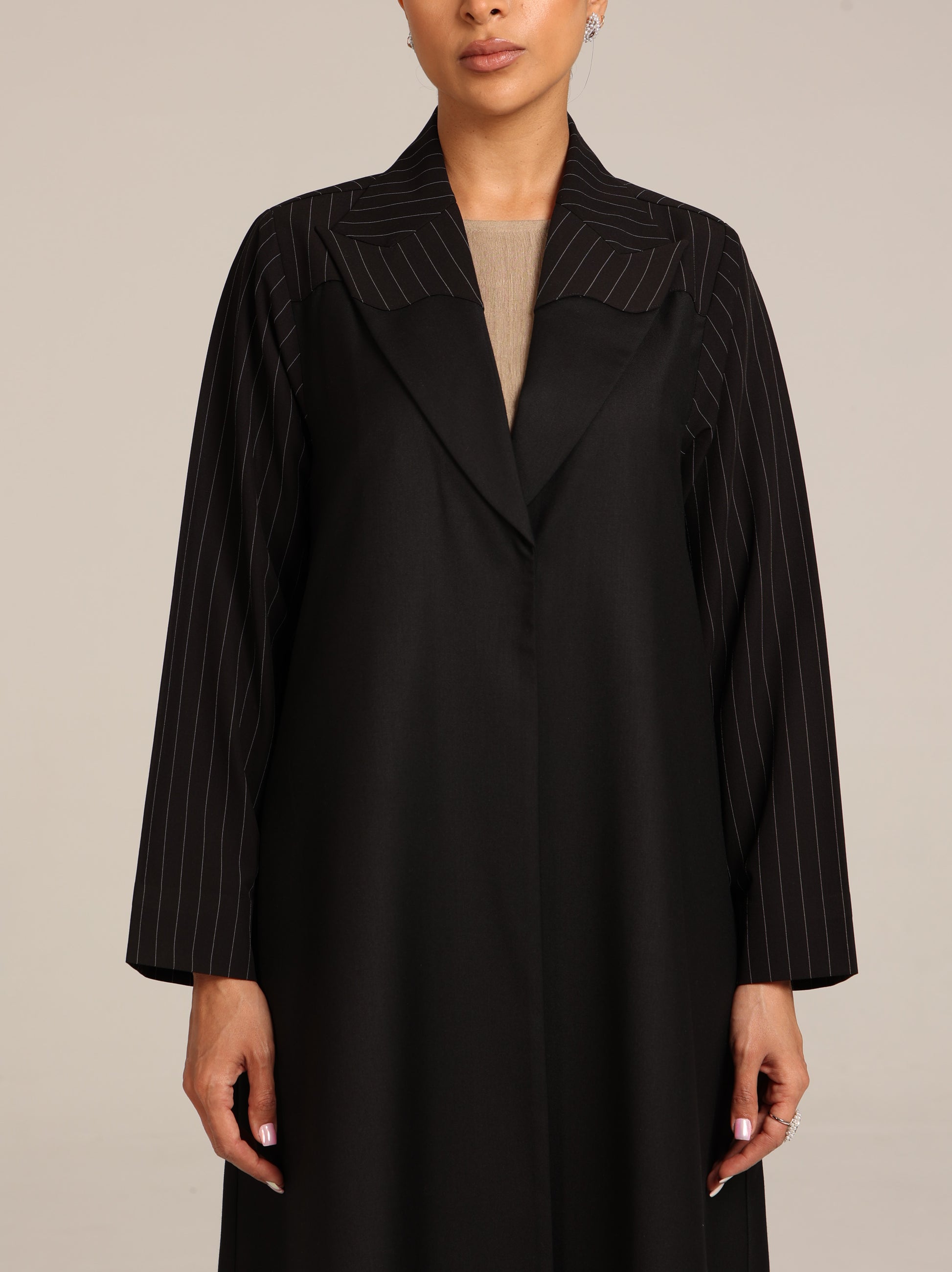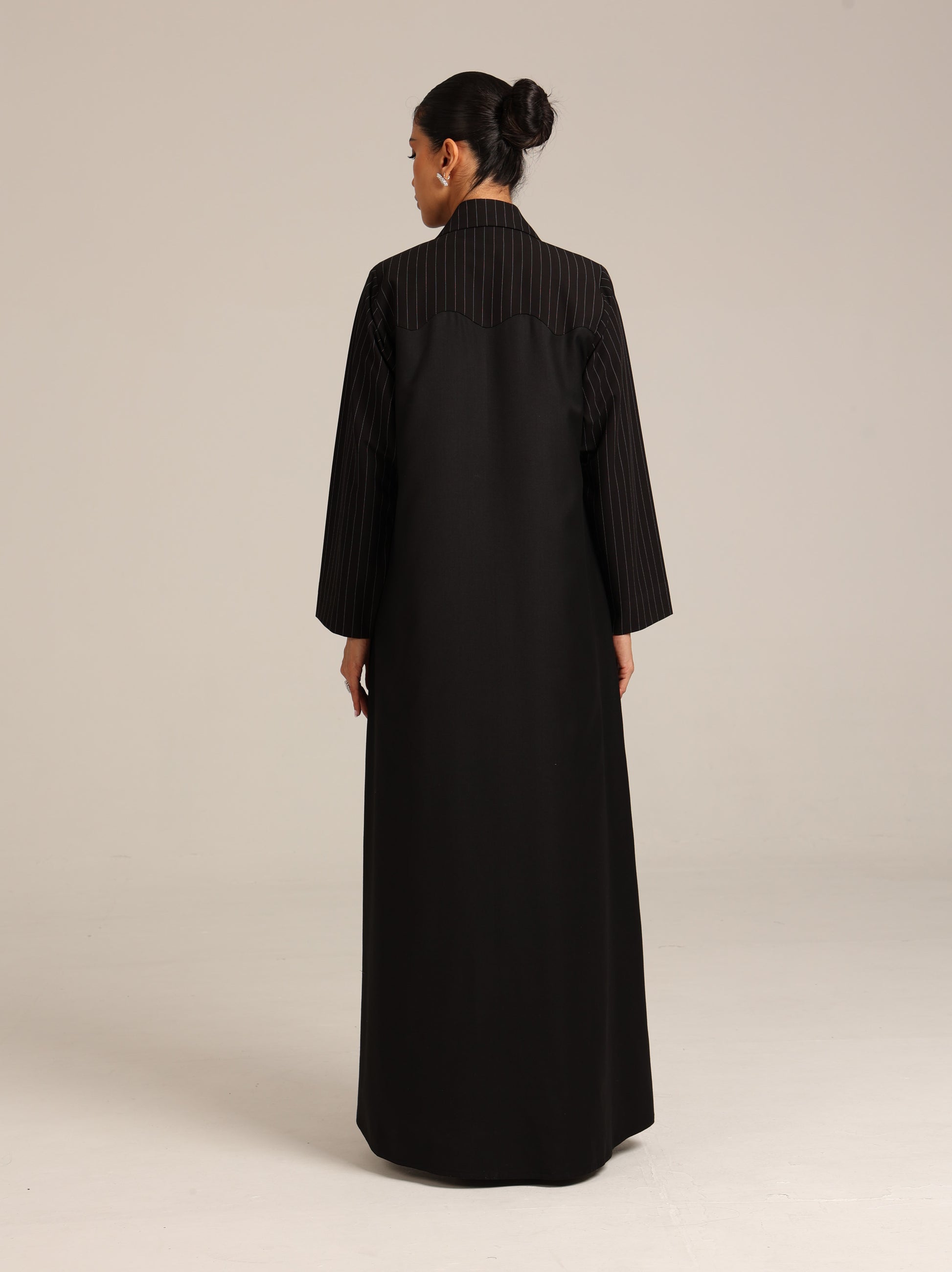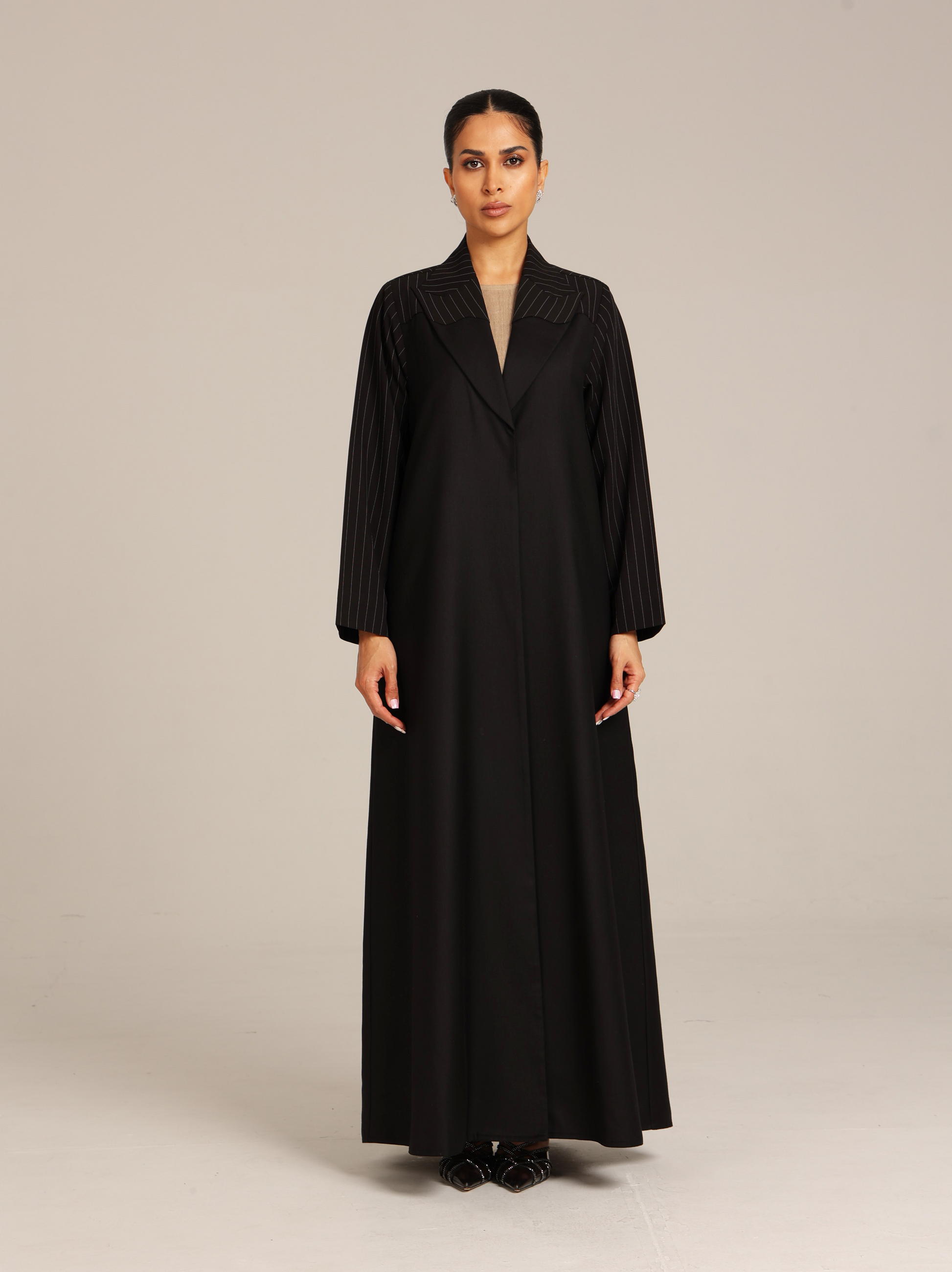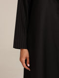 عباية من قماش تنسل أسباني أسود مع إضافة للكتف من قماش مخطط بتصميم أنيق و راقي