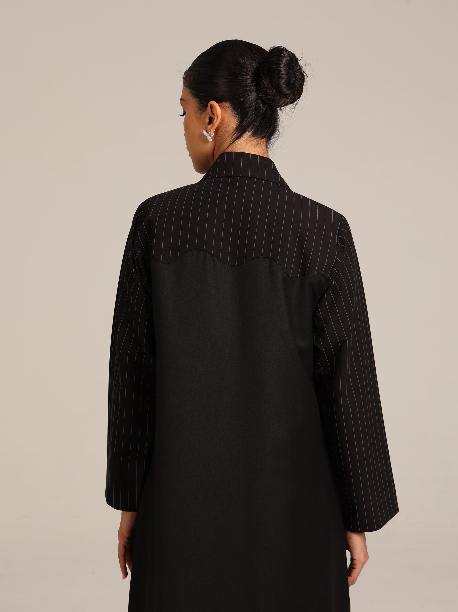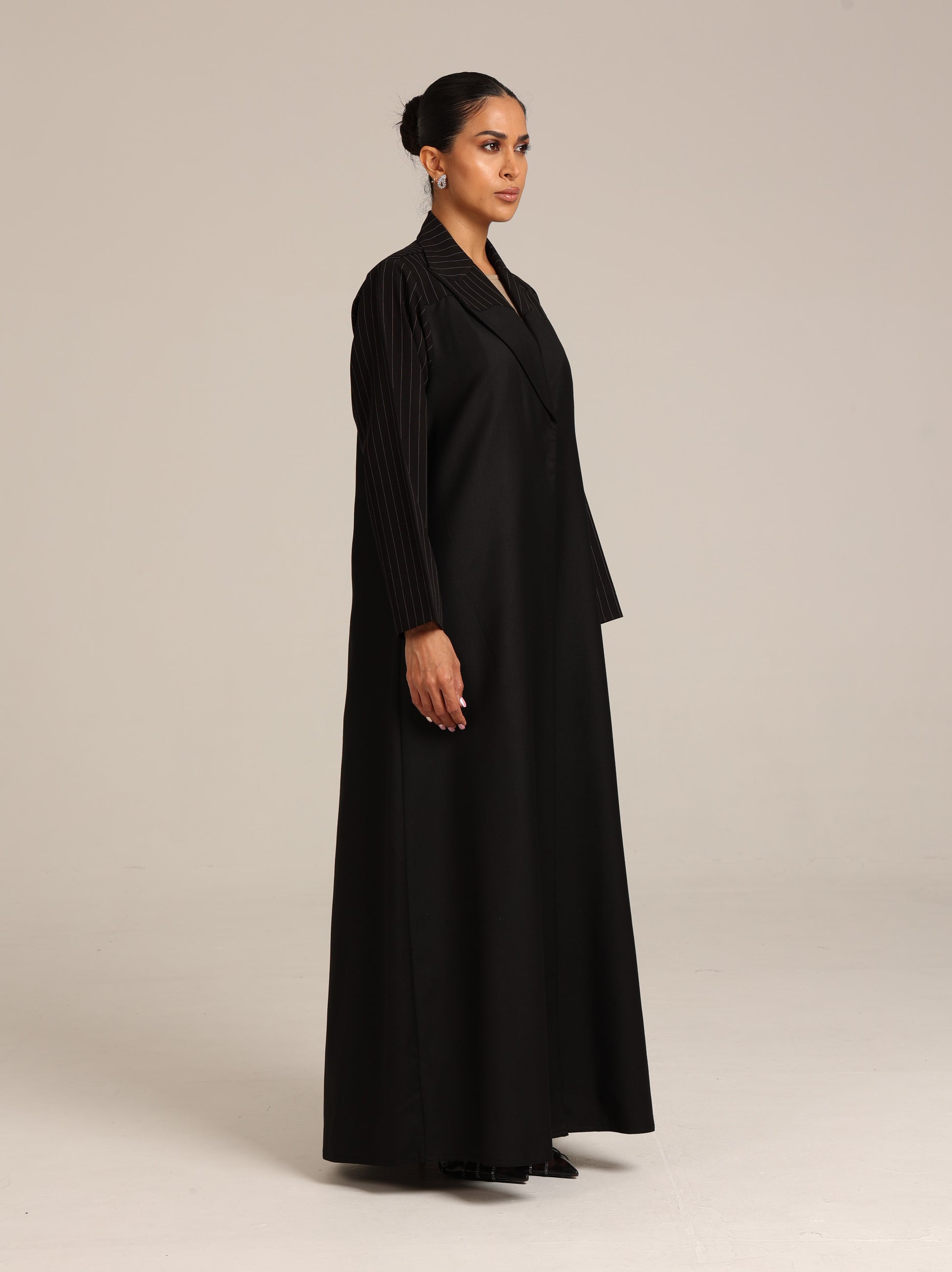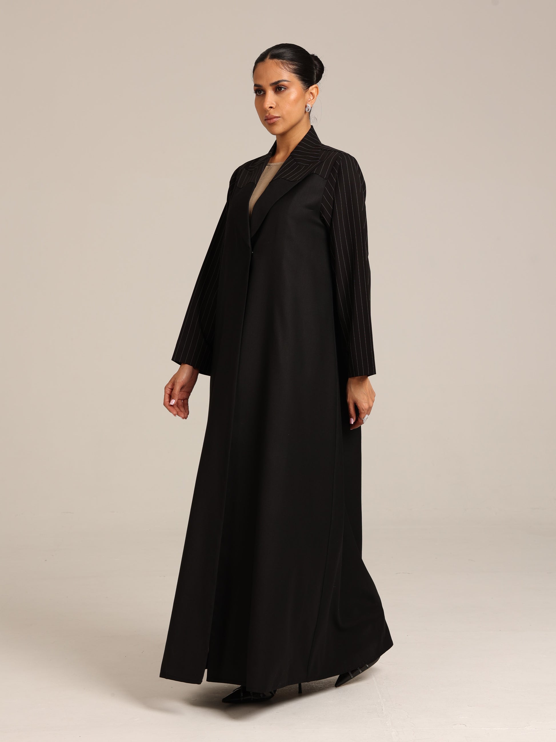 عباية من قماش تنسل أسباني أسود مع إضافة للكتف من قماش مخطط بتصميم أنيق و راقي