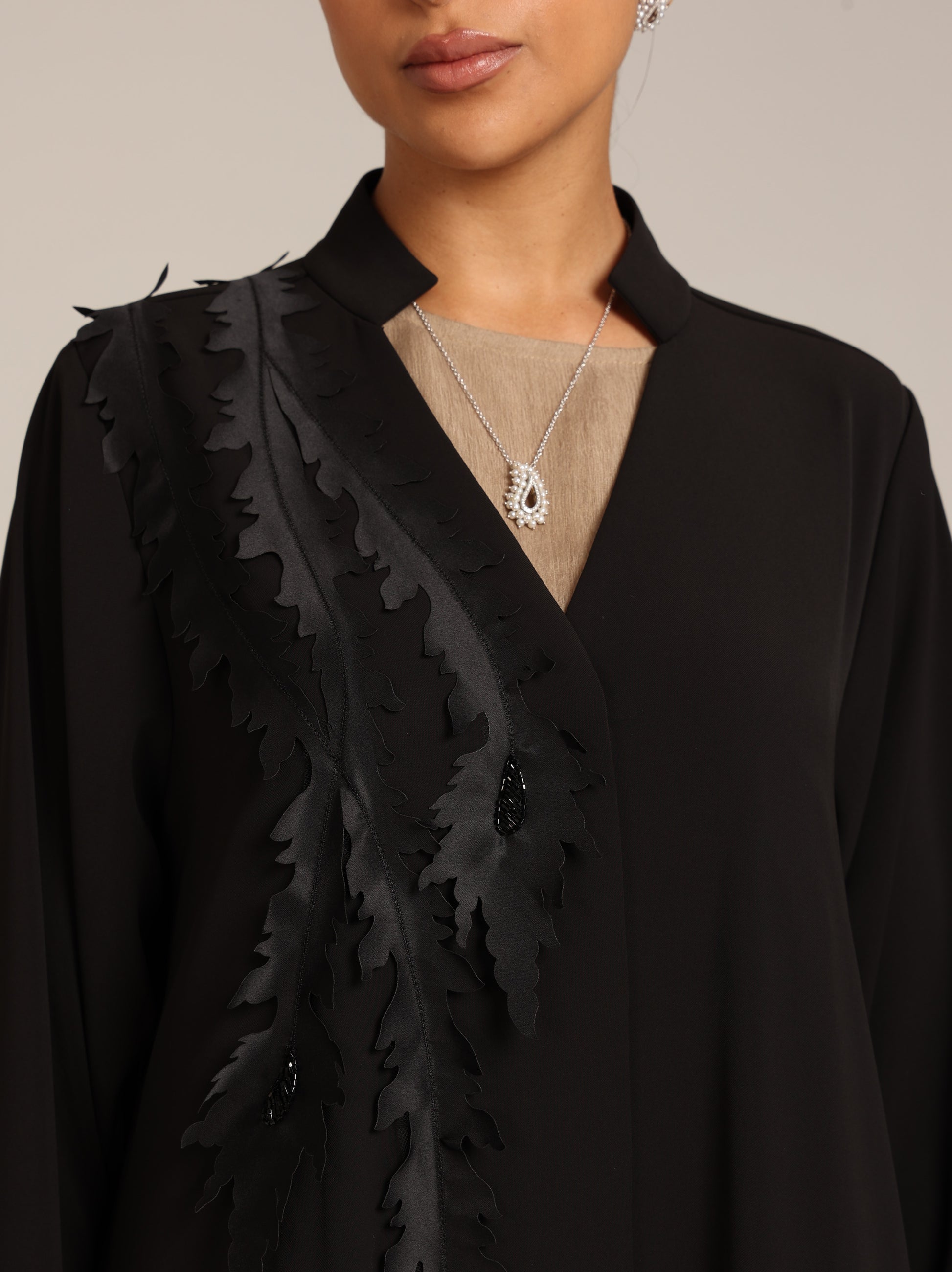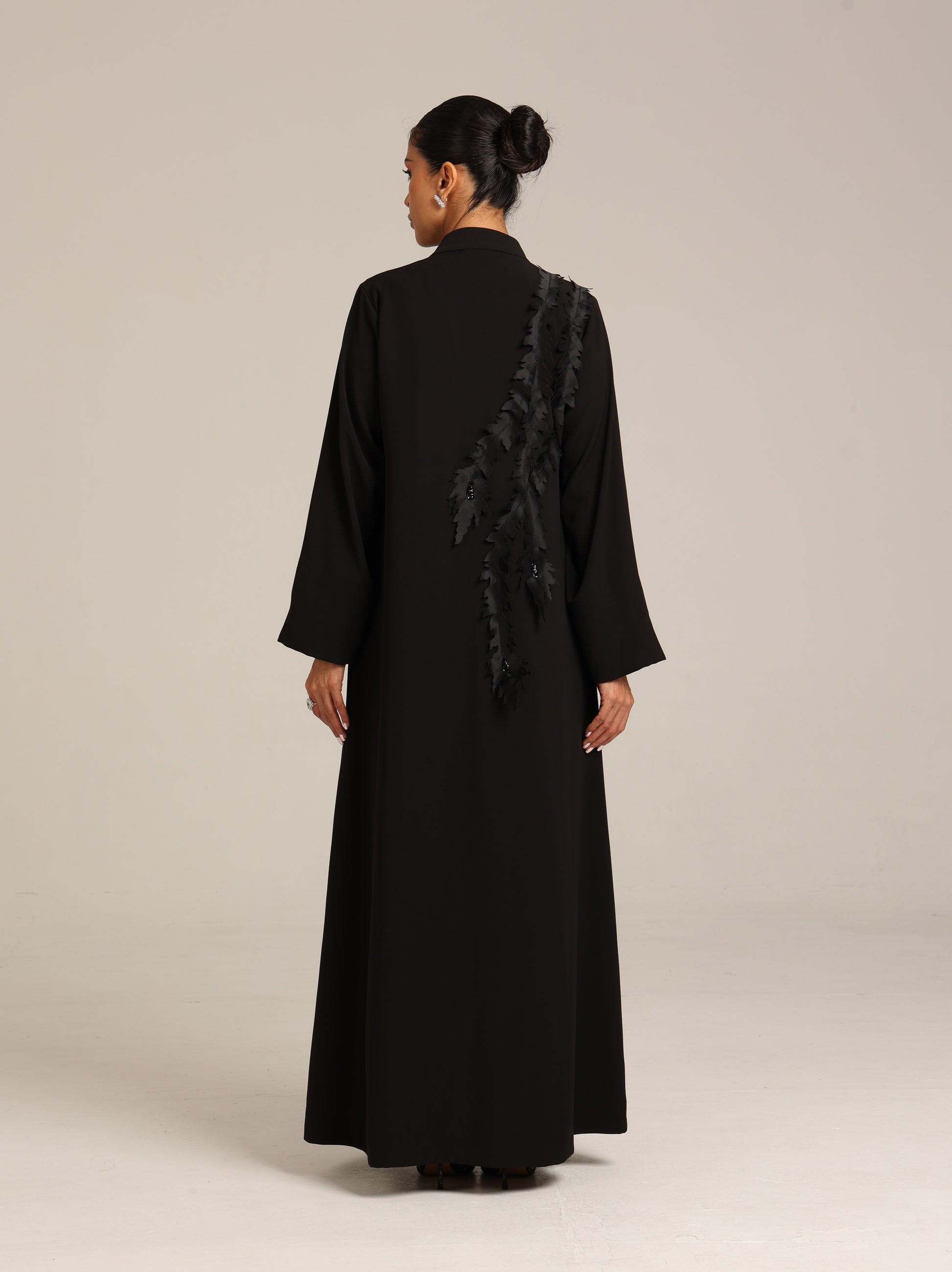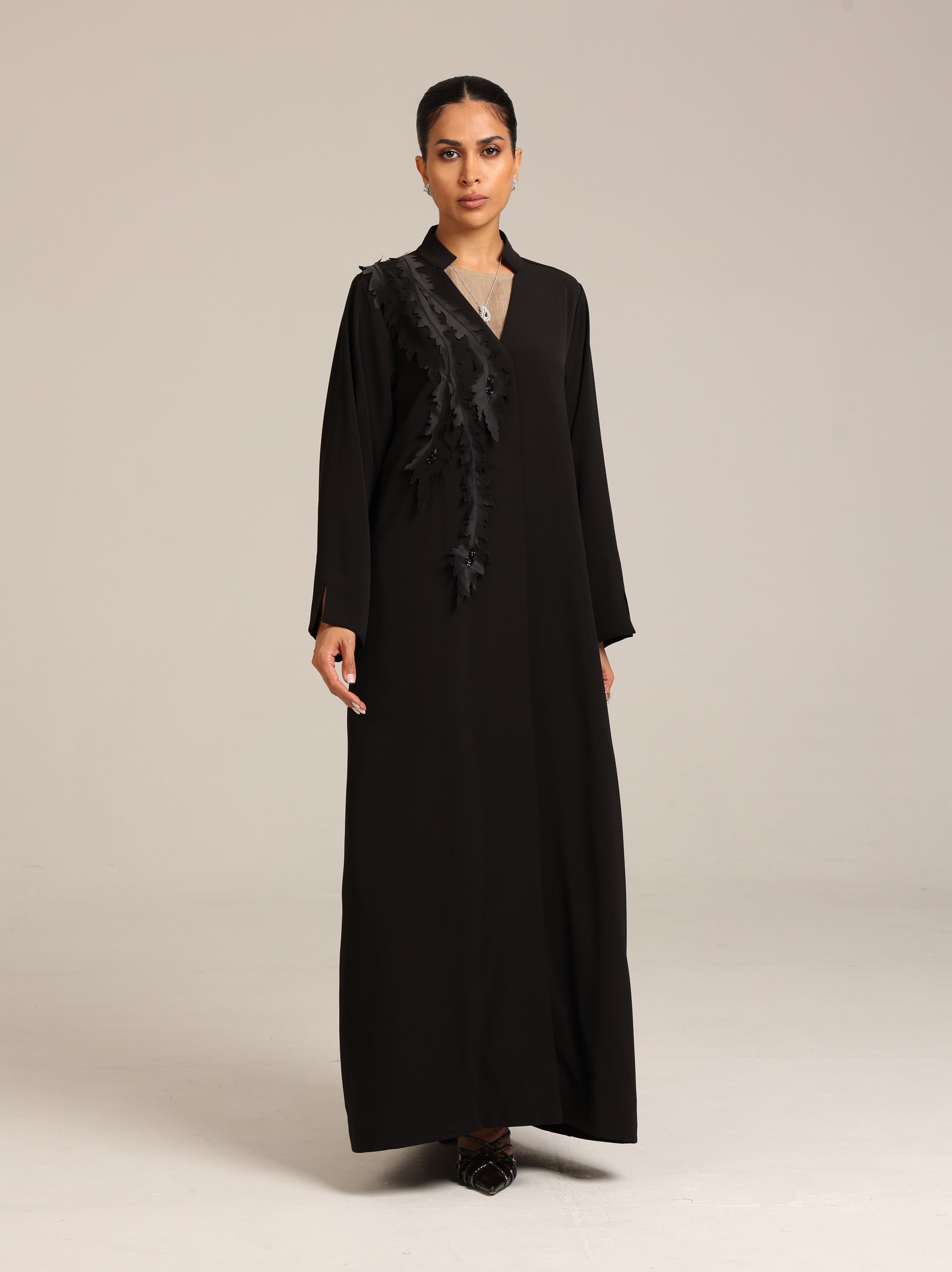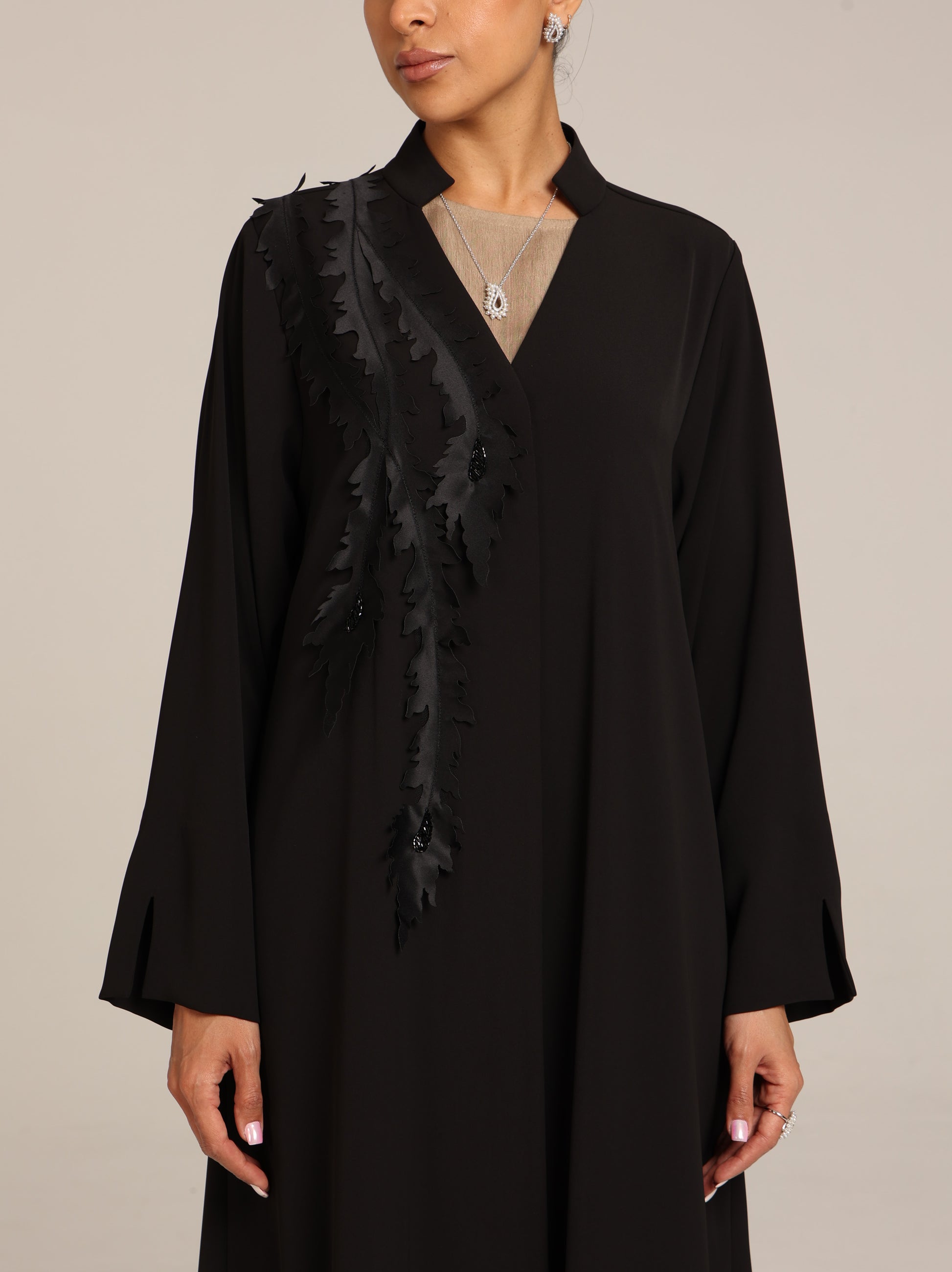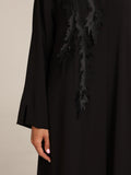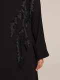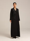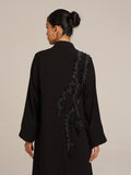 عباية من قماش تنسل أسباني أسود مزين بتصميم أنيق و مرصع من جهة واحدة بالخرز بطريقة أنيقة و راقية