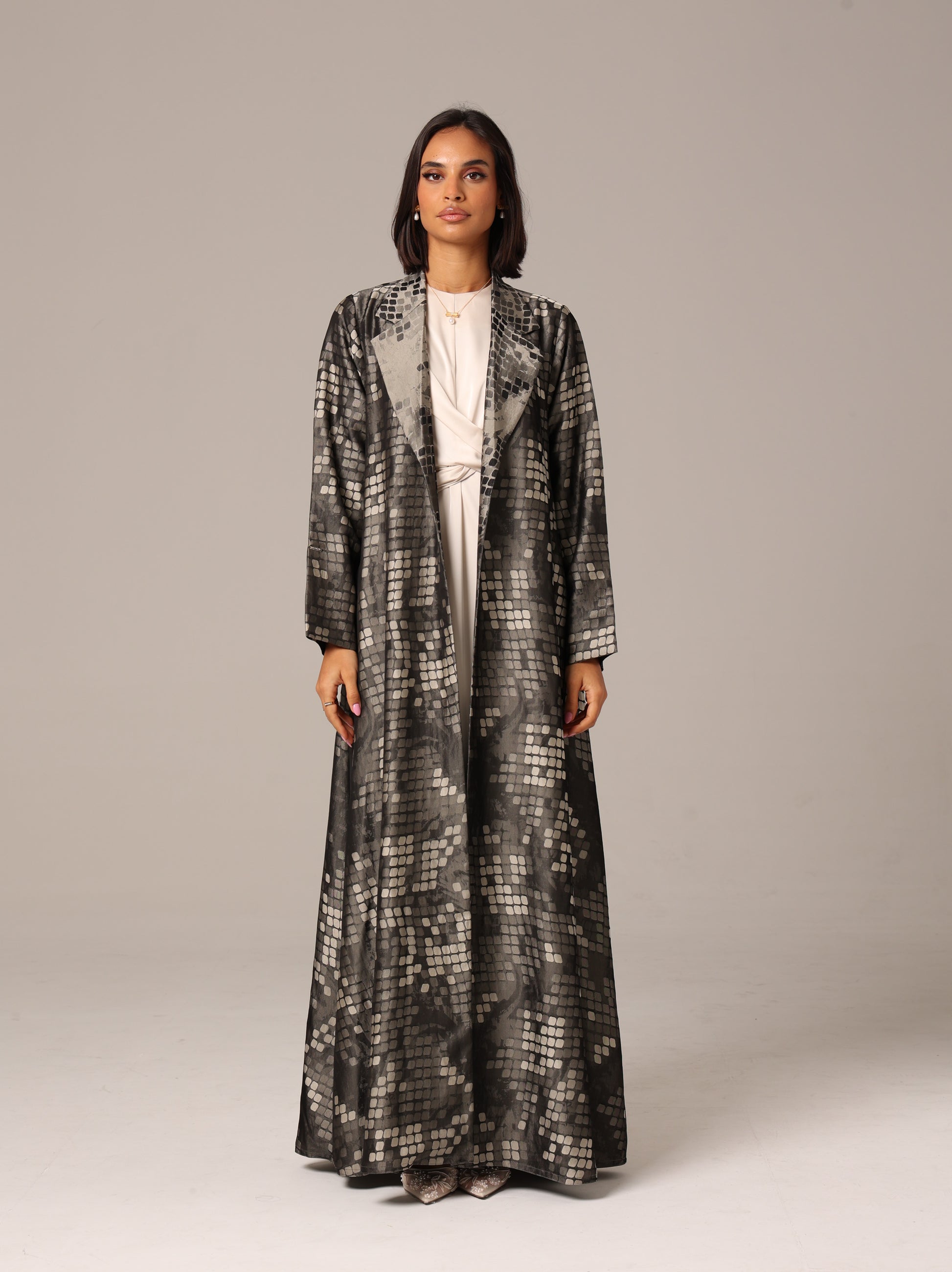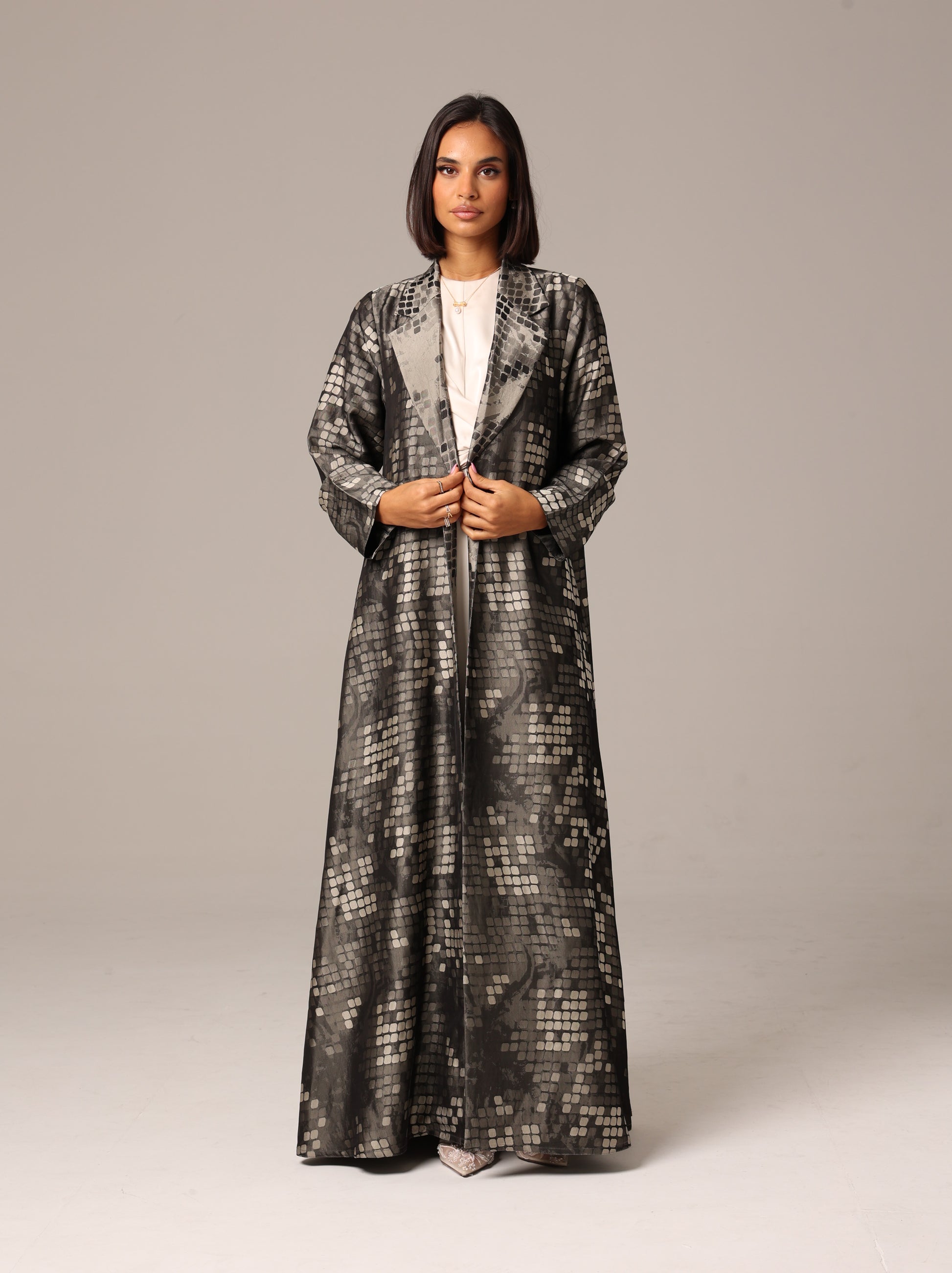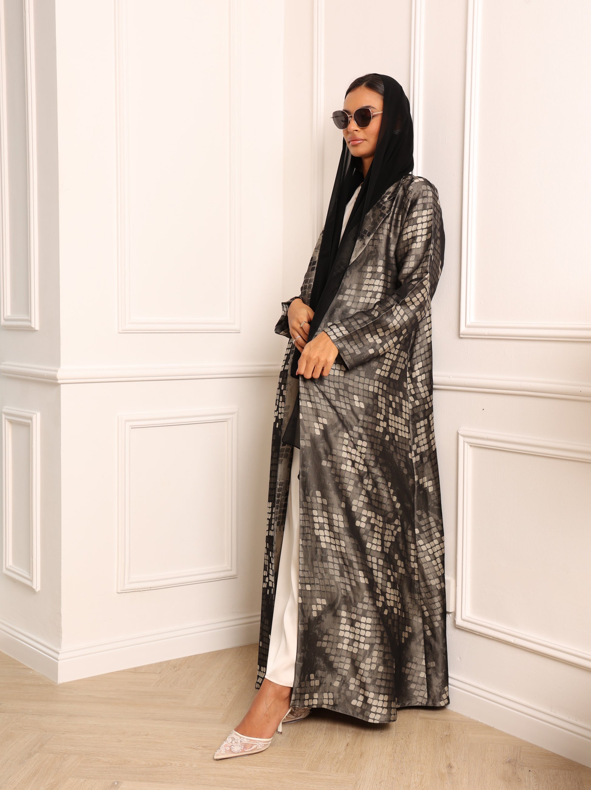 This abaya combines contemporary artistry with timeless elegance. Jacquard fabric adds a luxurious sheen, while the structured silhouette ensures a polished and poised look, ideal for any occasion.