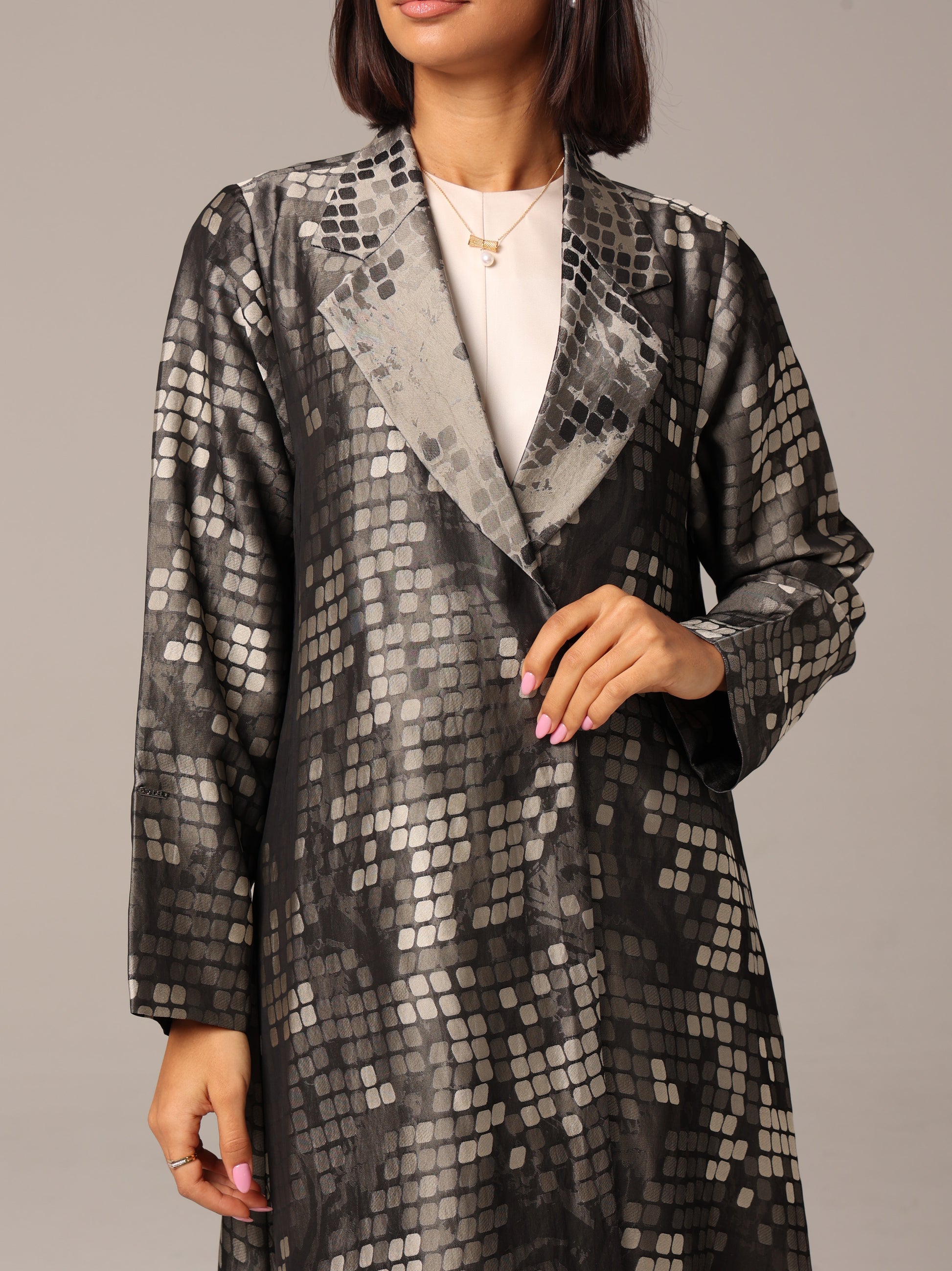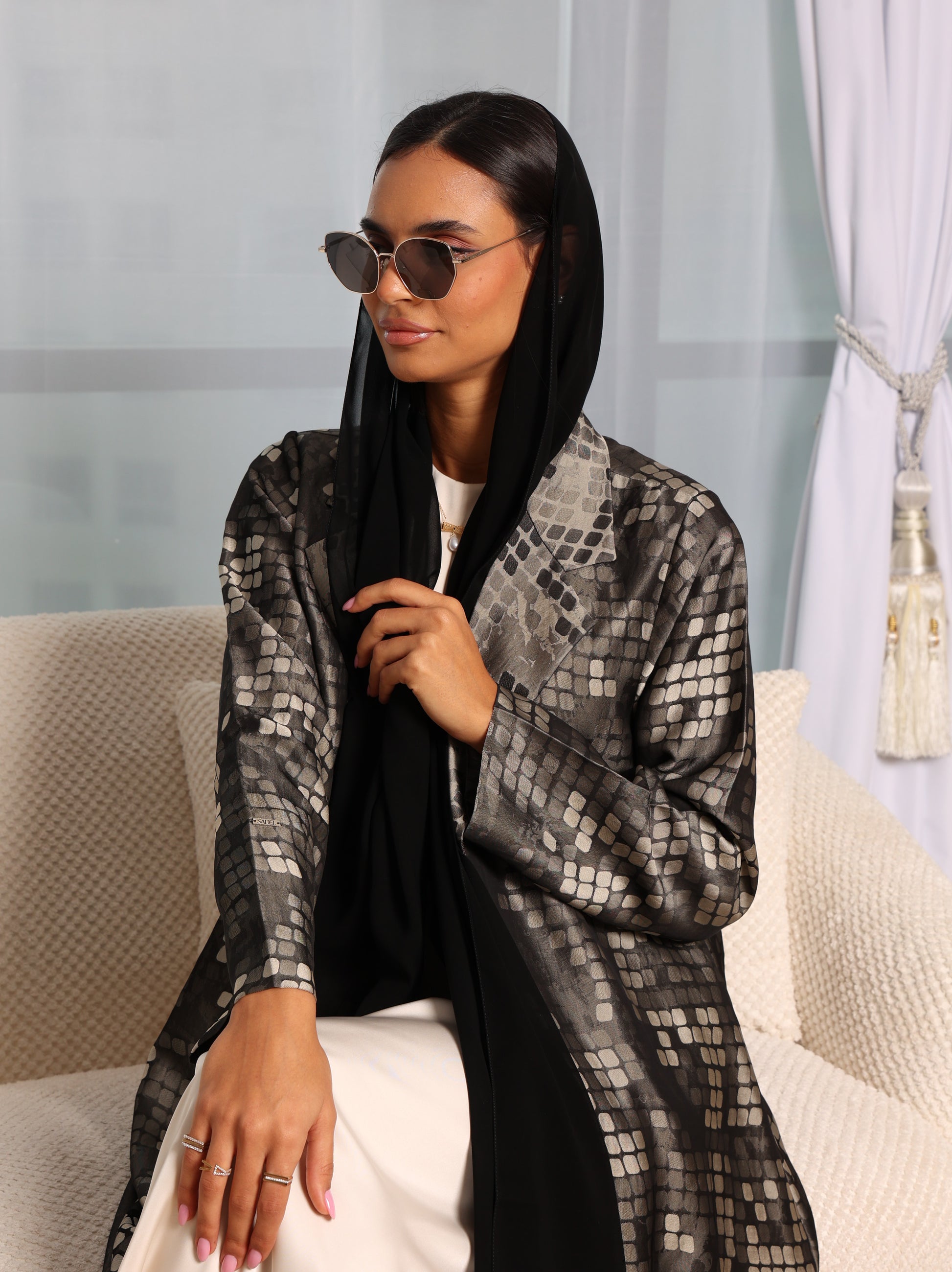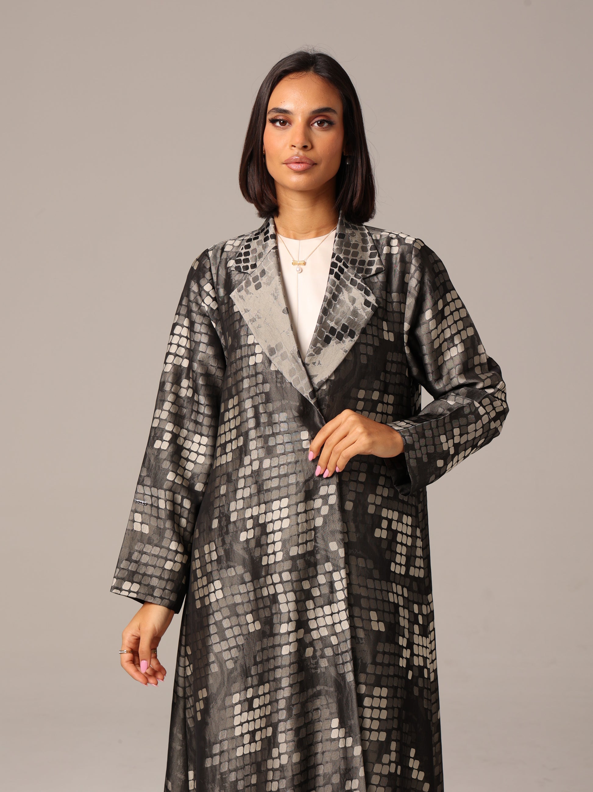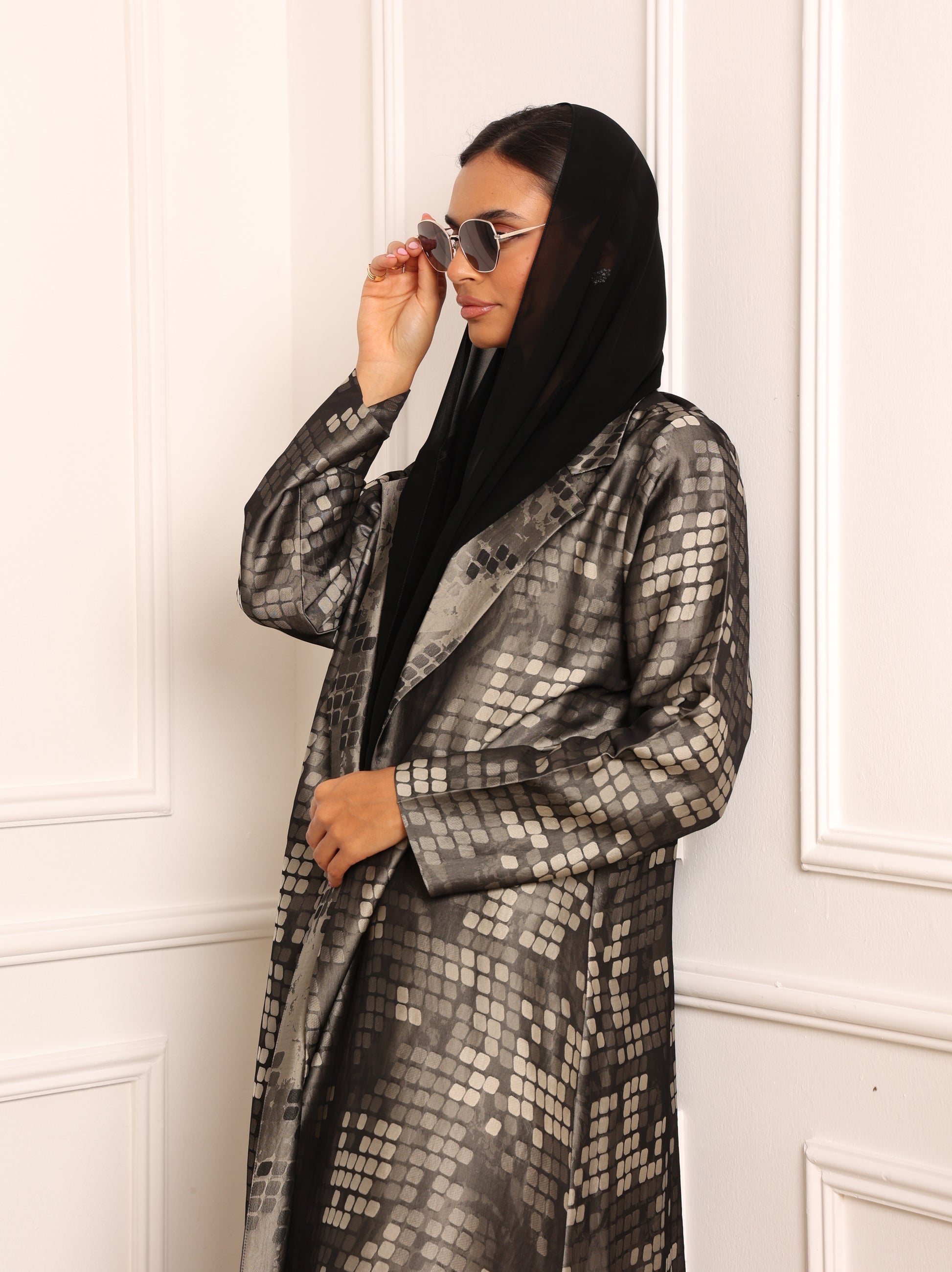 This abaya combines contemporary artistry with timeless elegance. Jacquard fabric adds a luxurious sheen, while the structured silhouette ensures a polished and poised look, ideal for any occasion.