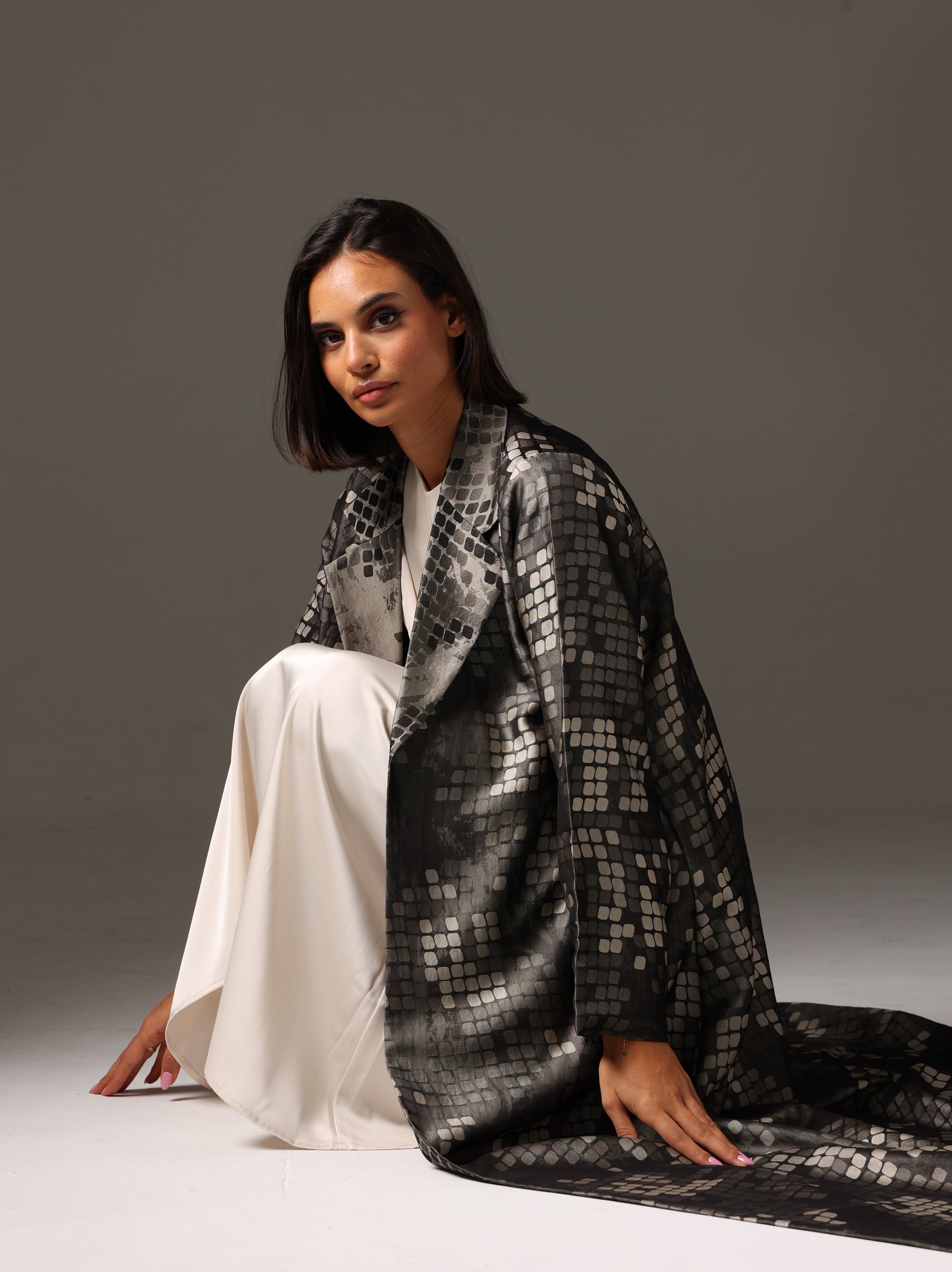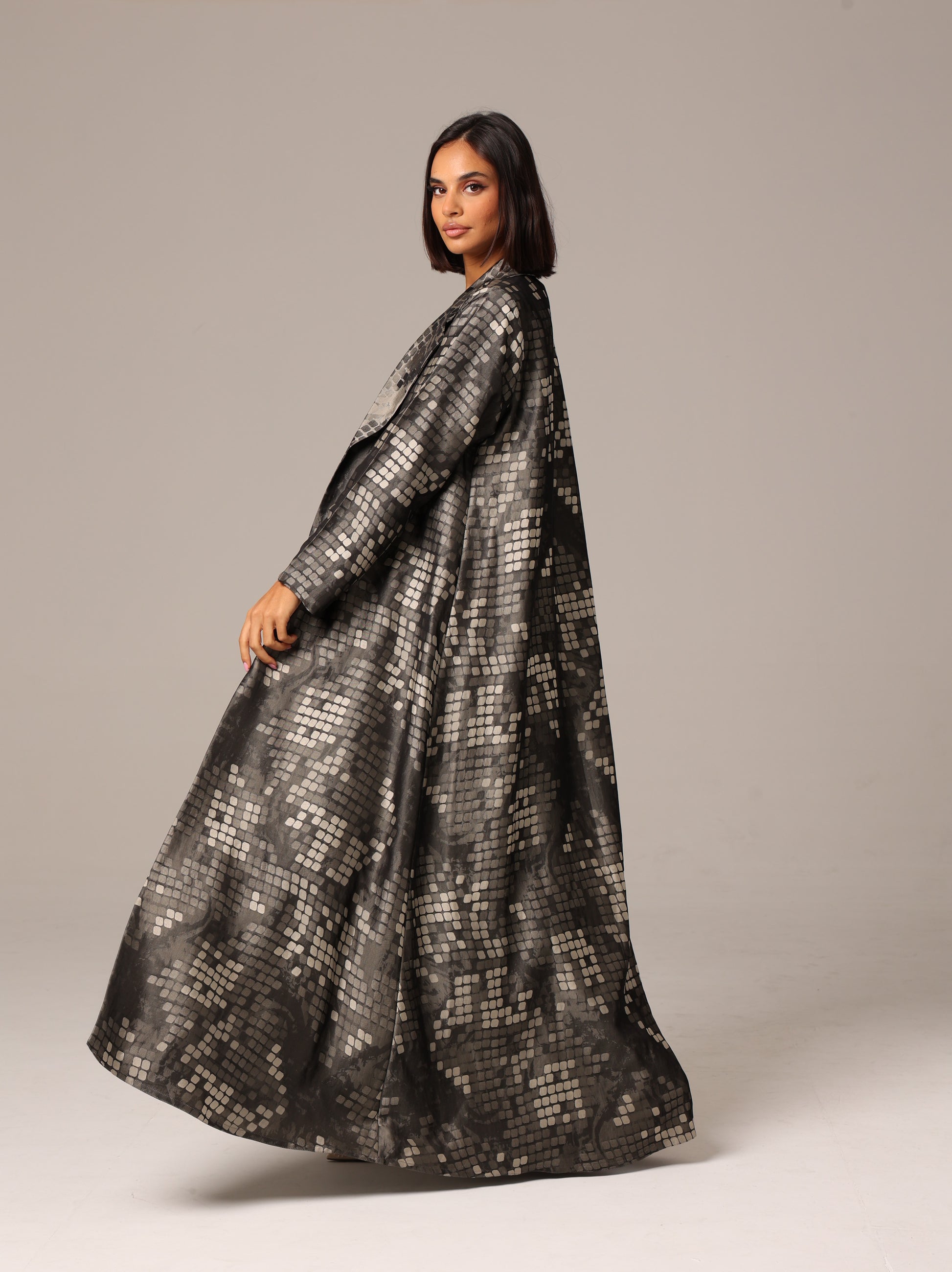 هذه العباءة تجمع بين الفن المعاصر والأناقة الخالدة. يضفي قماش الجاكار لمسة من والبريق، بينما يضمن التصميم الهيكلي إطلالة أنيقة وراقية، مما يجعلها مثالية لكل المناسبات.