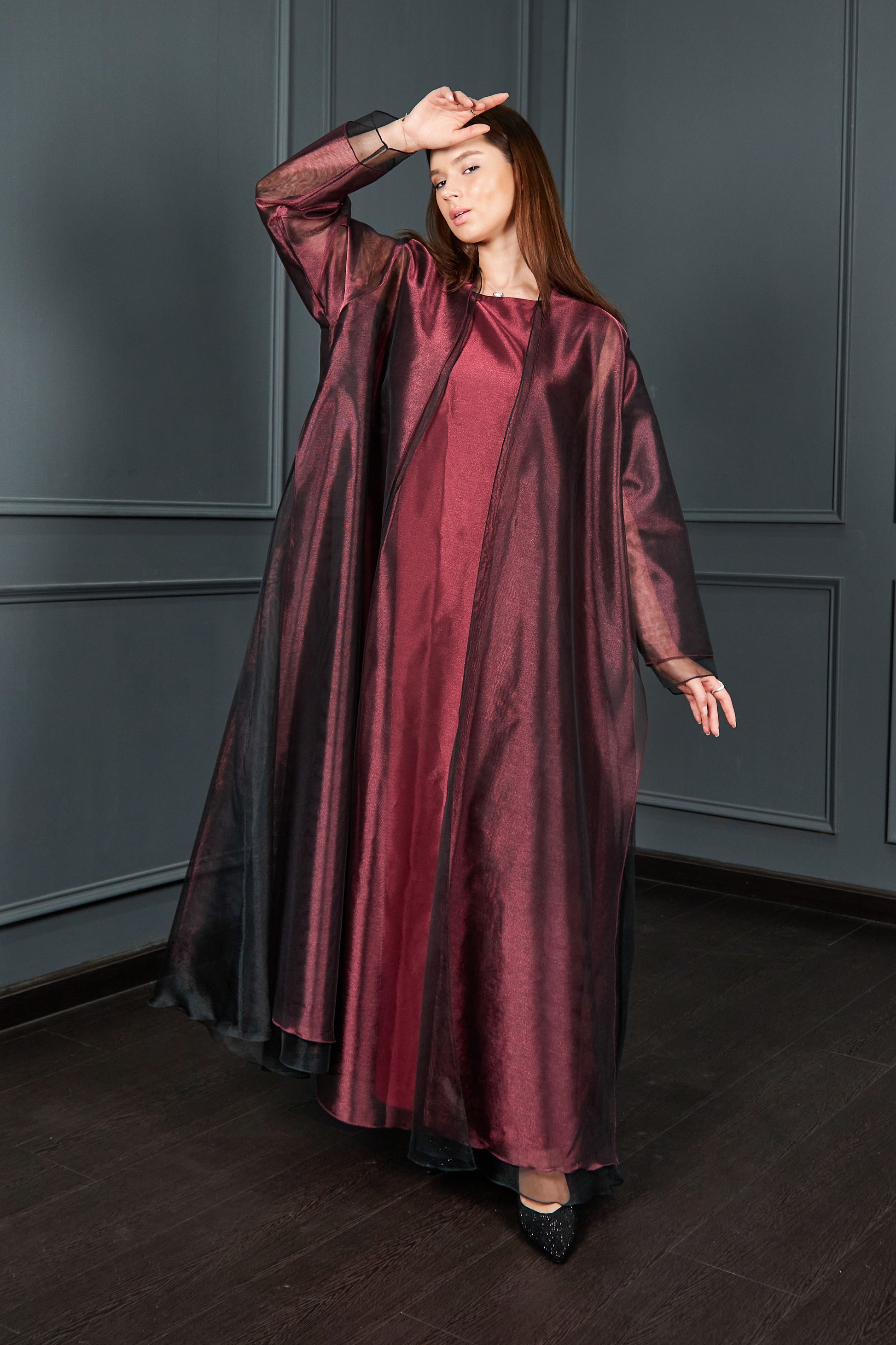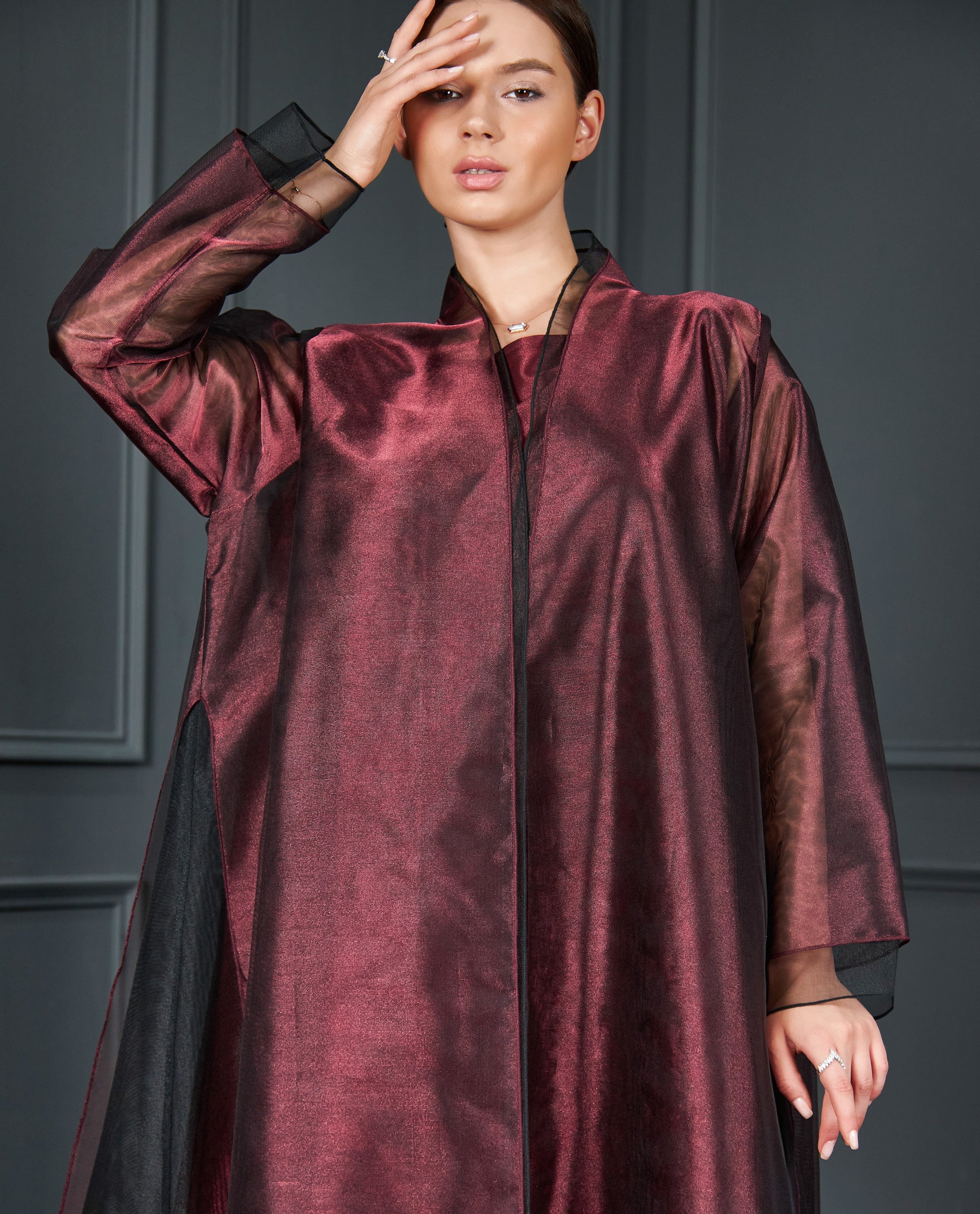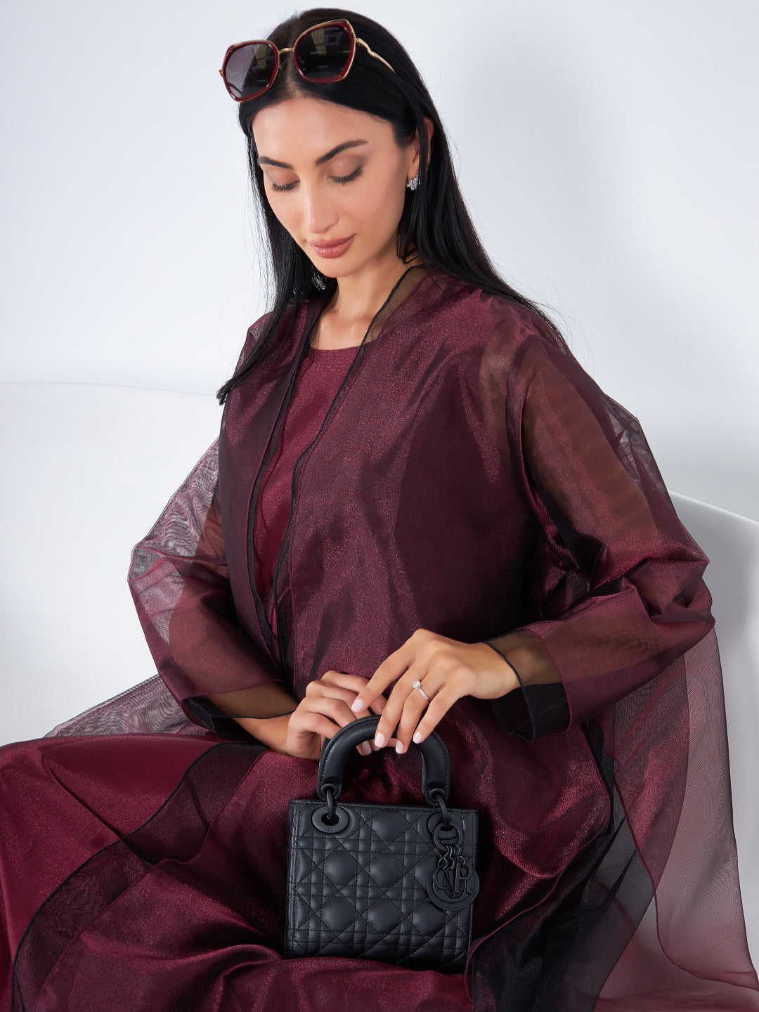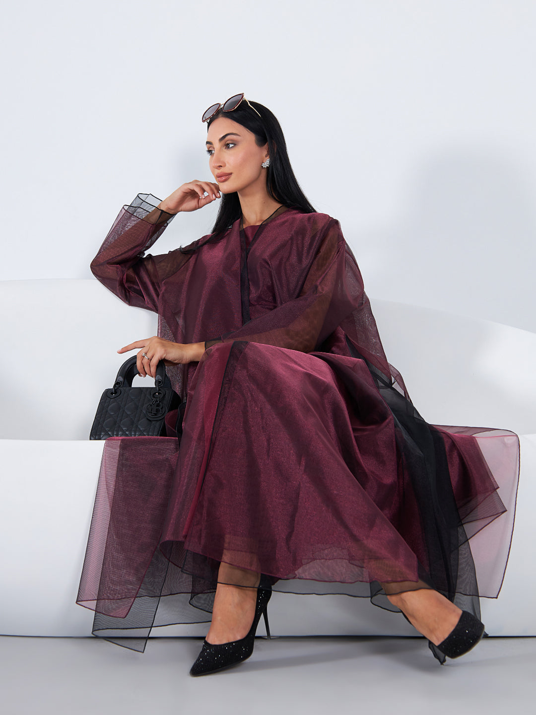 Naomi is a blend of ethereal femininity and sophistication. The A-line double-layered burgundy and black luxury organza abaya, with inner dress motif, gives a dramatic appeal.