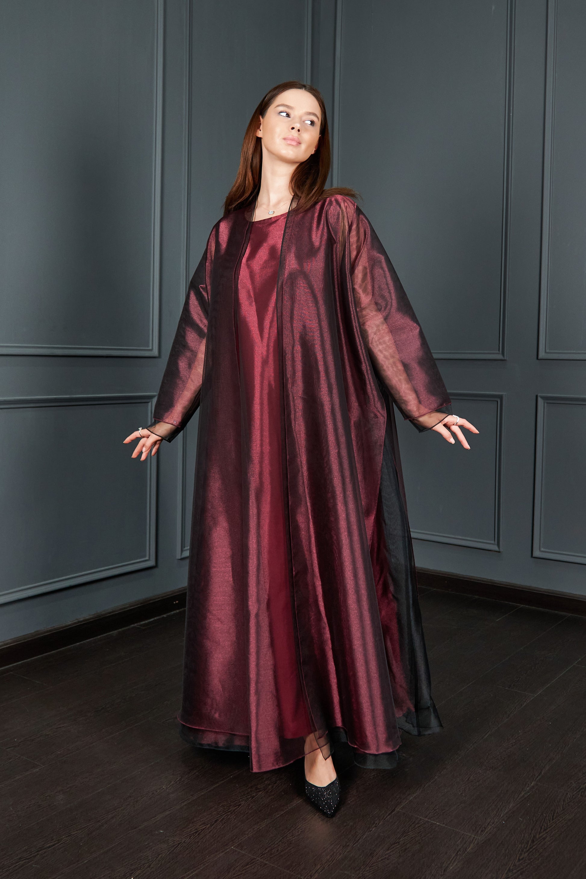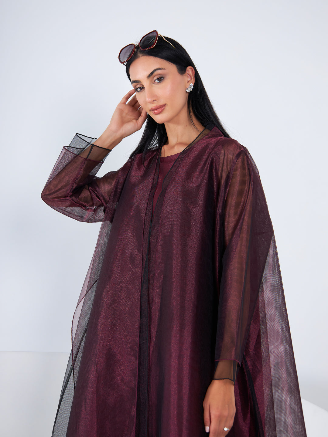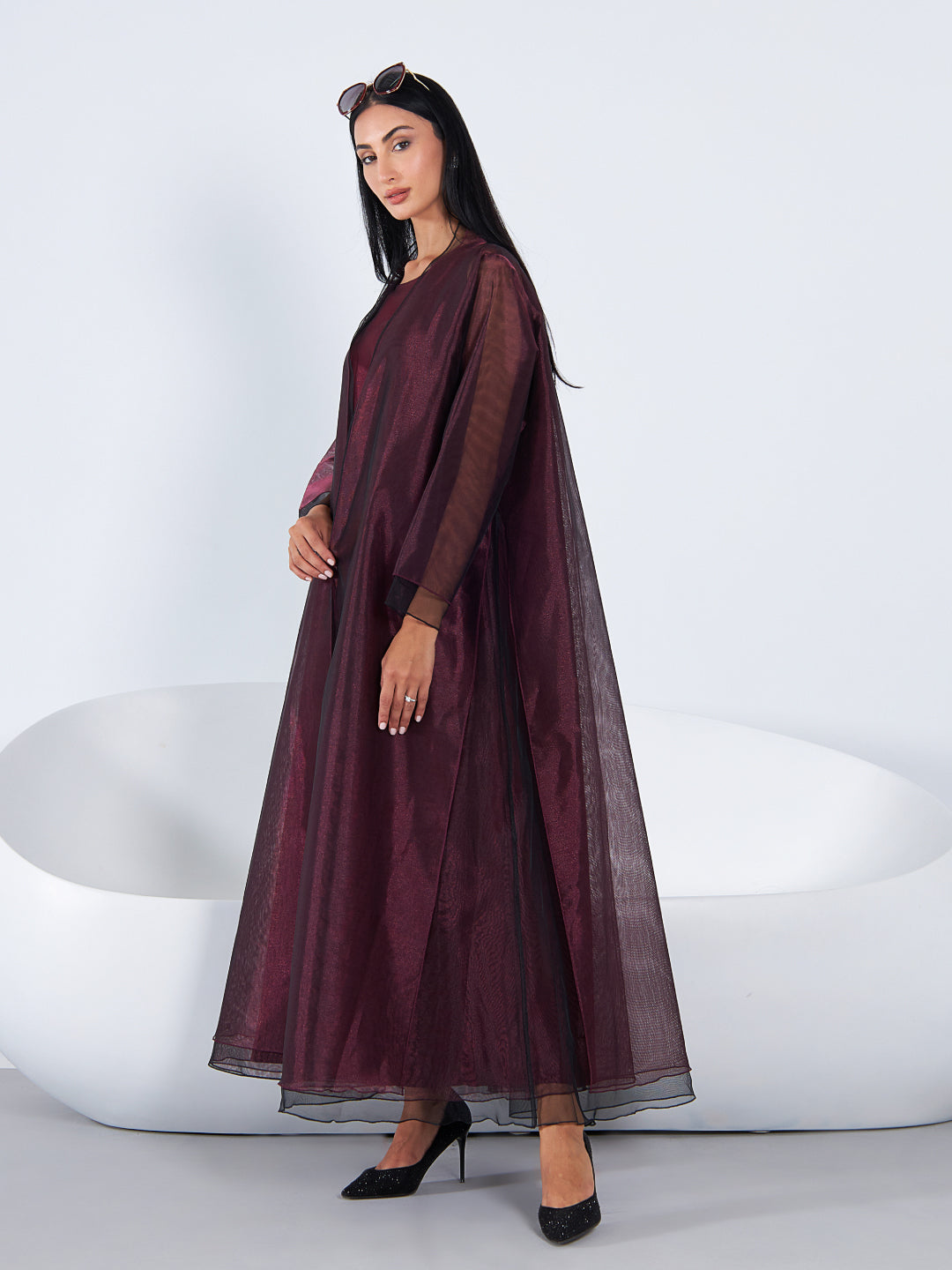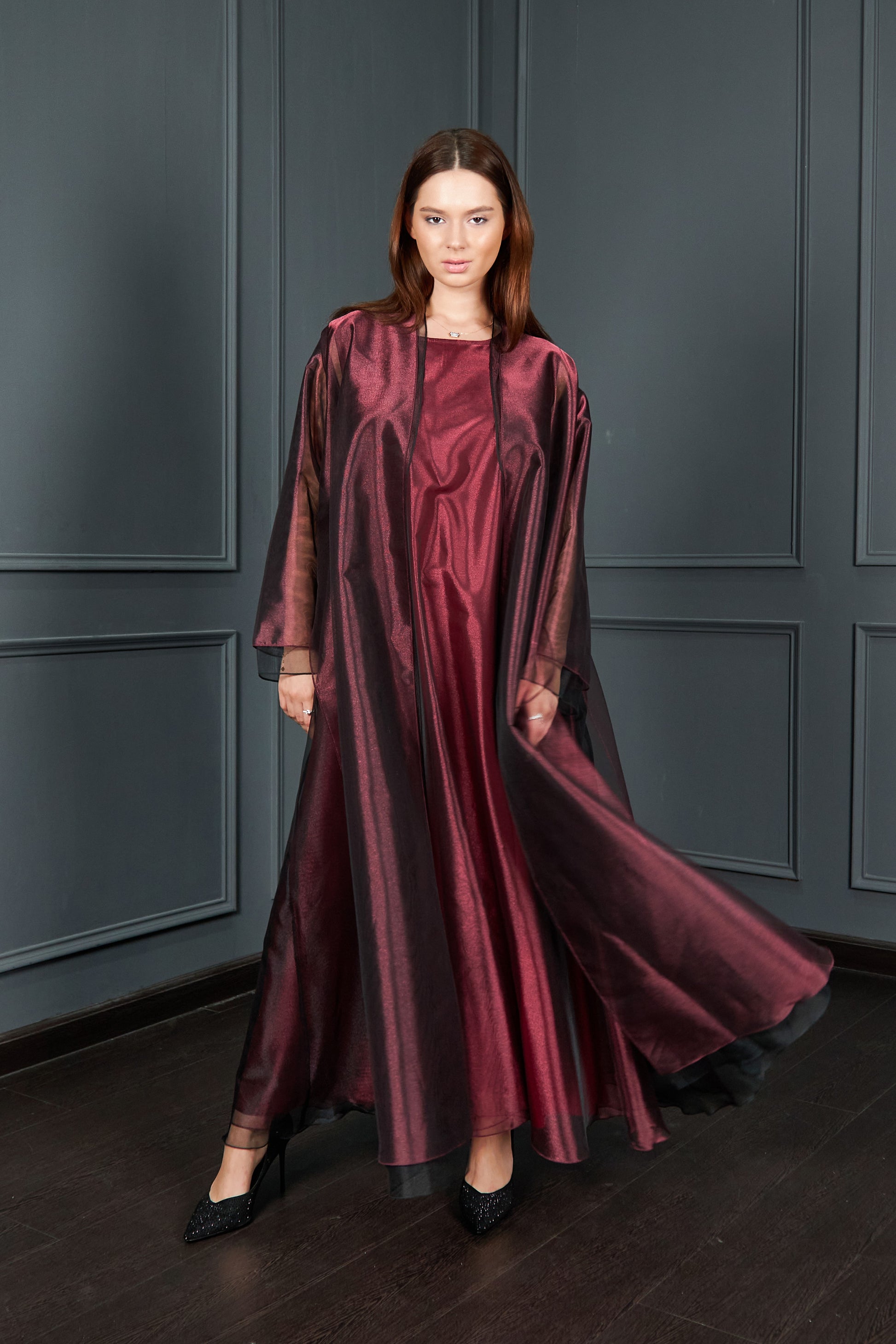 Naomi is a blend of ethereal femininity and sophistication. The A-line double-layered burgundy and black luxury organza abaya, with inner dress motif, gives a dramatic appeal.