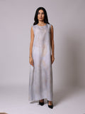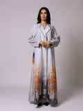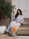 طقم قطعتين فستان مع عباية من قماش اللينن المخلوط و مبطنة مرسومة بطباعة يدوية عليه