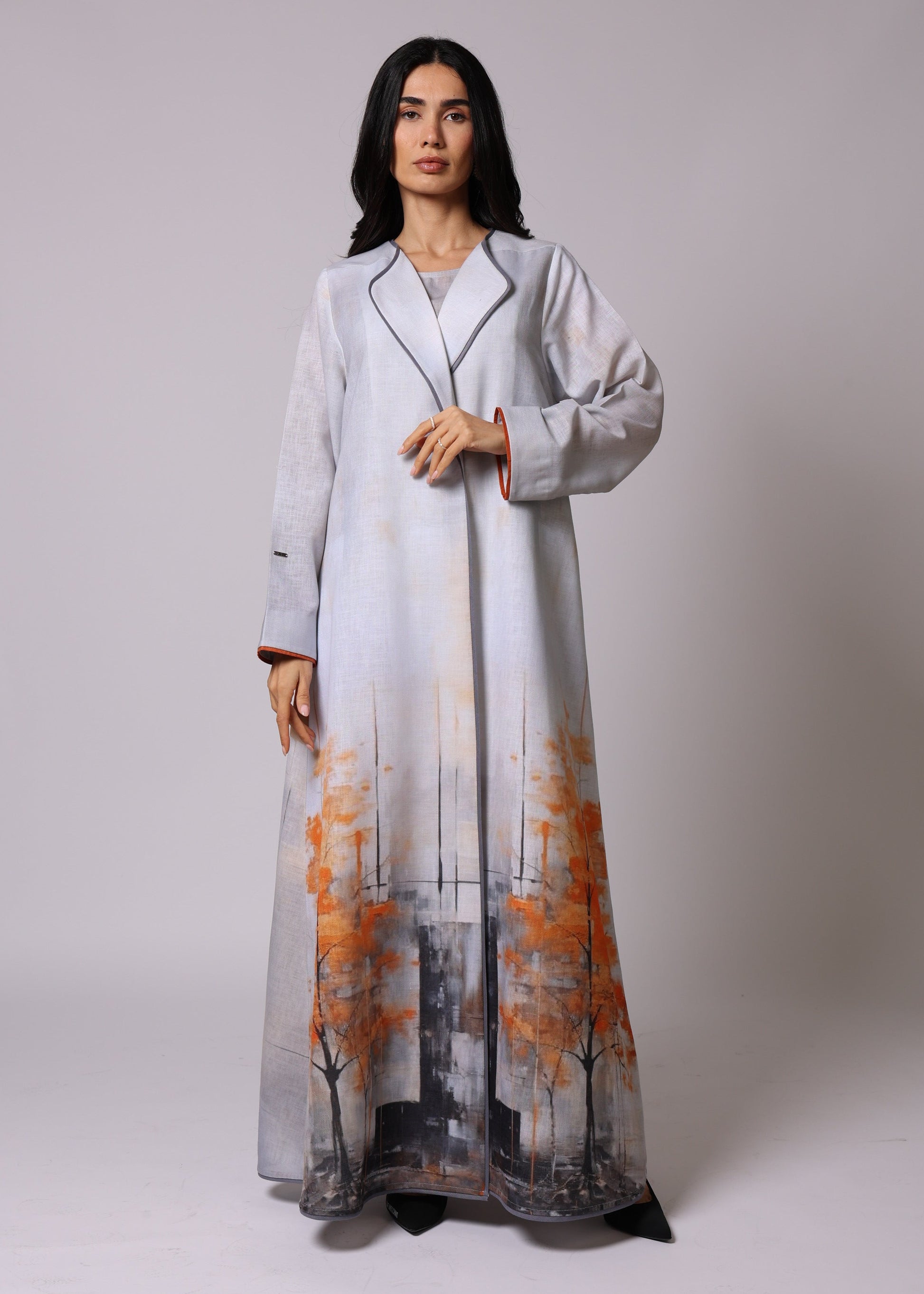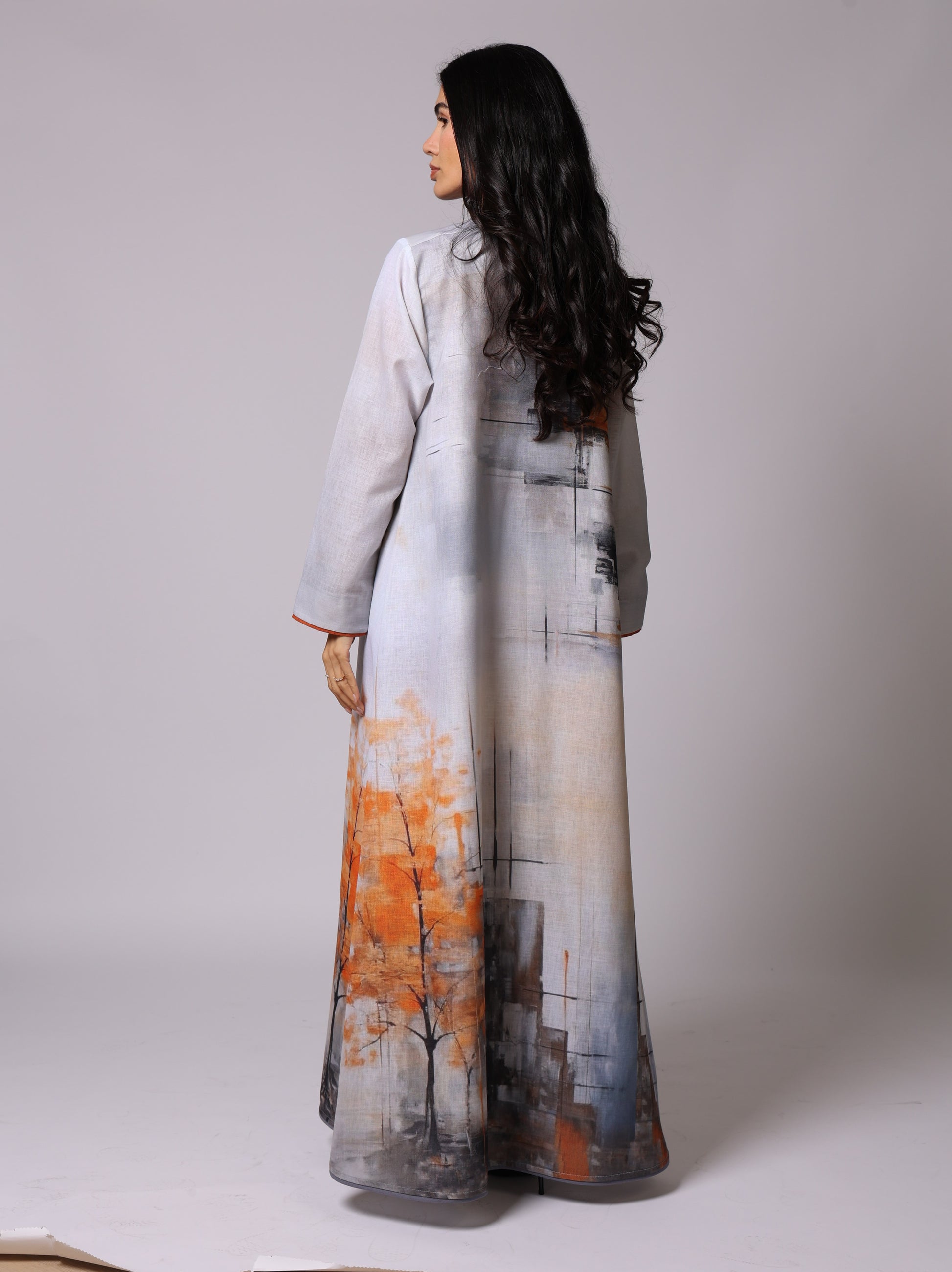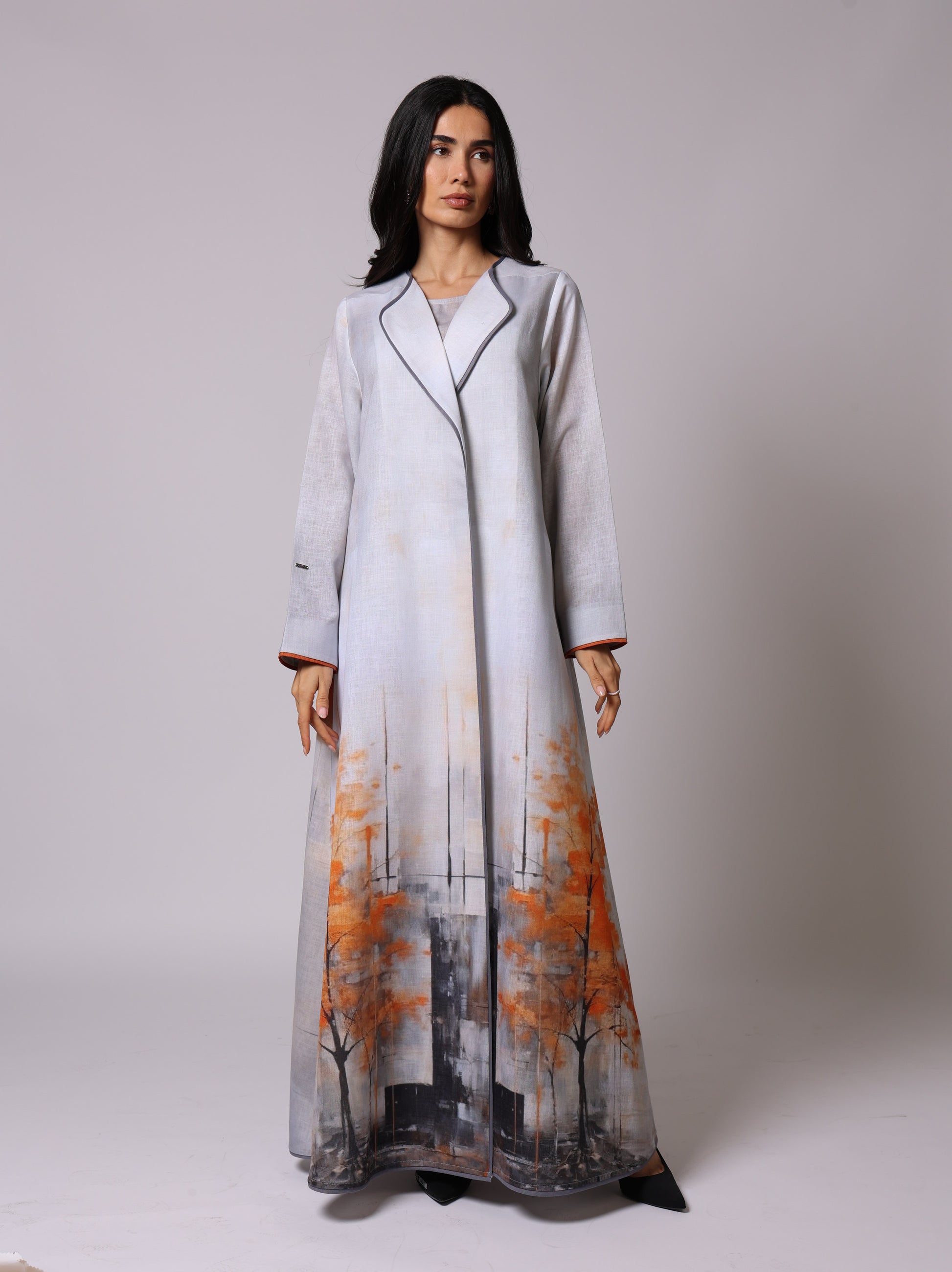 A luxurious A Line cut Abaya Set made of fabric mixed linen and viscose .