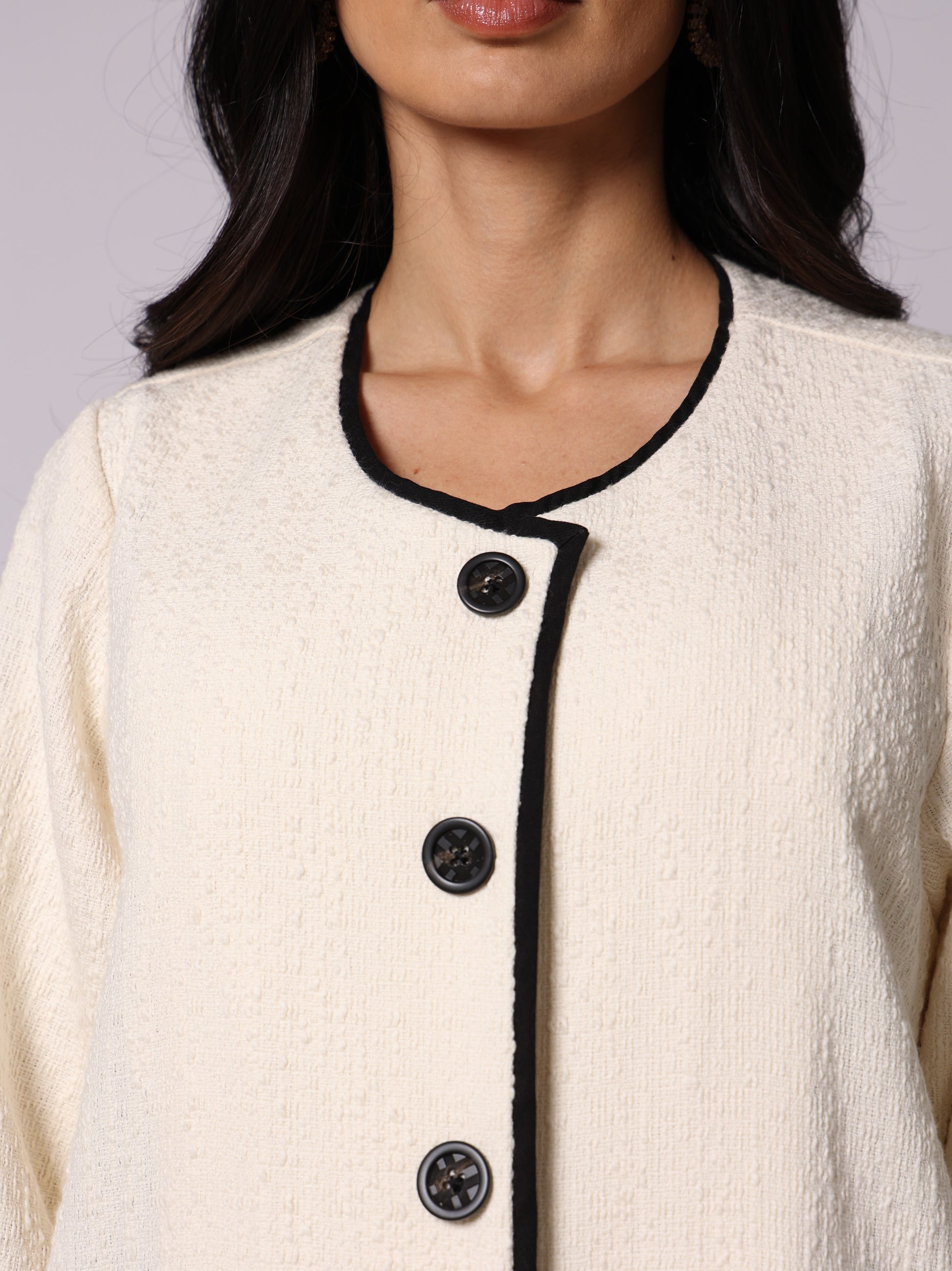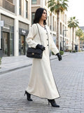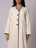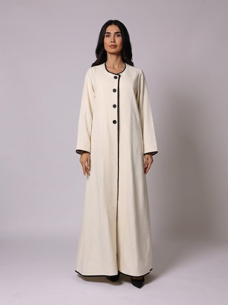 Timeless sophistication defined. Crafted from luxurious off-white Chanel style fabric, this abaya features refined black piping that defines the silhouette, finished with organic wooden buttons