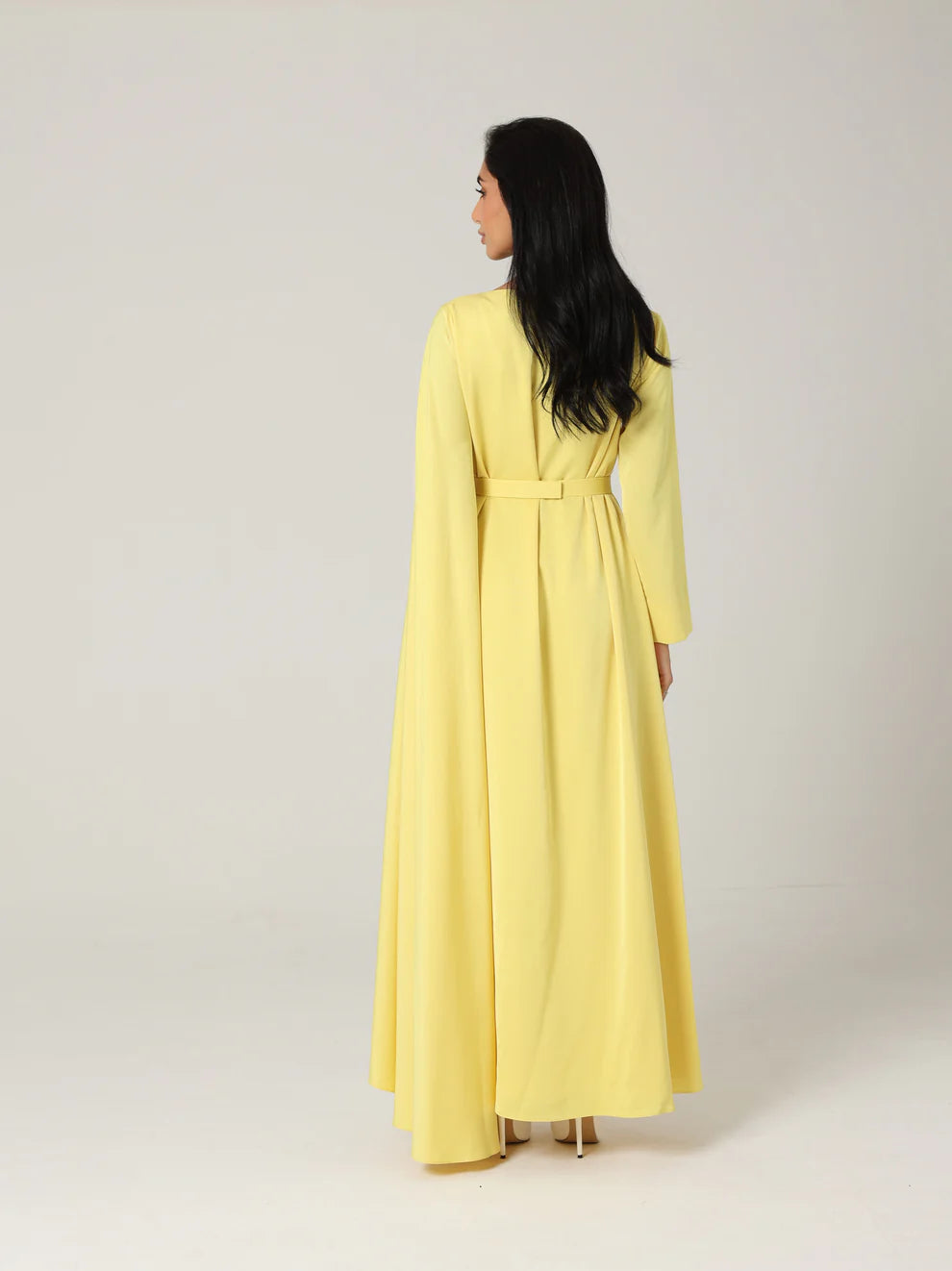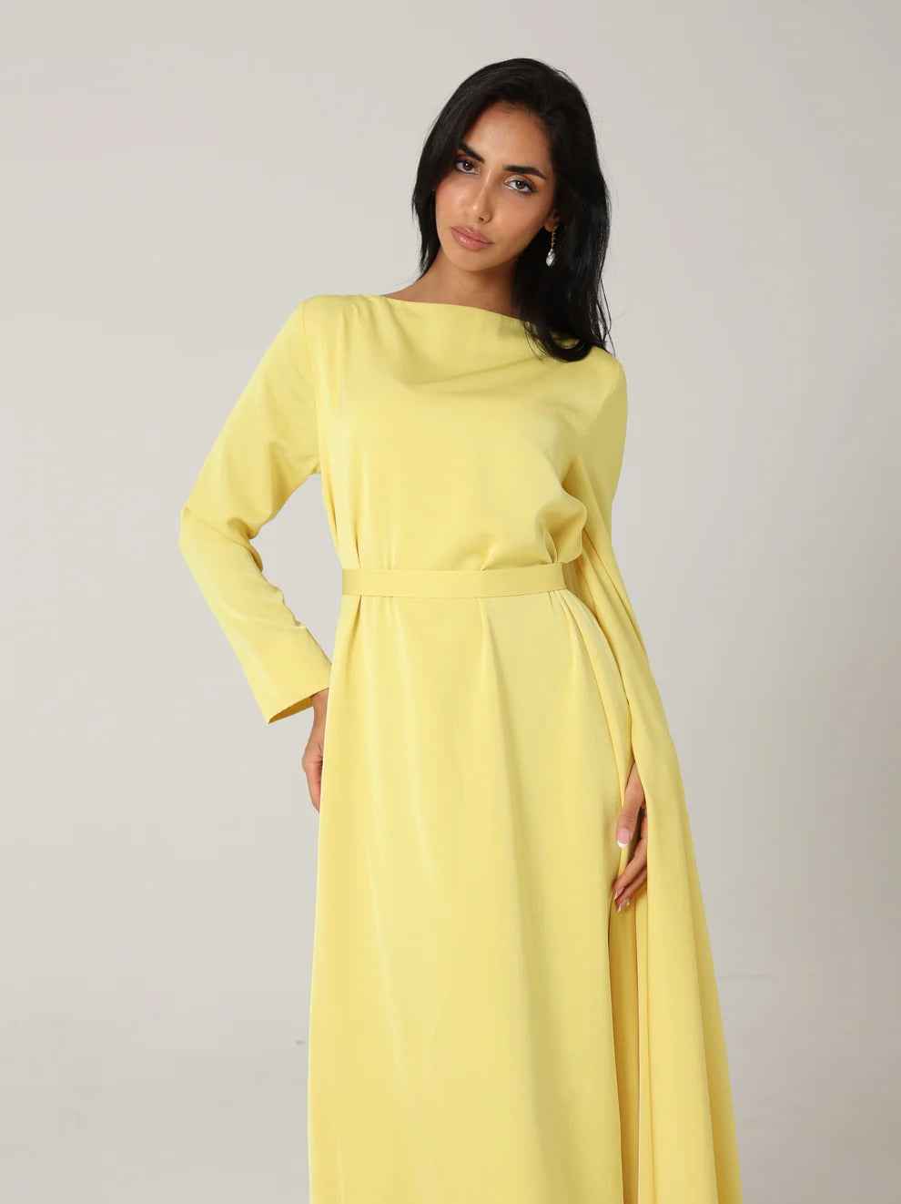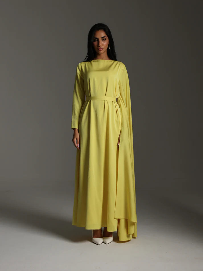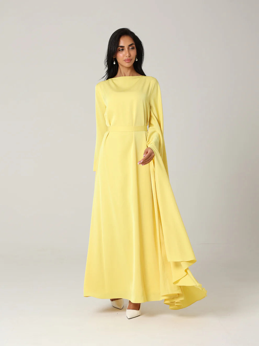 الأكمام الطويلة، وأحد الجانبين بتصميم واسع، منسدل تضفي حركة أنيقة تنسجم مع التنورة الانسيابية التي تنسدل بسلاسة حتى الأرض.