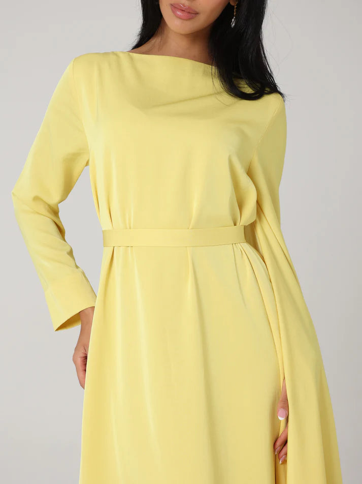 The dress features a soft and flowy silhouette, with a round neckline for a touch of sophistication. The long sleeves, paired with one wide, draped side, add an elegant movement that complements the flowing skirt as it gracefully cascades to the floor.
