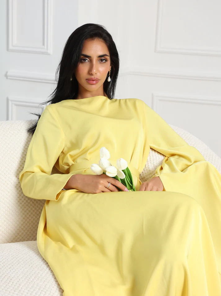 يتميز الفستان بقصة ناعمة وانسيابية، مع ياقة دائرية