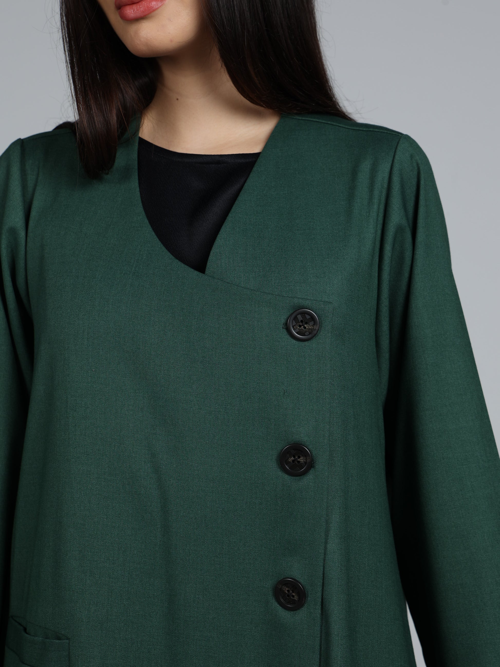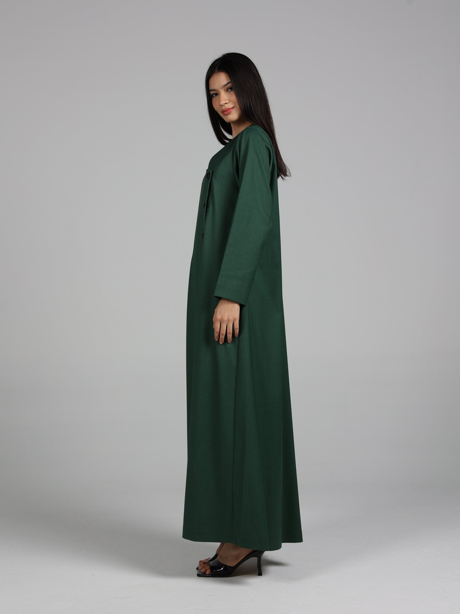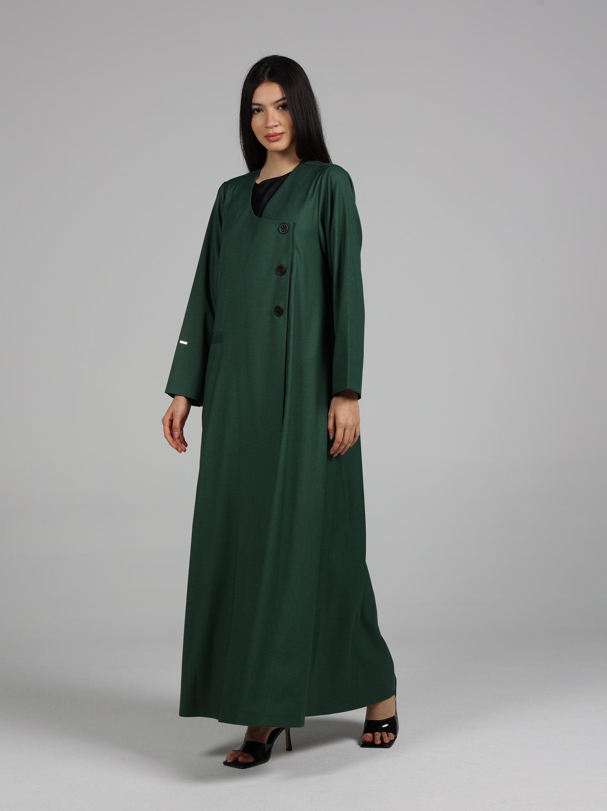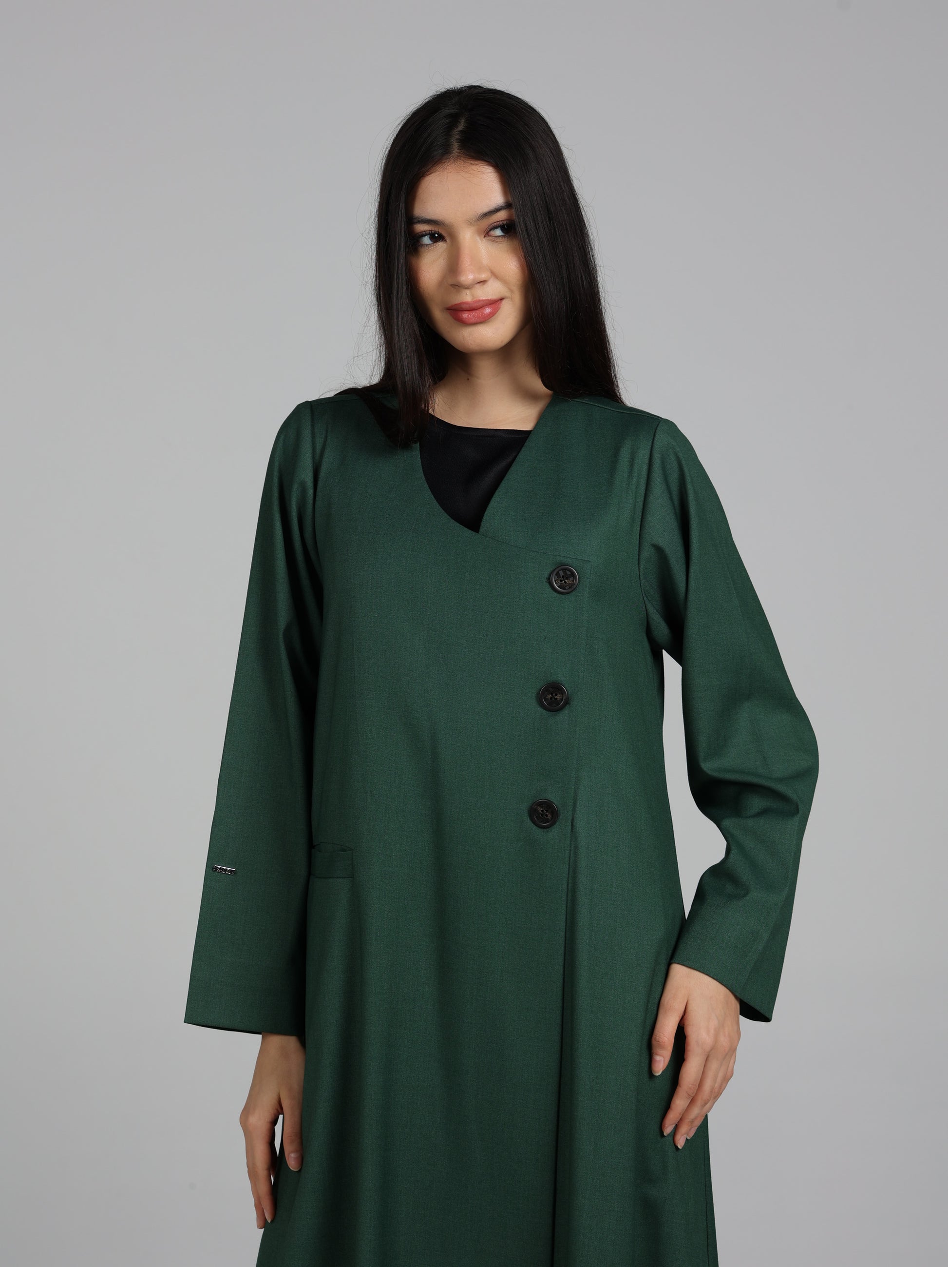 عباية من قماش تويل بإحساس الجوخ ( خريفية ) بلون مميز مع أزرار خشبية