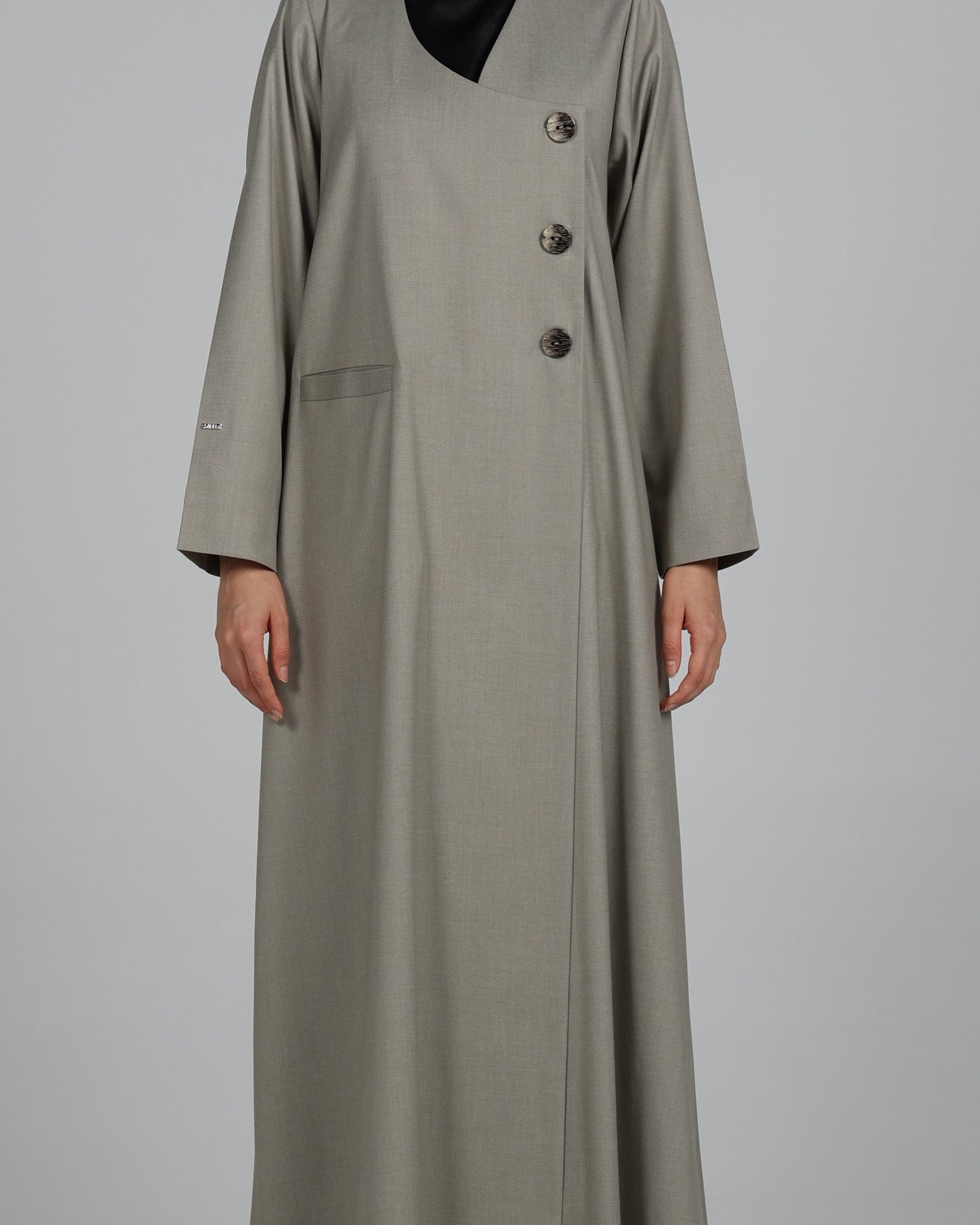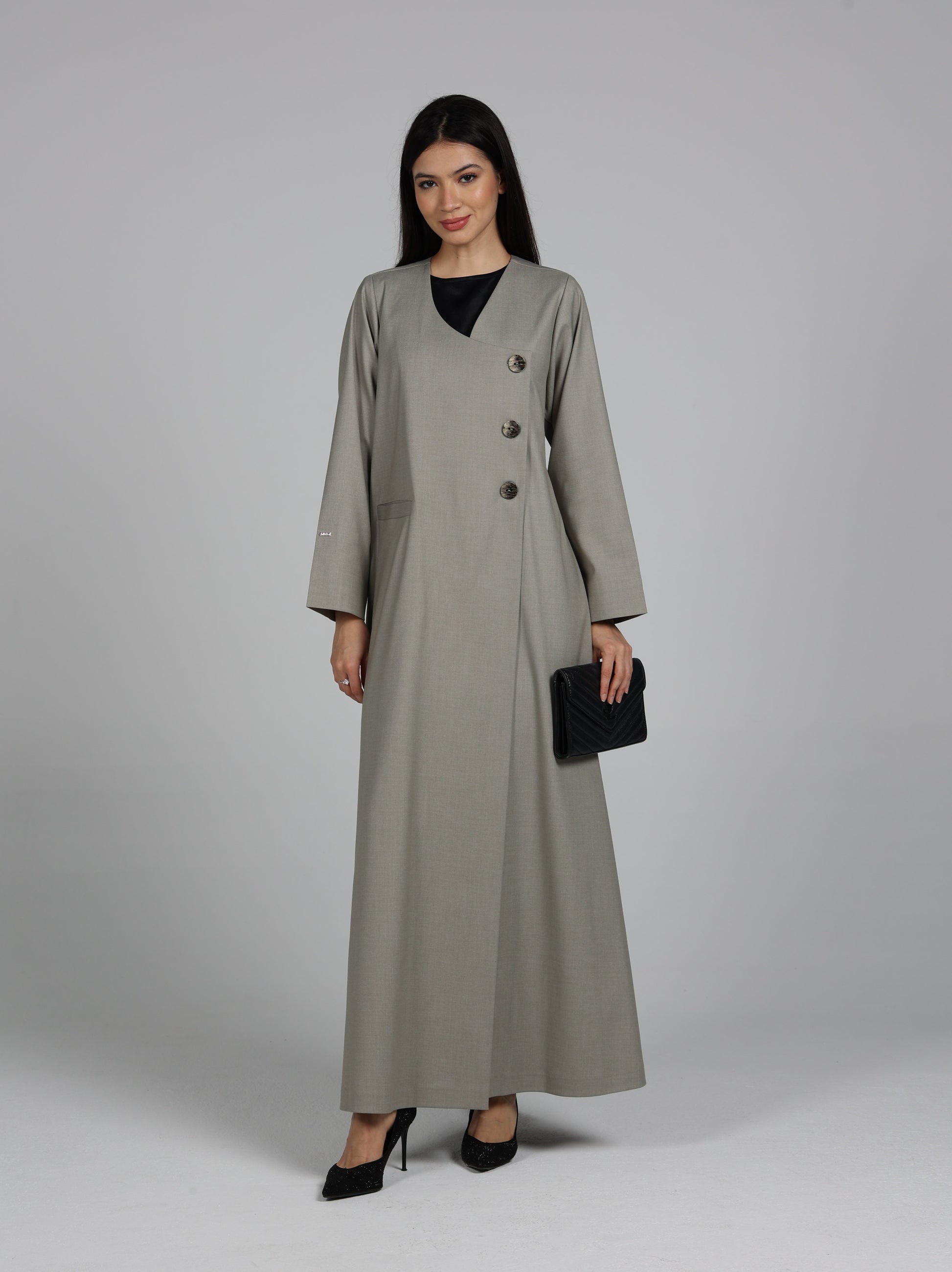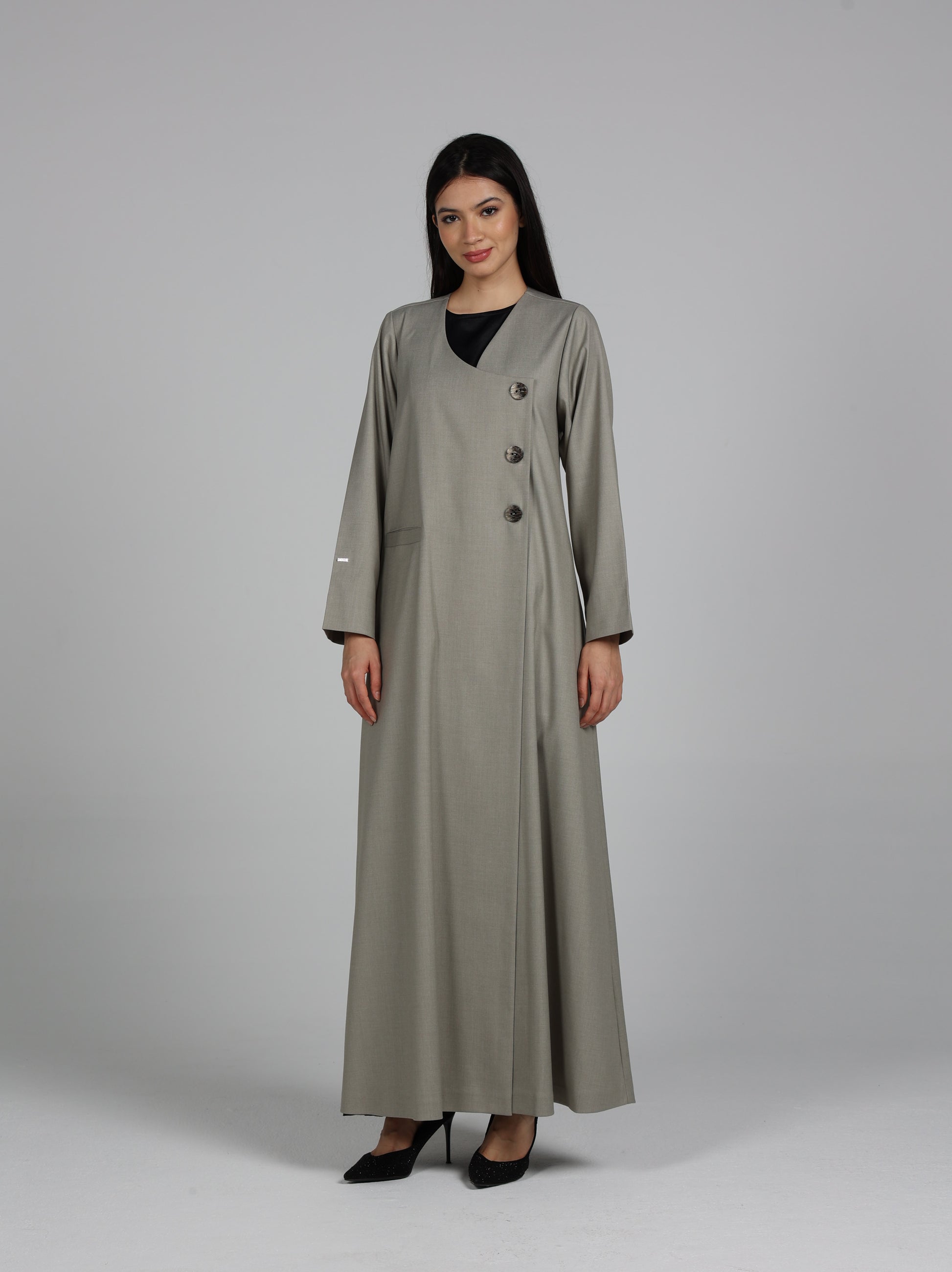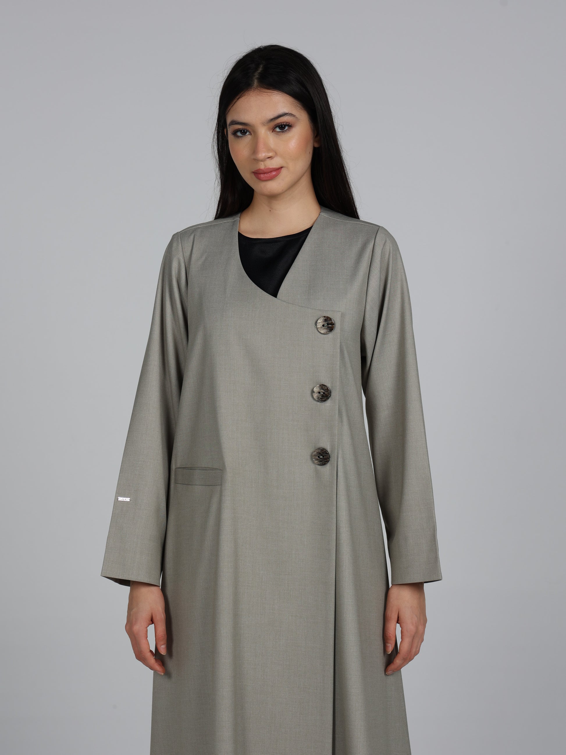 عباية من قماش تويل بإحساس الجوخ ( خريفية ) بلون مميز مع أزرار خشبية