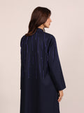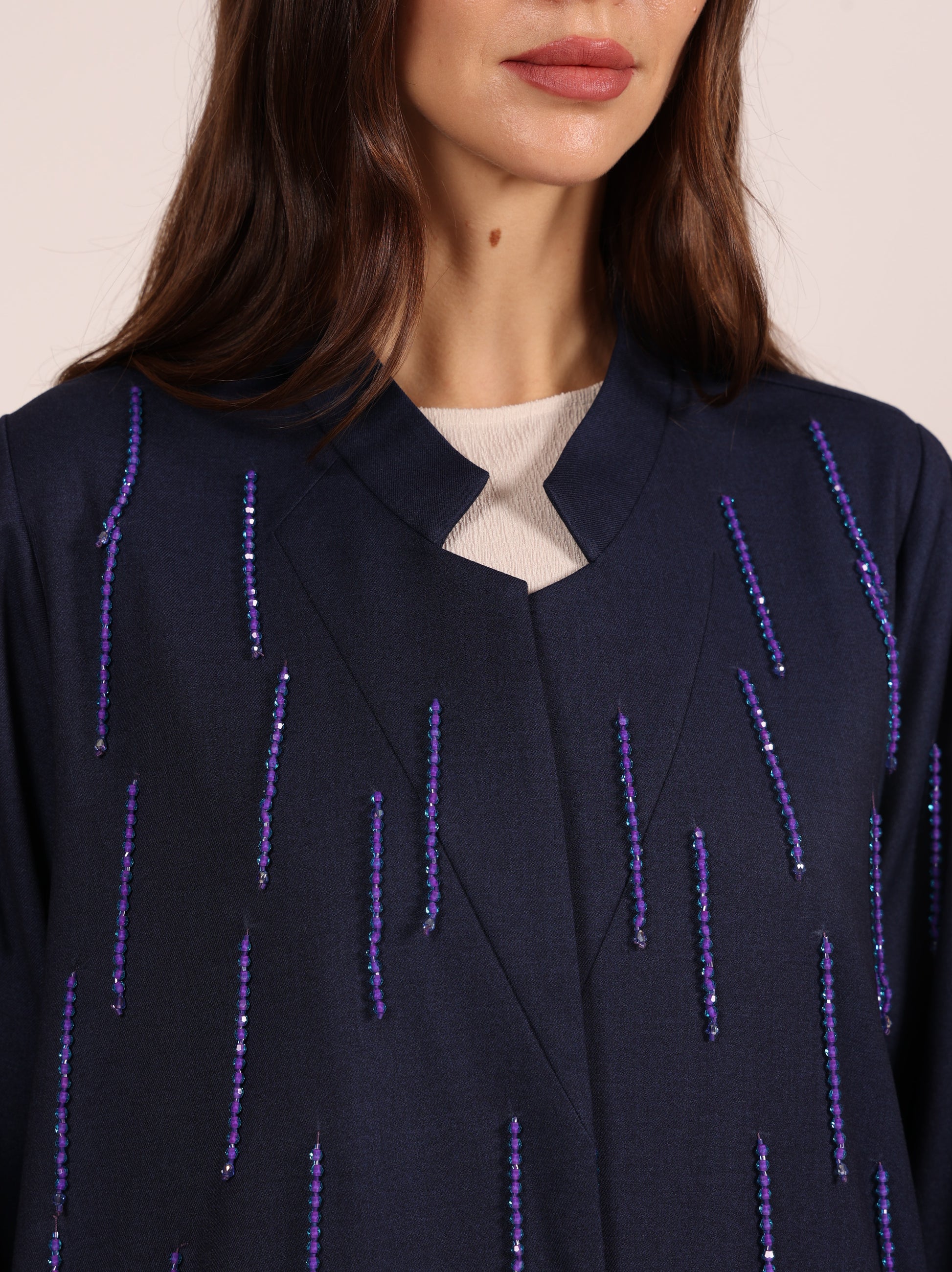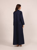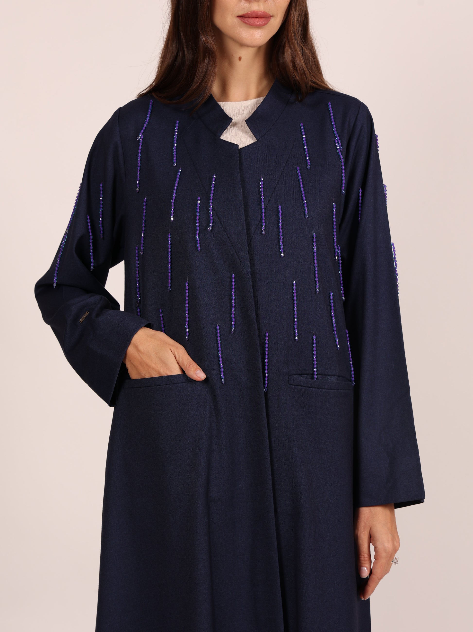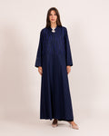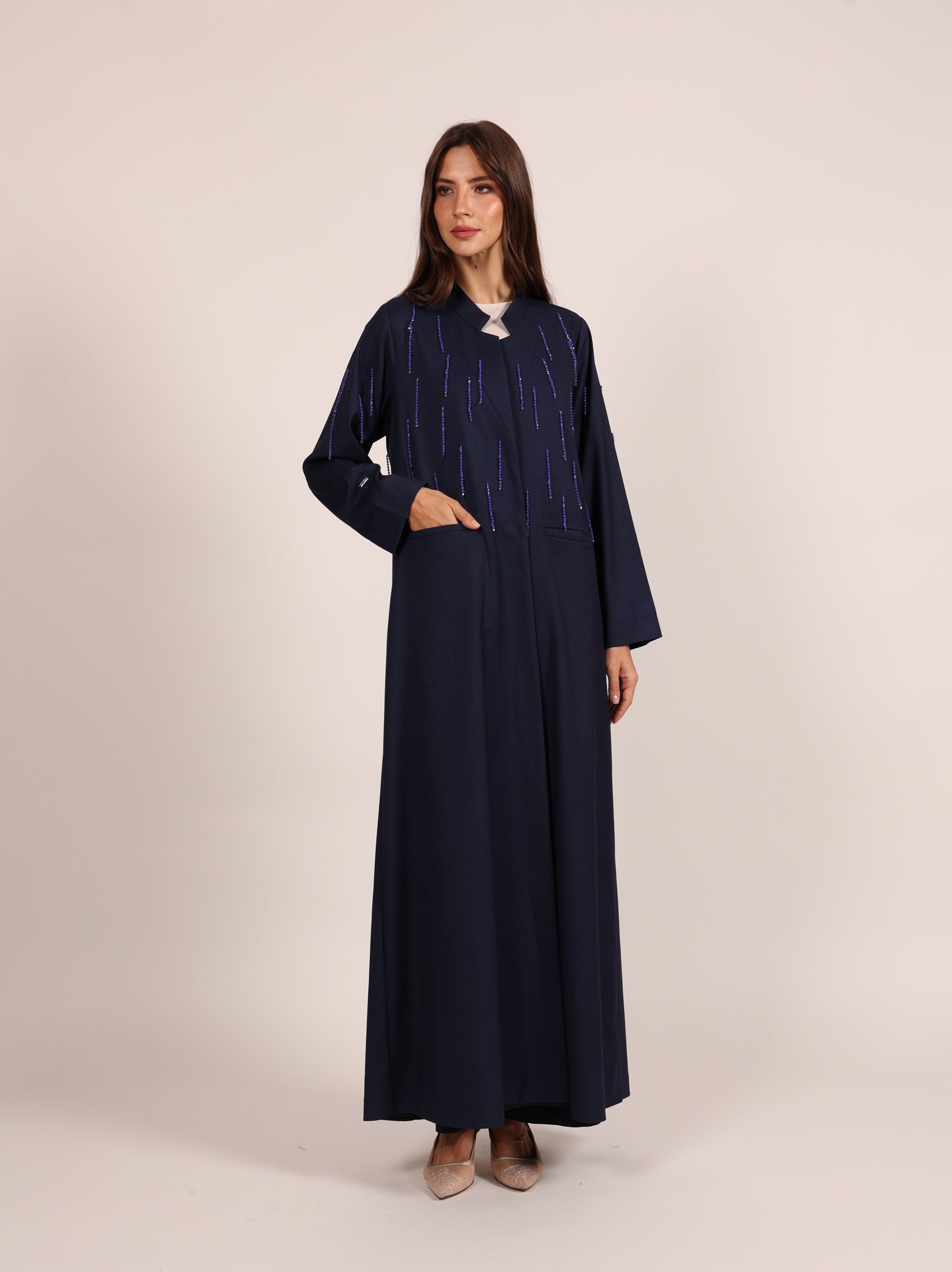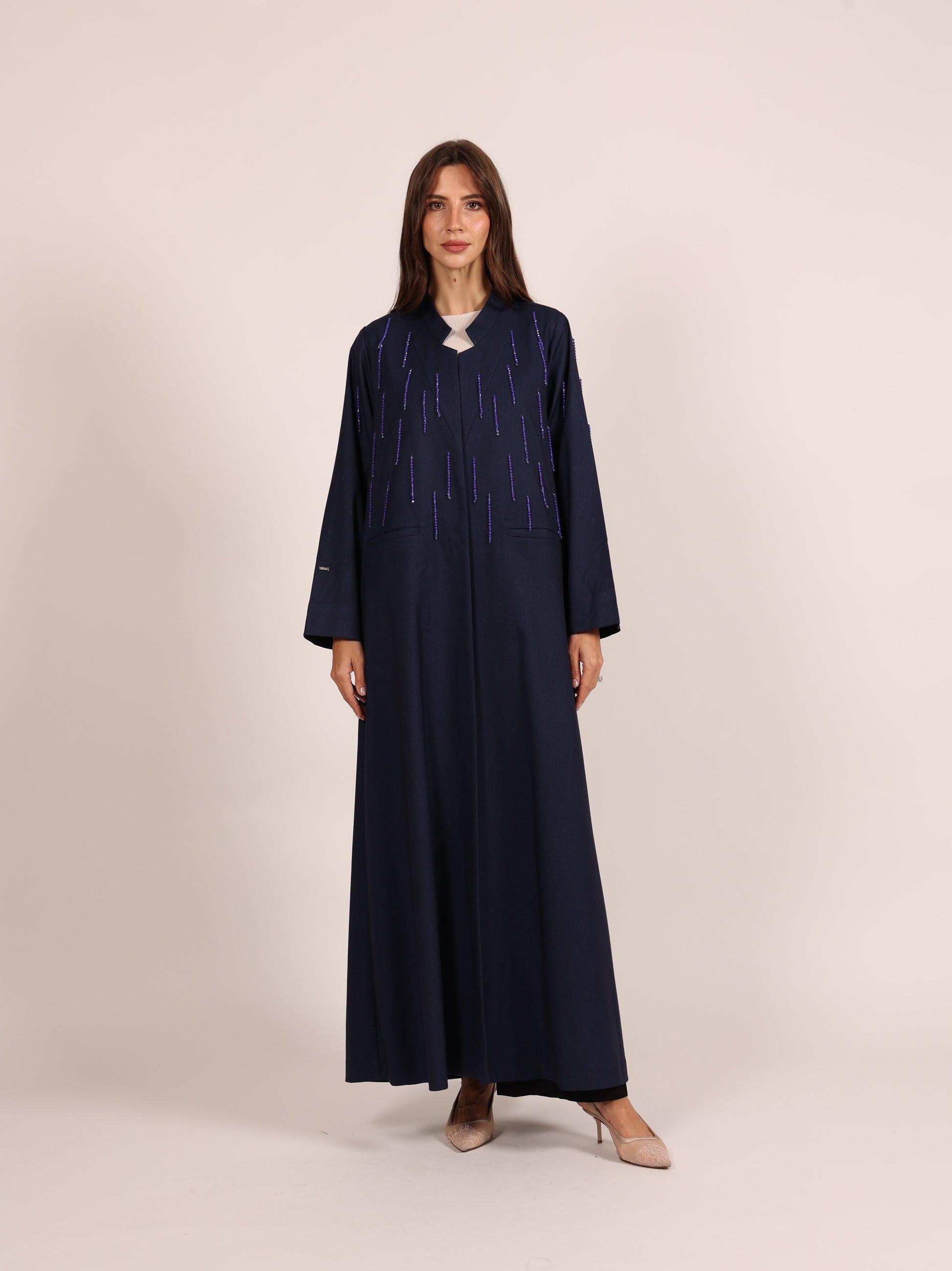 A luxurious abaya crafted from elegant autumn fabric, designed to embody sophistication and seasonal charm. The abaya is adorned with delicate rows of shimmering crystal beads, creating a refined sparkle that enhances its purity and elegance — a perfect blend of timeless luxury and modern detail.